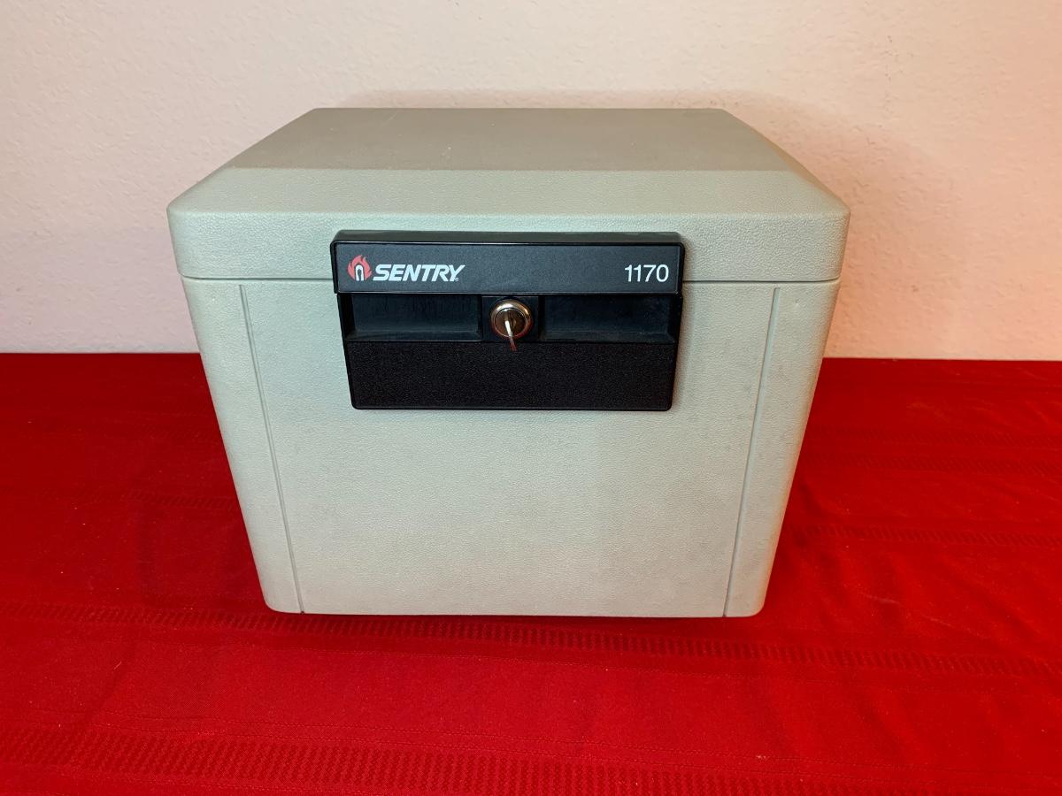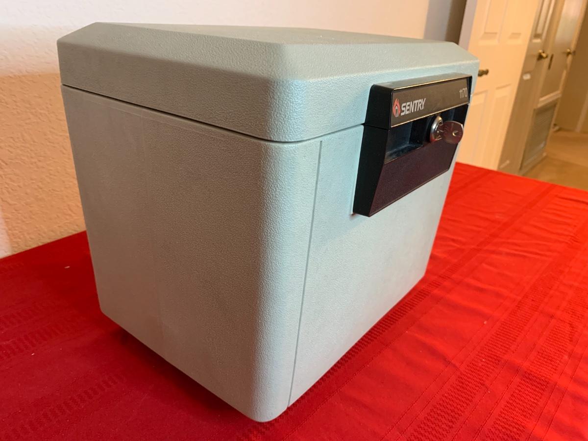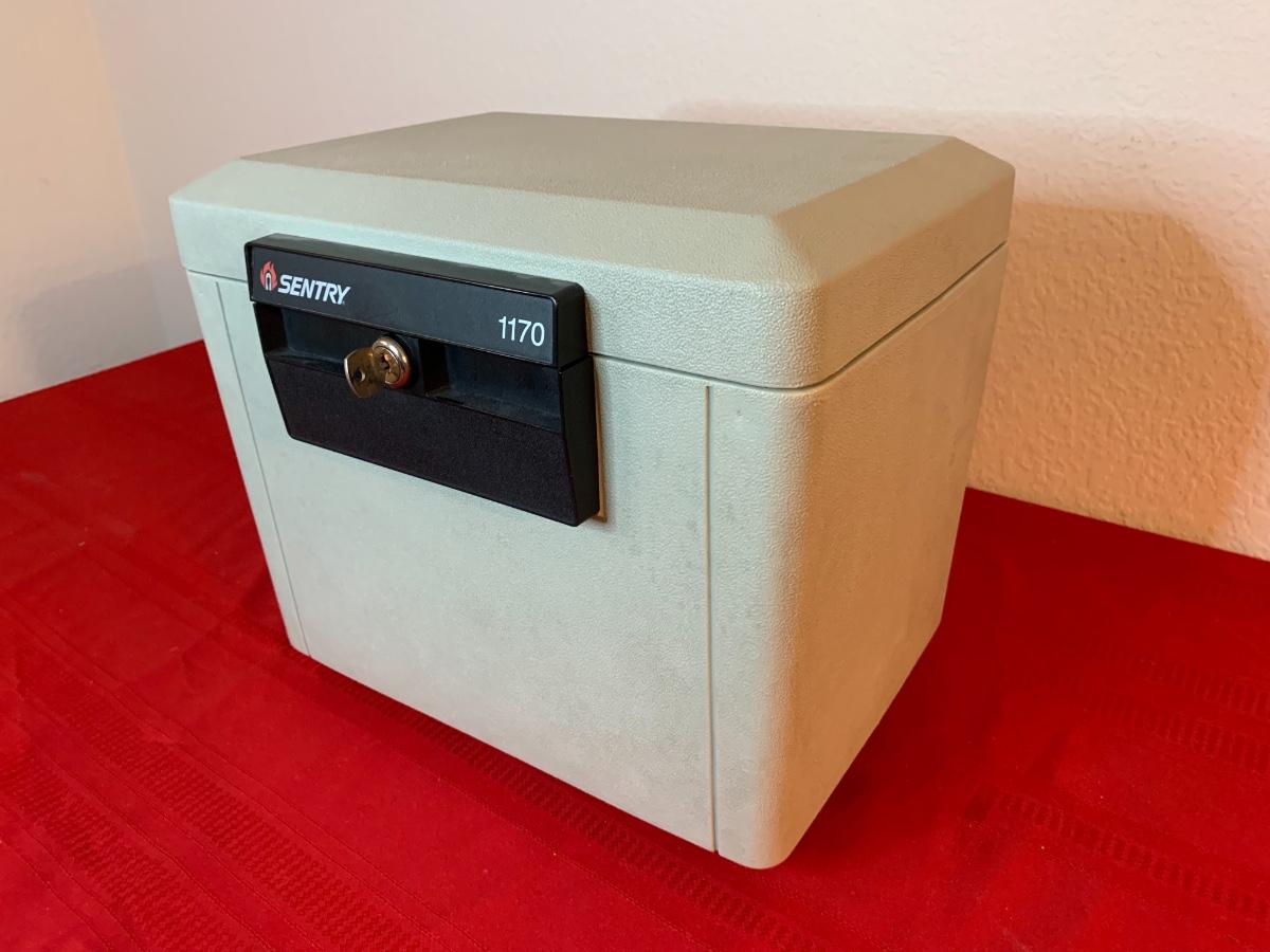 Lot is for a smaller size Sentry 1170 fire safe with key. 14” tall x 15.5” wide x 12” deep
