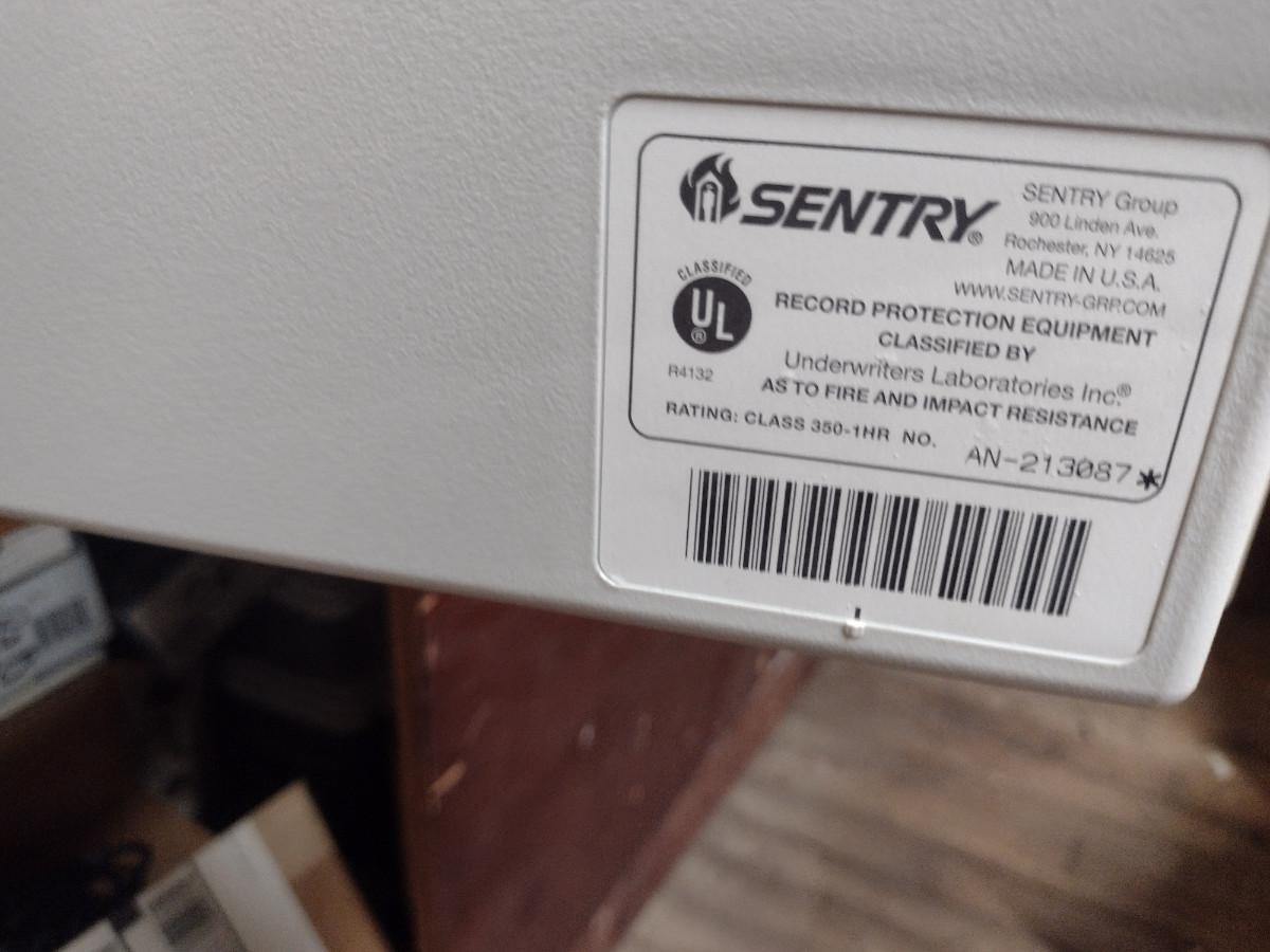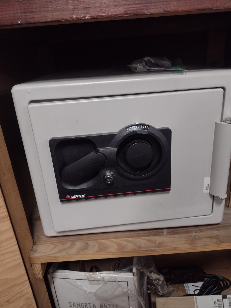 Sentry Safe- Measures Approx 16" x 18" x 14" Tall. Fire and impact resistant. With key and combination.