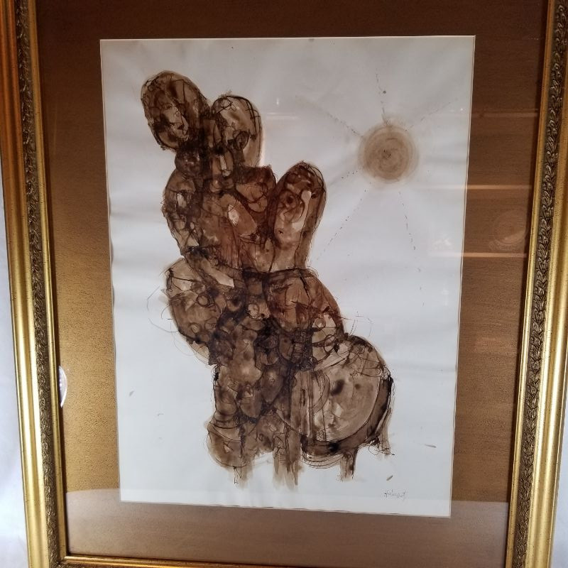 This large, nicely framed Sepia and Ink original is a work of art made by listed artist George Habergritz. Framed size is 12-inches wide X 32-inches tall. Habergritz' art can be found at Wilberforce University in Ohio, the Safad Museum in Isreal and the Jewish Museum in London. Art, frame and glass are in very good condition.