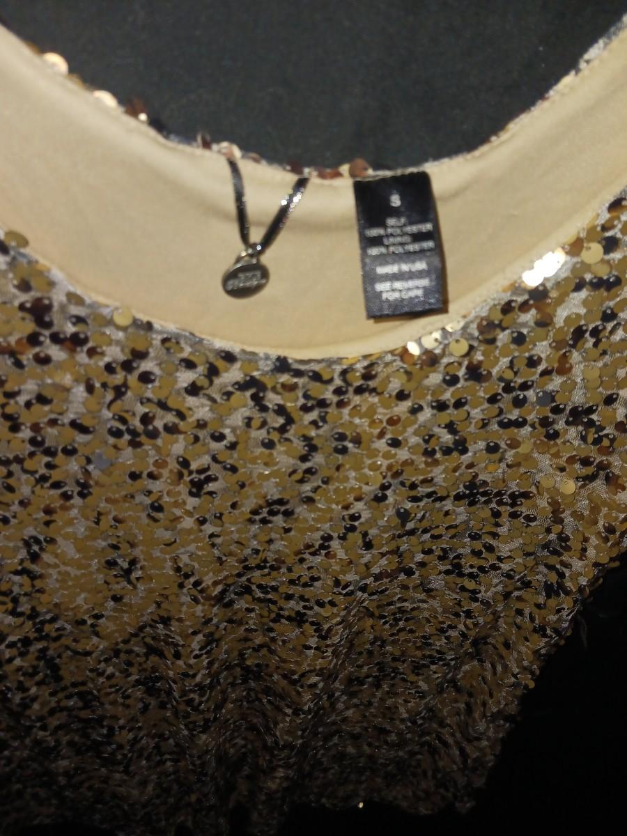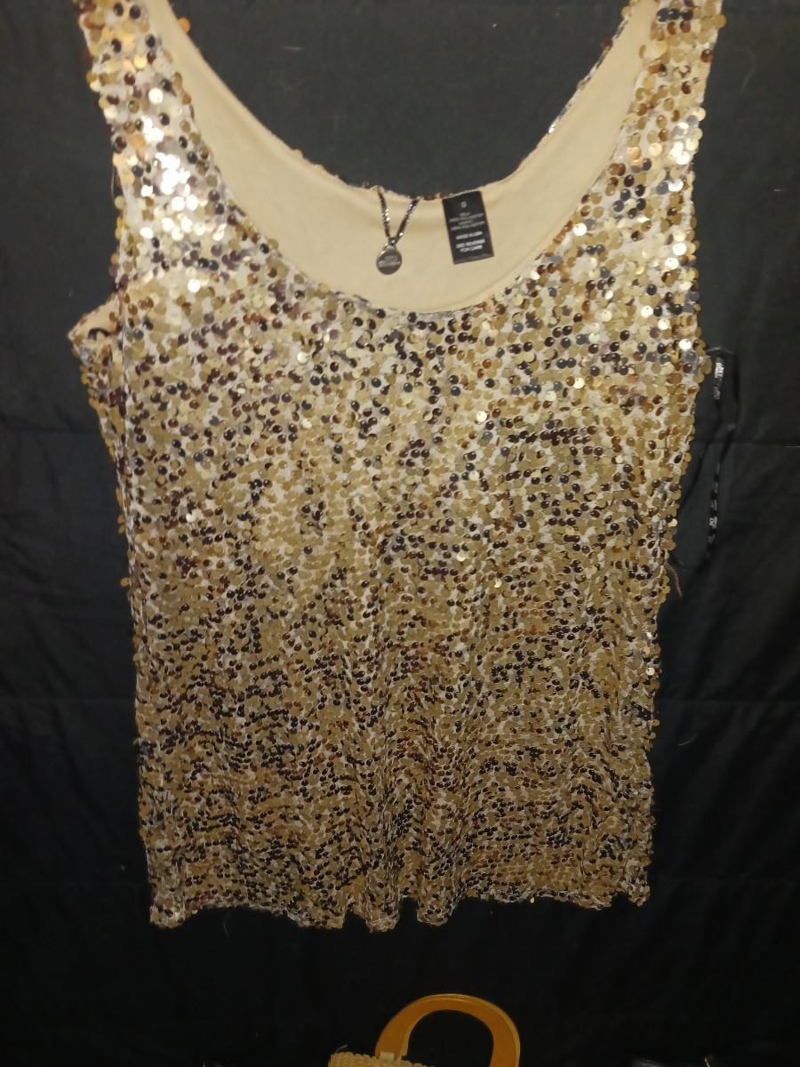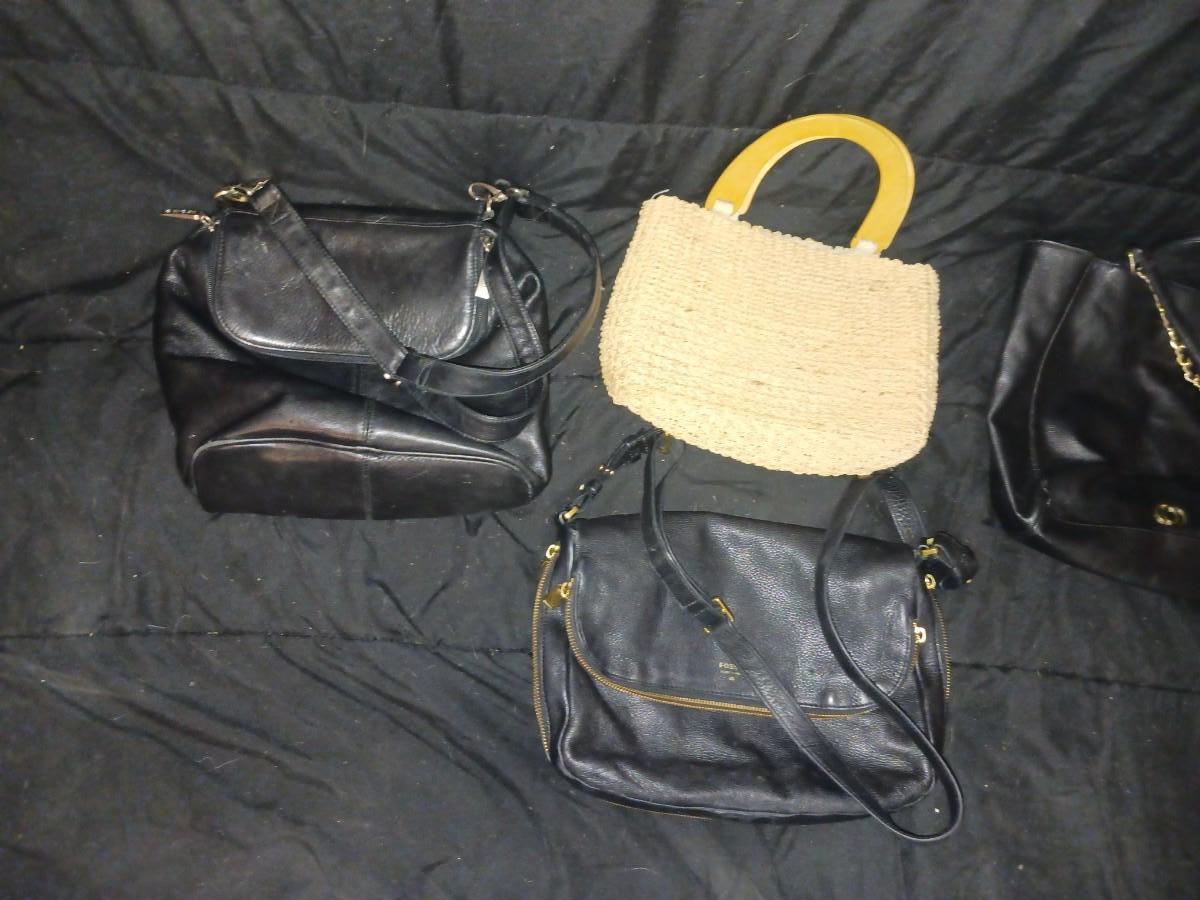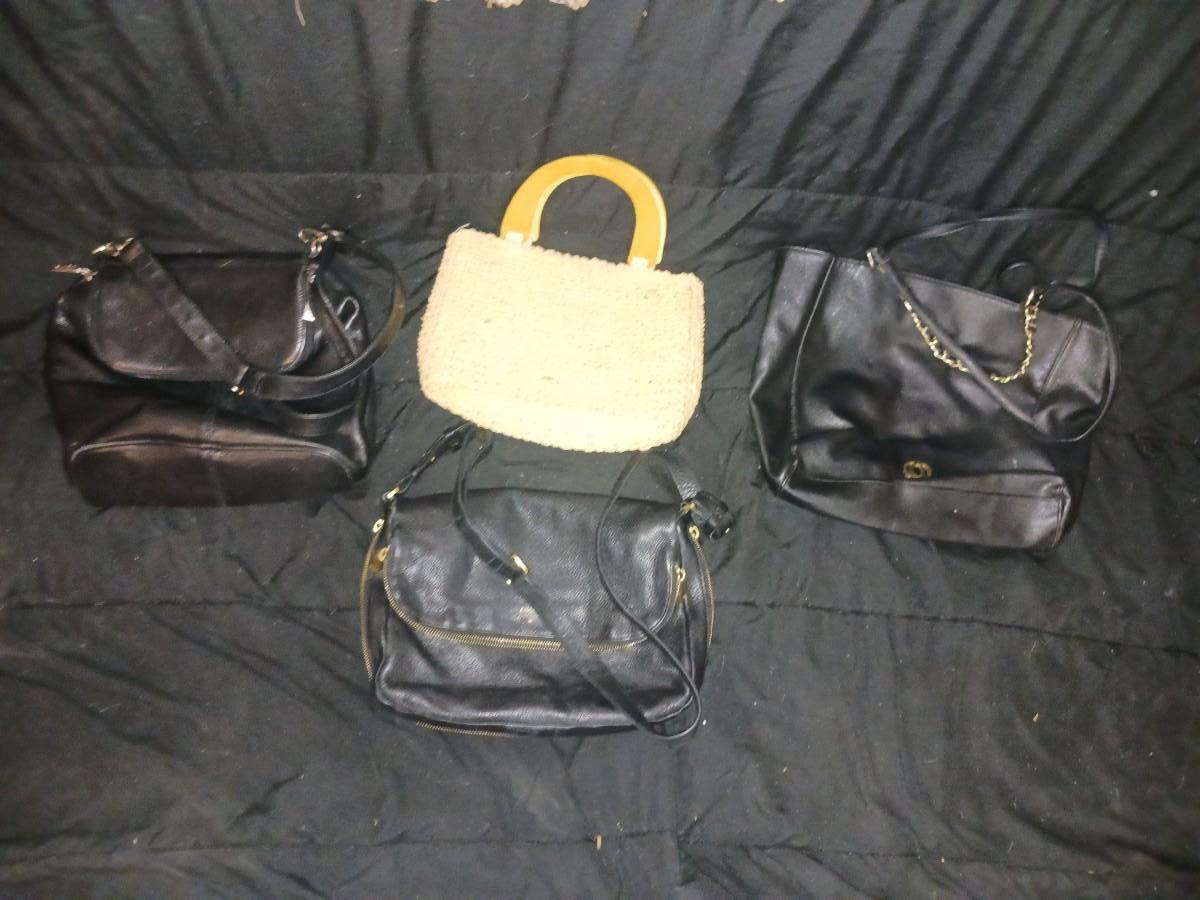 SEQUIN DRESS, THREE BLACK PURSES AND A WOVEN PURSE