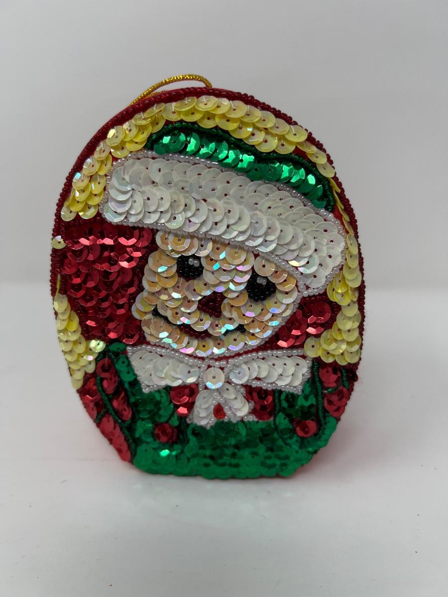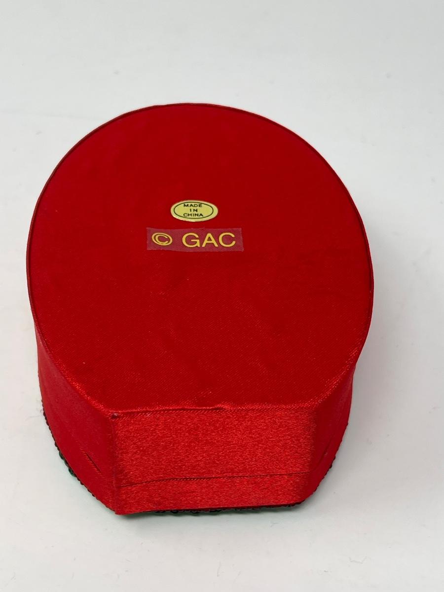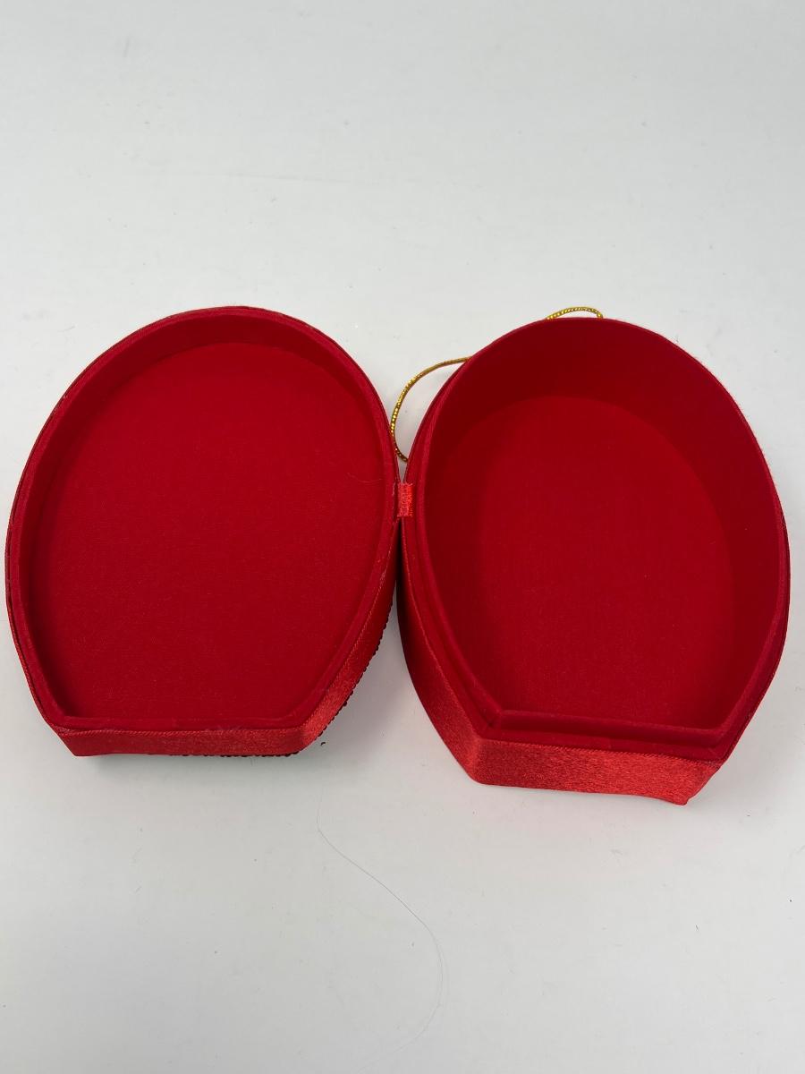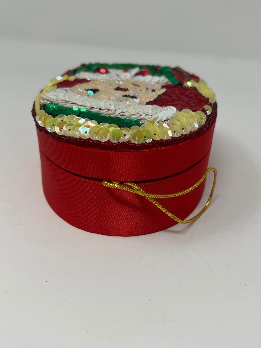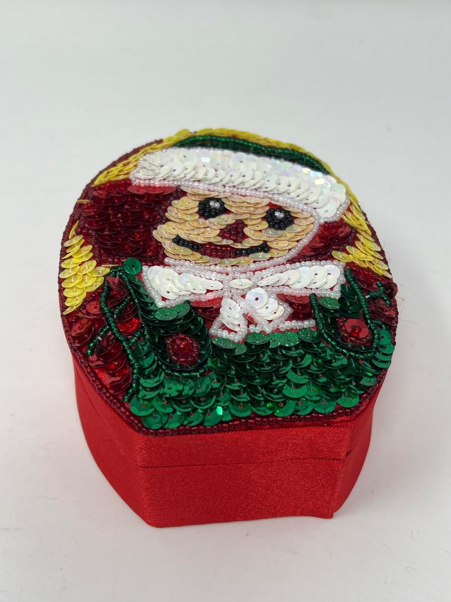 Satin covered box with handmade sequin Raggedy Ann design by GAC. Size: 5.5” x 4” x 2”. Box opens and also has a gold cord hanger.