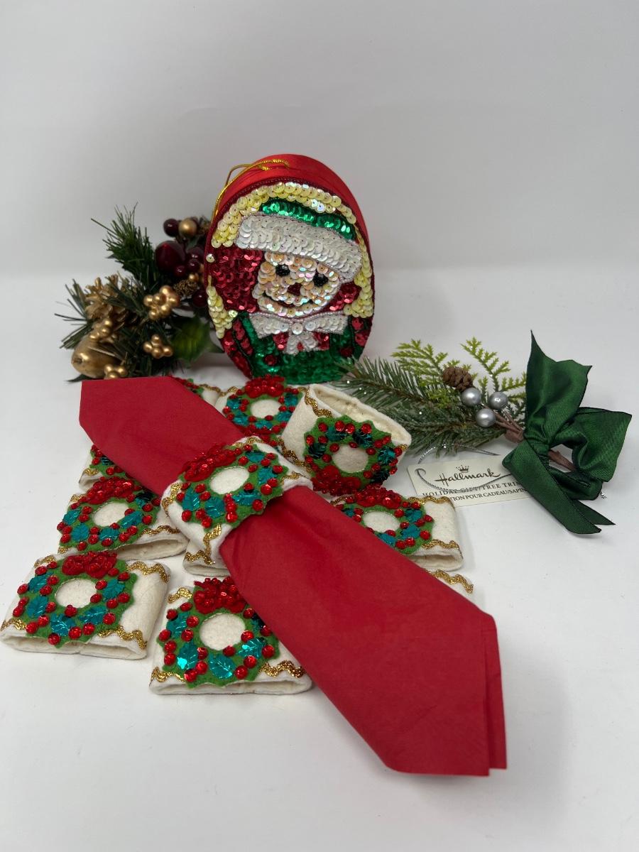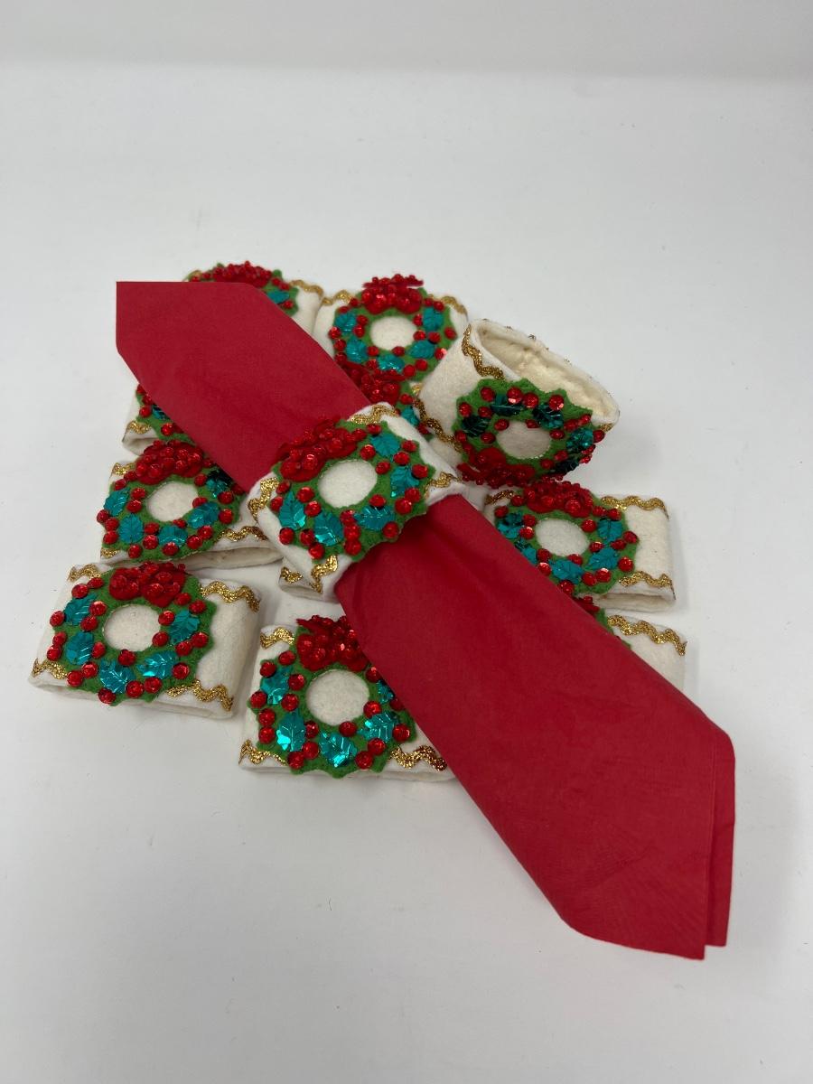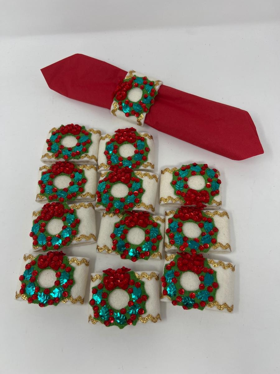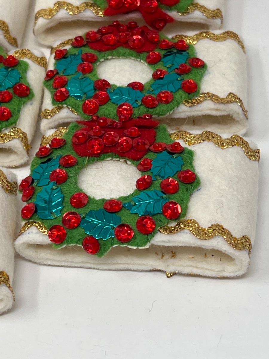 16 felt ring napkin holders with felt and sequin wreath 1.5” wide.