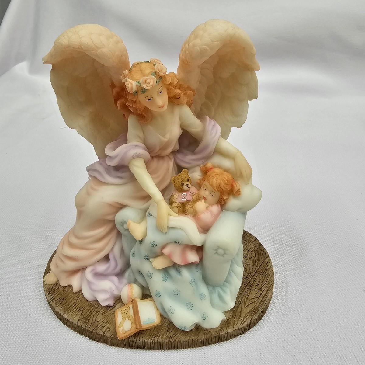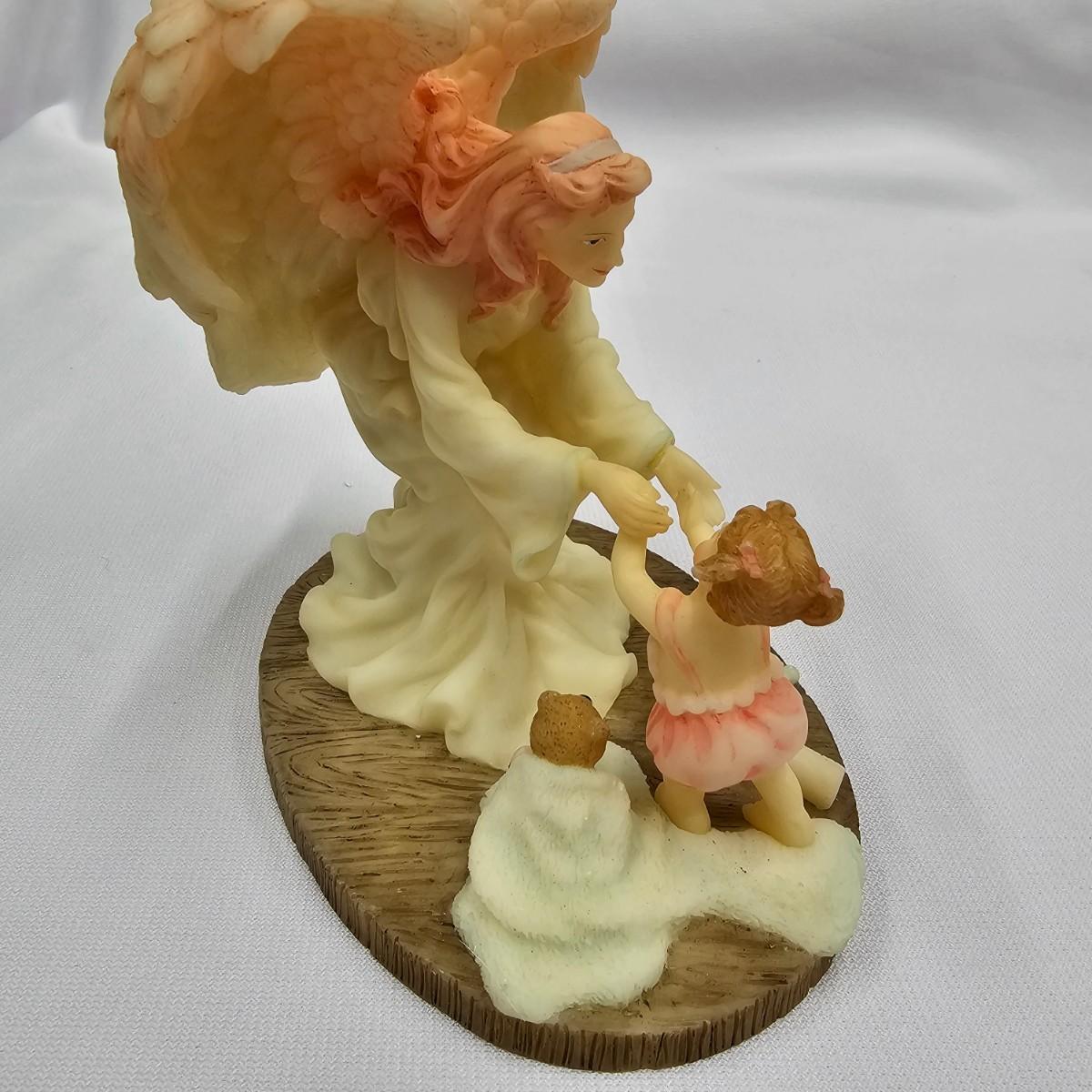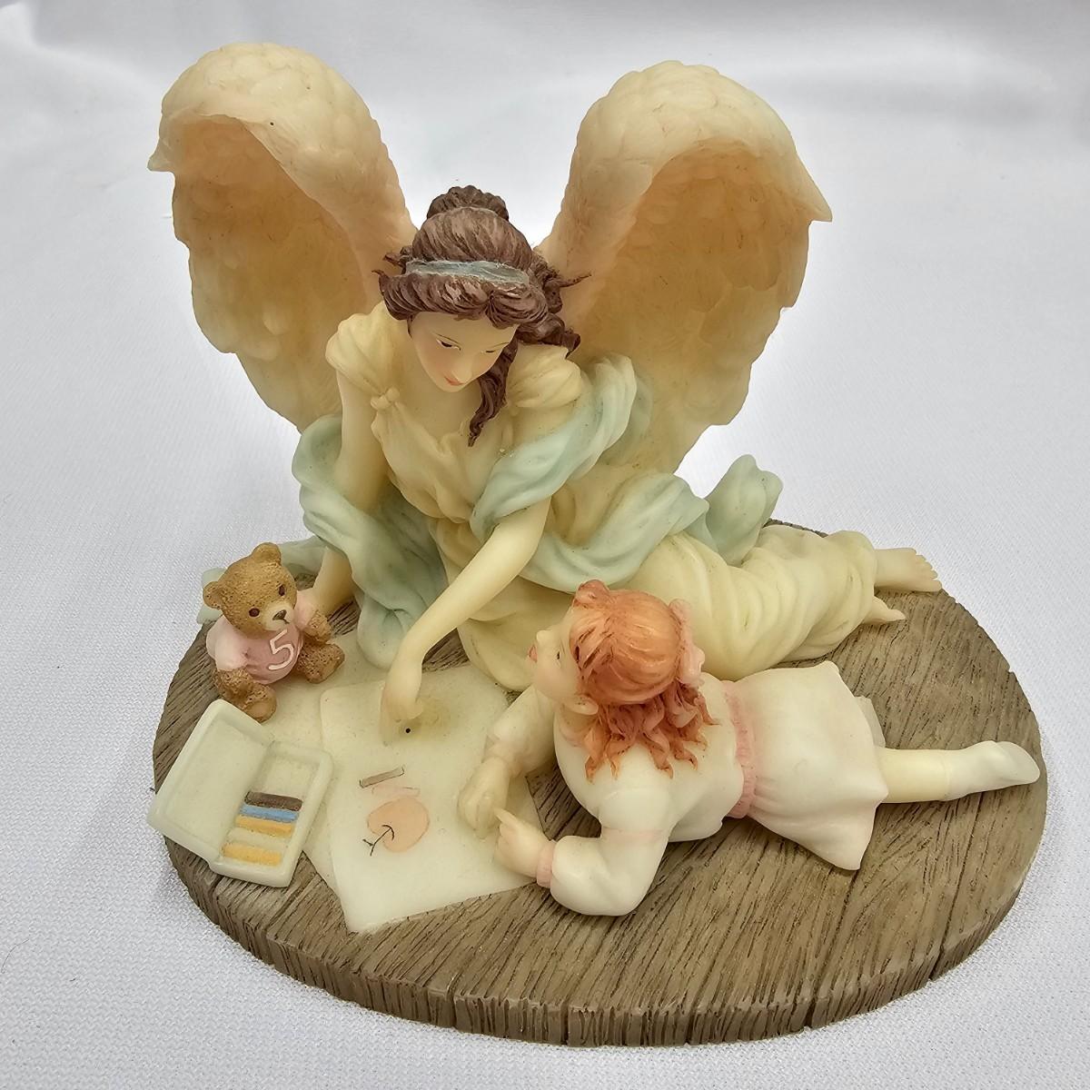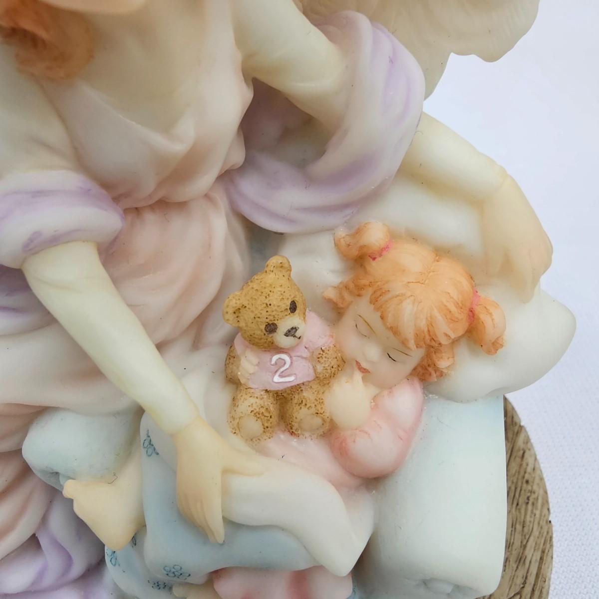 Five charming sculptures by Roman depicting angels guarding a child as she grows. Meticulous detail on faces and bodies and the teddy bear in each scene shows the age. Shown here are newborn, years 1, 2, 3, and 5. Tallest item is 5.5"H. All in original boxes. Info and issue numbers shown on bases of items. See photos for details. Shipping available.