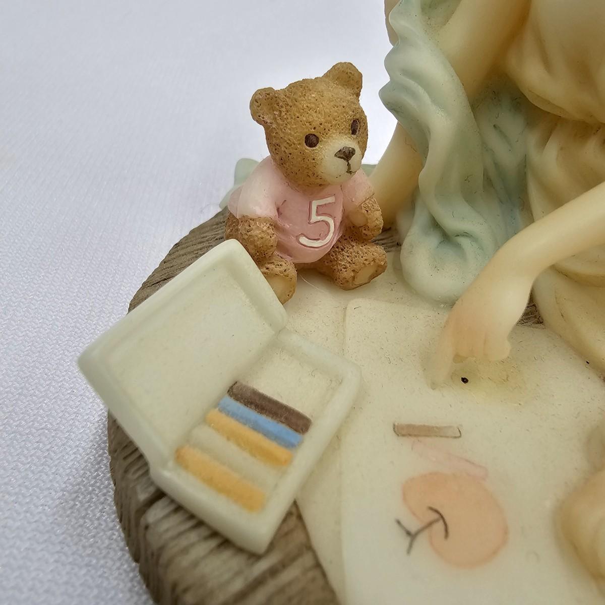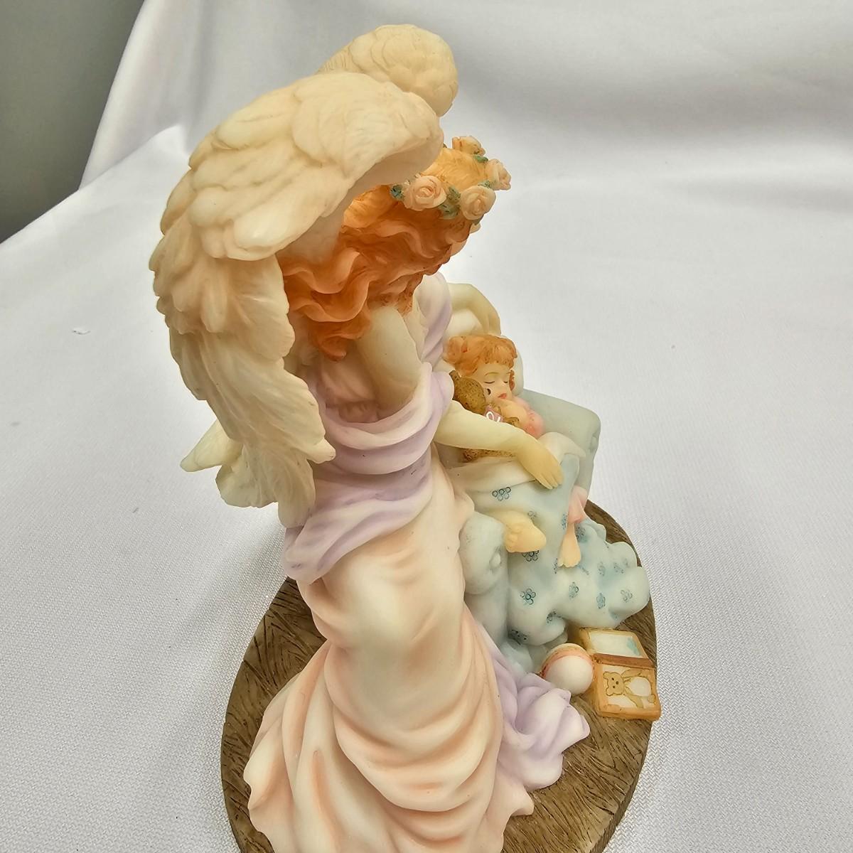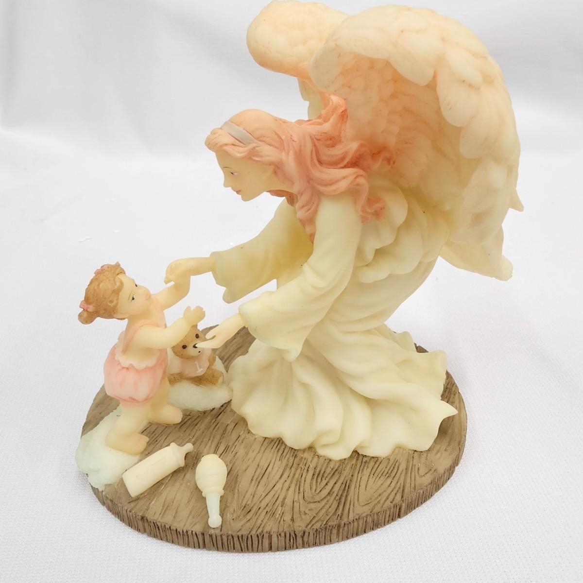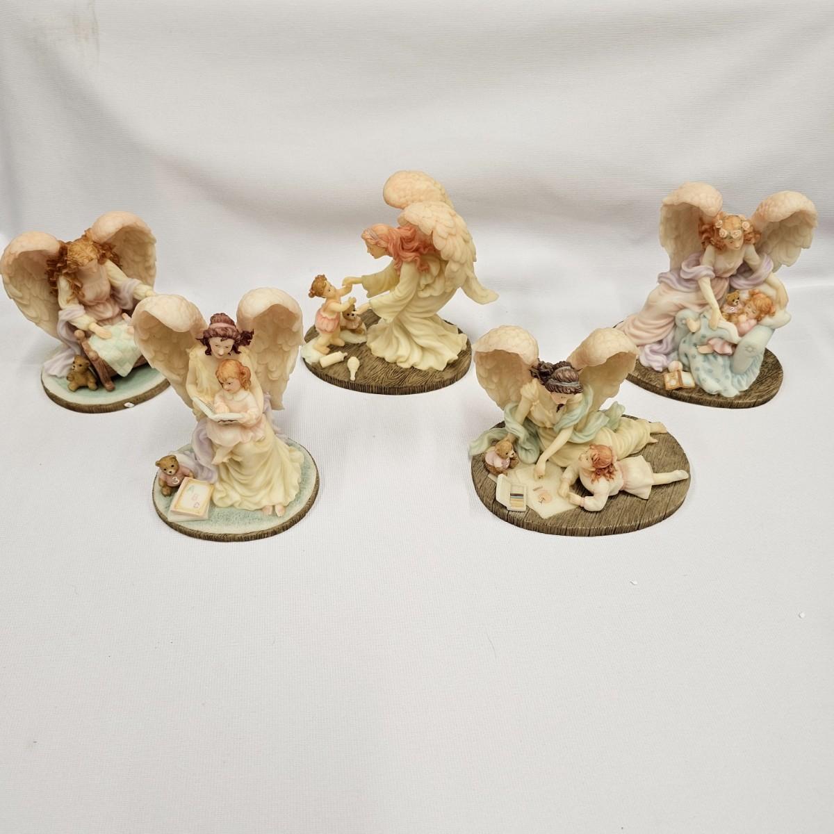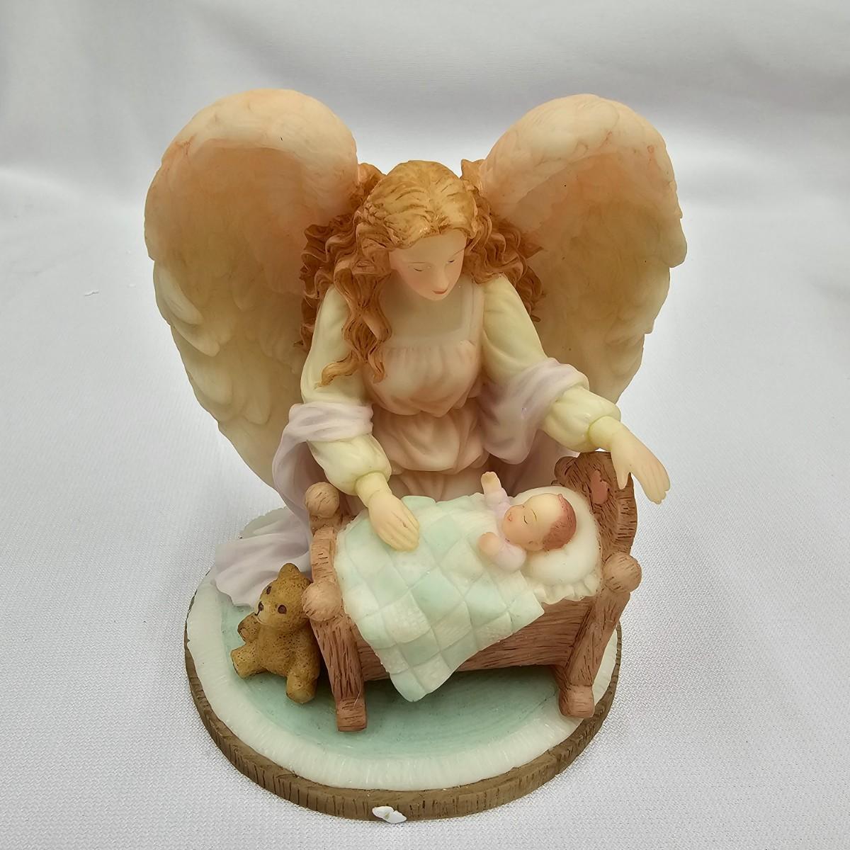 Five charming sculptures by Roman depicting angels guarding a child as she grows. Meticulous detail on faces and bodies and the teddy bear in each scene shows the age. Shown here are newborn, years 1, 2, 3, and 5. Tallest item is 5.5"H. All in original boxes. Info and issue numbers shown on bases of items. See photos for details. Shipping available.