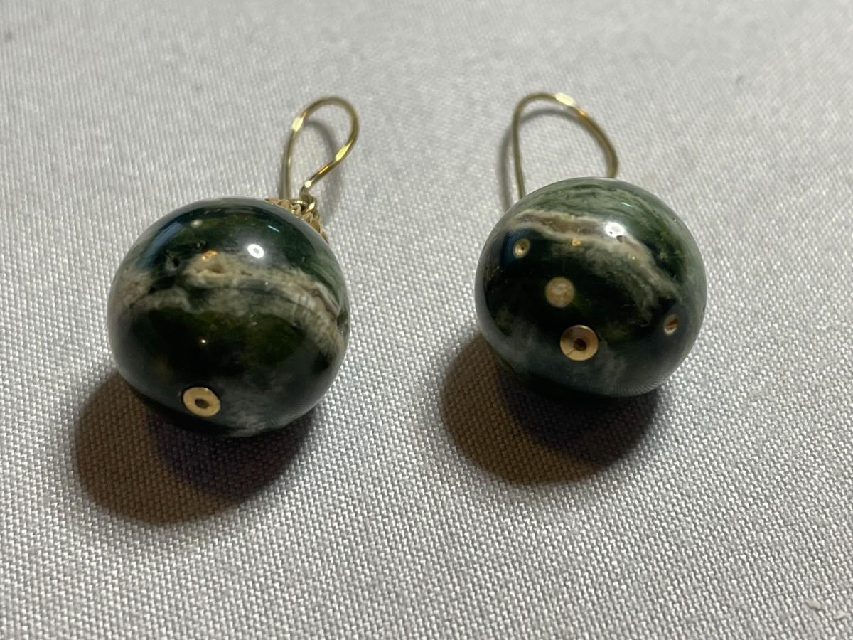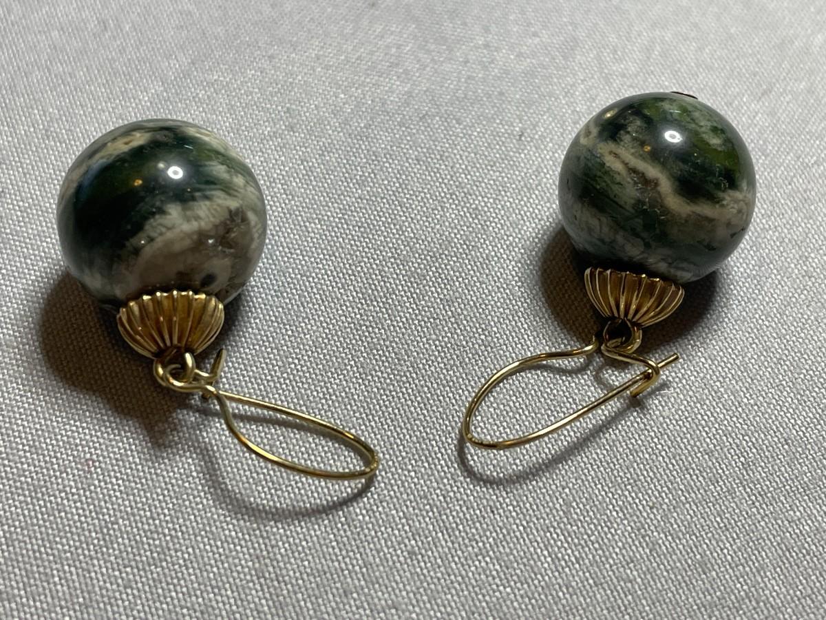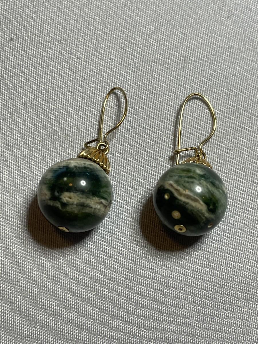 I'm pretty confident that these are are seraphinite, but if I am incorrect, they are a polished stone of some sort. The total length of the earrings is just under 1.5 inches long.