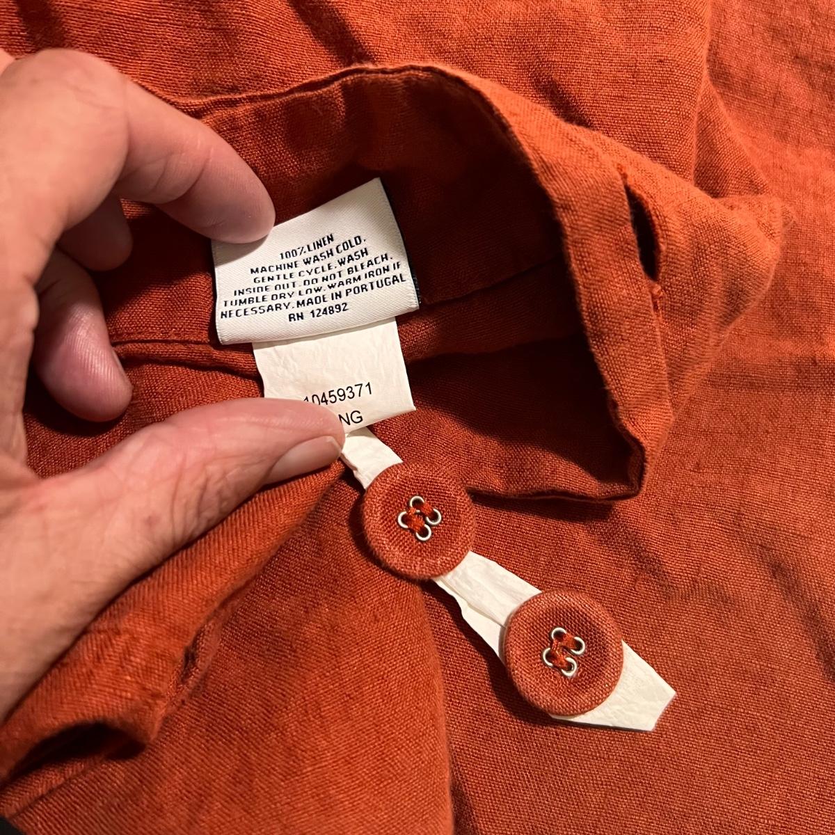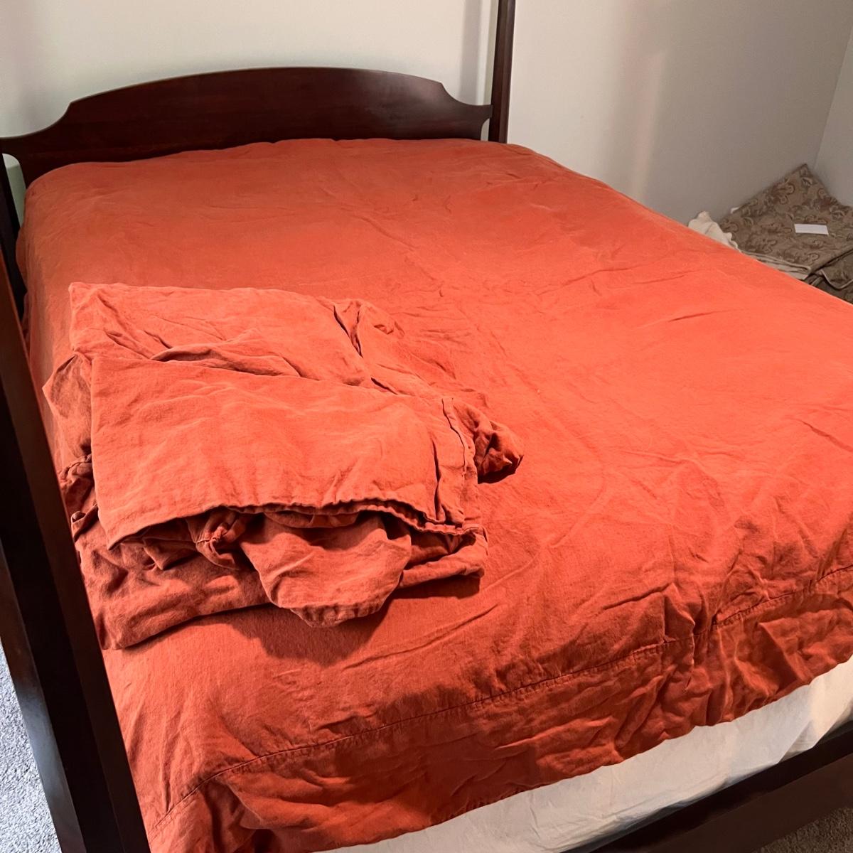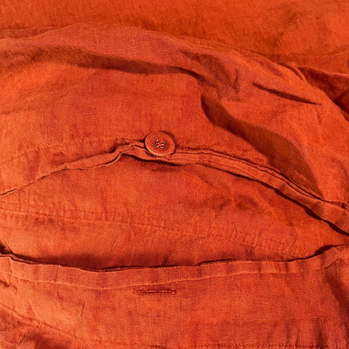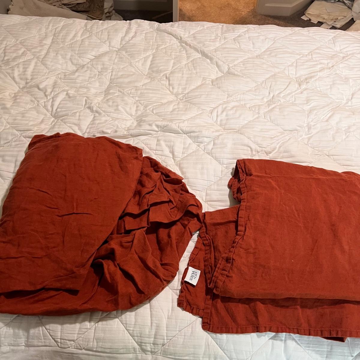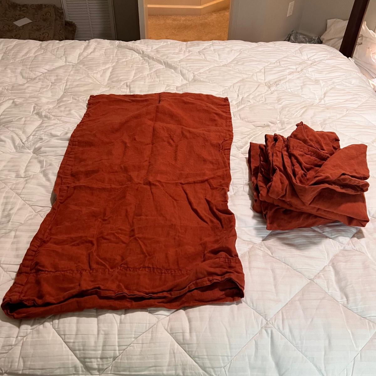 A complete set of bedding for a king size includes a duvet cover, one fitted and one flat sheet plus four king pillowcases. 100% linen and in a dark rust color.