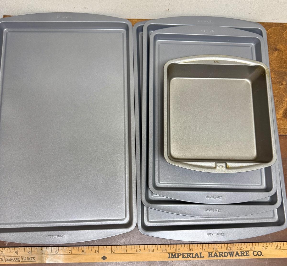 6 items from Chefmate: 2 13" x 9" pans, 2 15" x 10" pans, and 2 17" 11" pans; also a 8" x 8" brownie pan by Good Cooks. All in great condition, no rust or dents/dings.