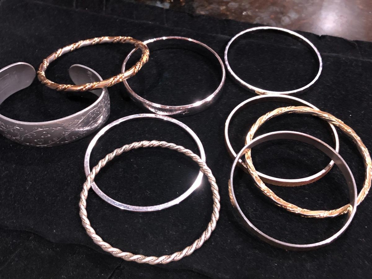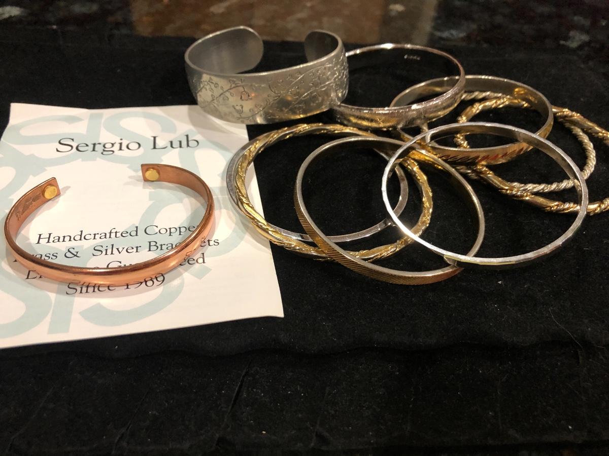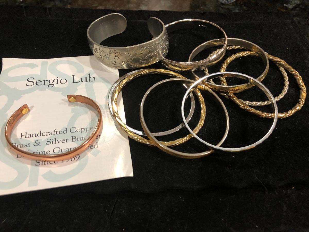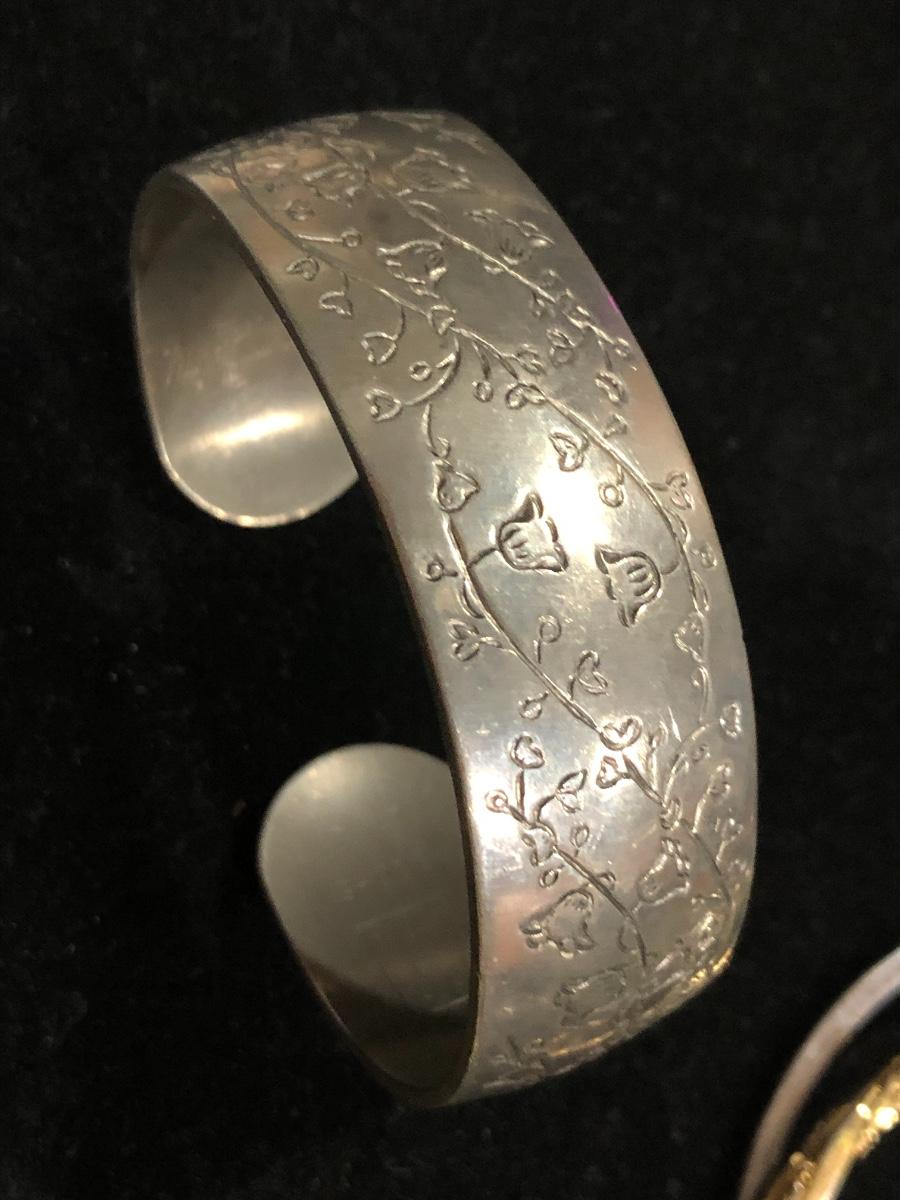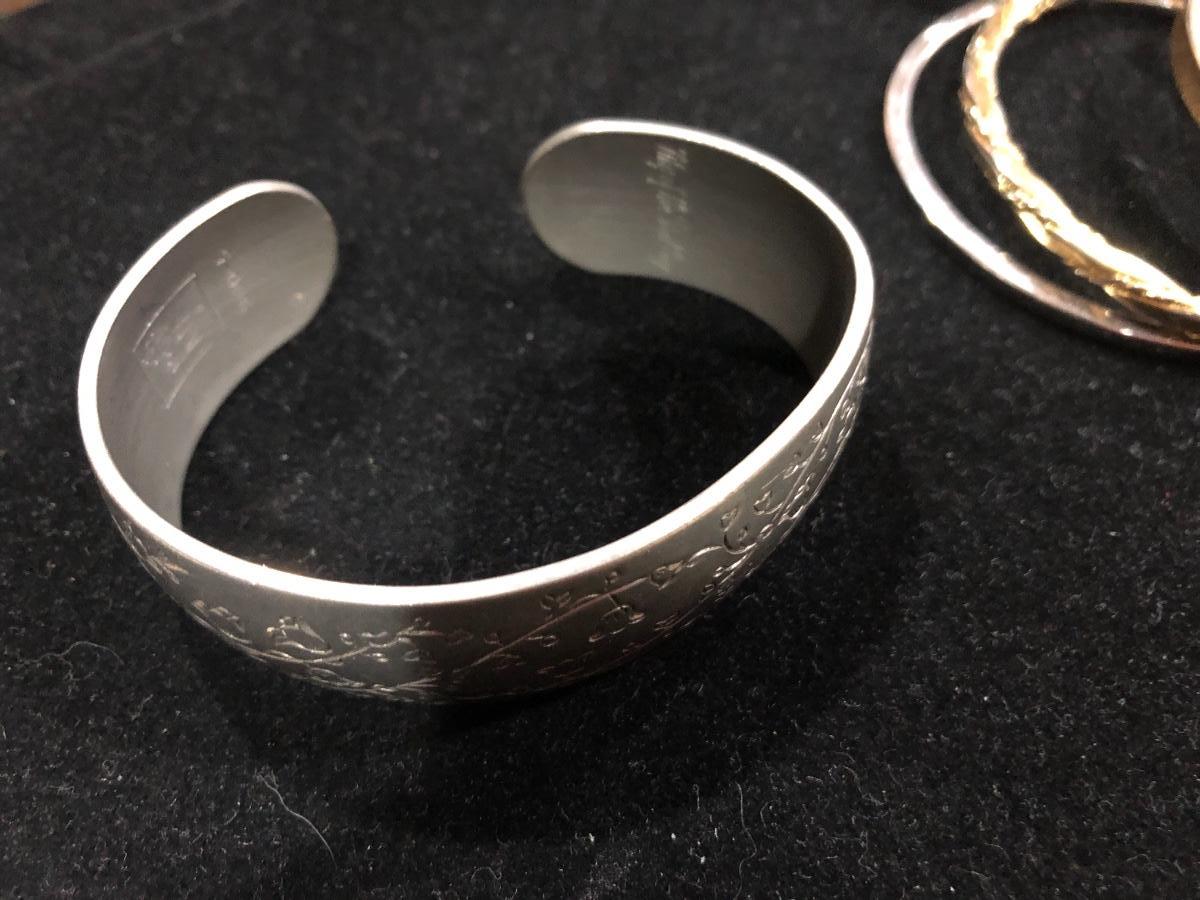 Vintage pewter Kirk Stieff cuff stamped inside “Life of the Valley”. Plus Sergio Lub Copper magnetic bracelet and other vintage and contemporary costume jewelry bangles bracelets.