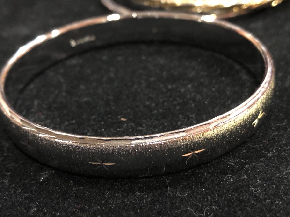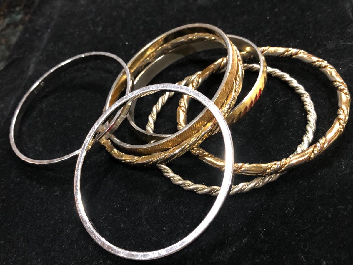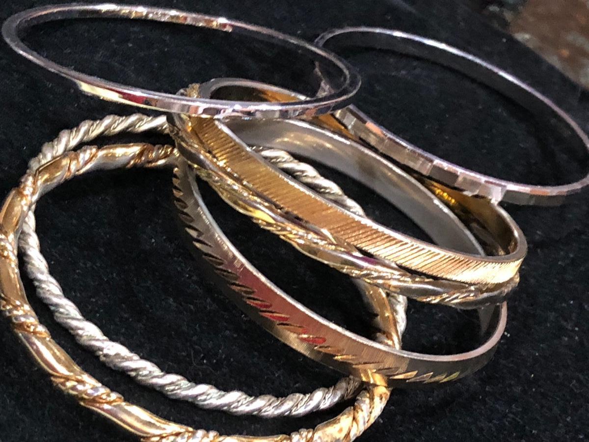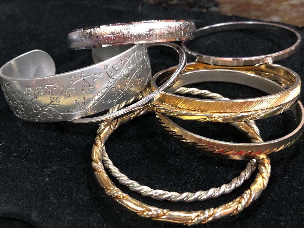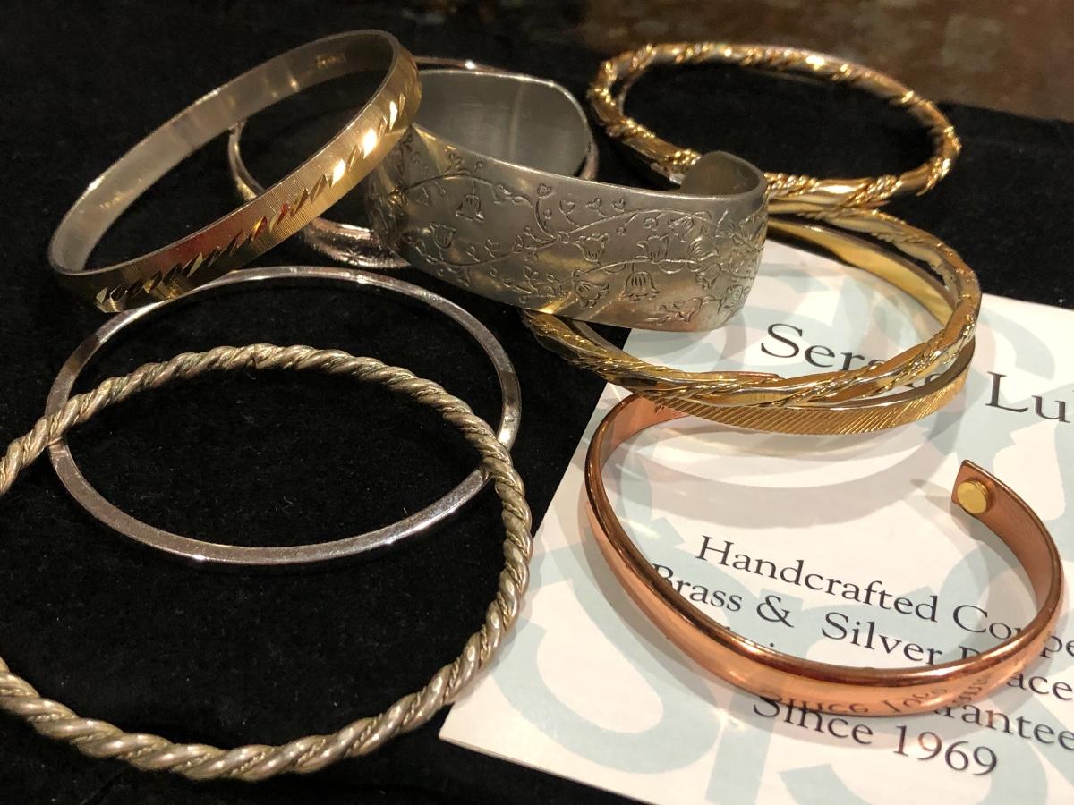 Vintage pewter Kirk Stieff cuff stamped inside “Life of the Valley”. Plus Sergio Lub Copper magnetic bracelet and other vintage and contemporary costume jewelry bangles bracelets.