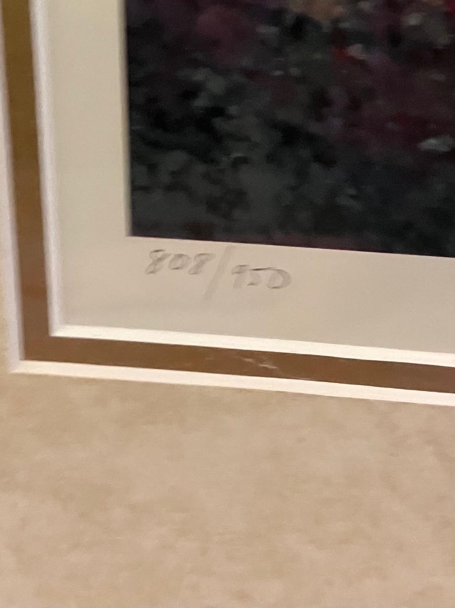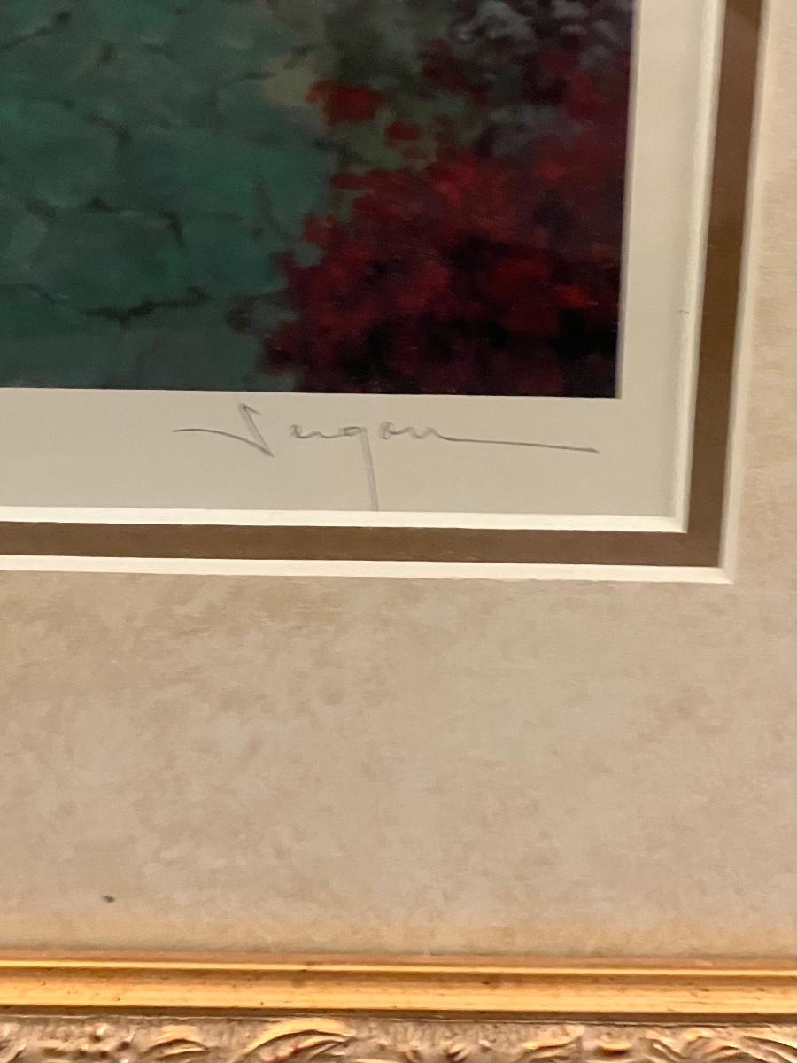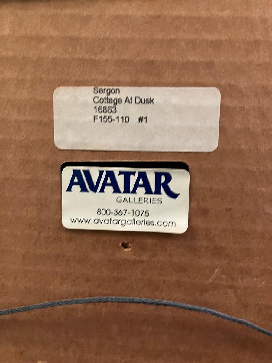 This is a hand-signed and numbered limited edition giclée print titled Cottage at Dusk by the Filipino-American artist Sergon (born Ramon Sergon in Manila, Philippines, 1945). Known for his impressionistic depictions of serene landscapes, lush gardens, cottages, and still lifes influenced by Asian and European traditions, Sergon's works often evoke a tranquil, glowing atmosphere reminiscent of artists like Thomas Kinkade in their cozy, light-filled cottage scenes.