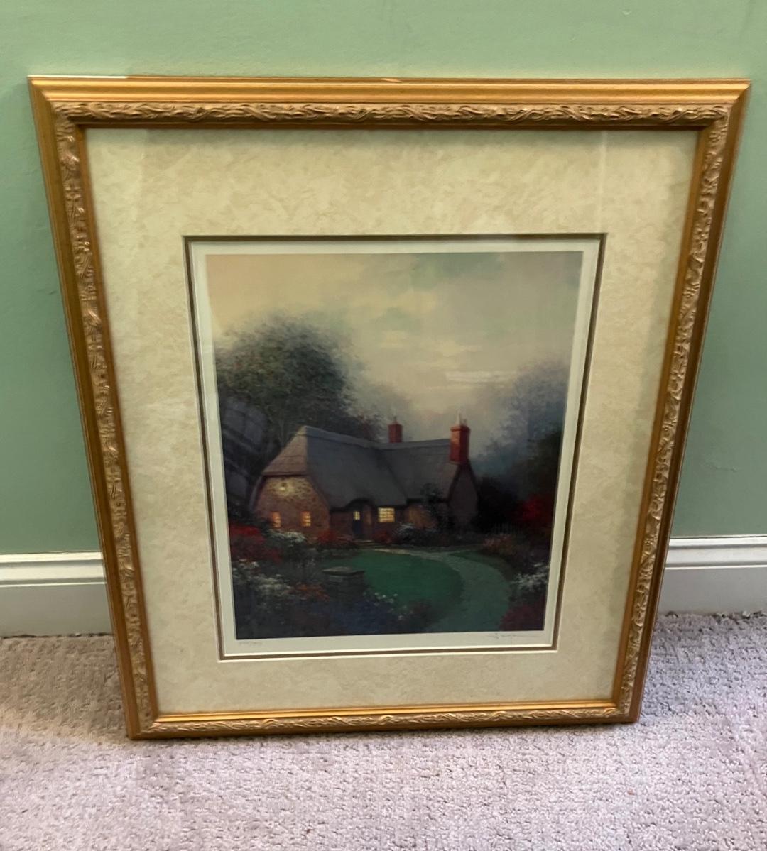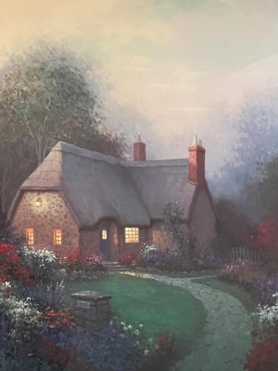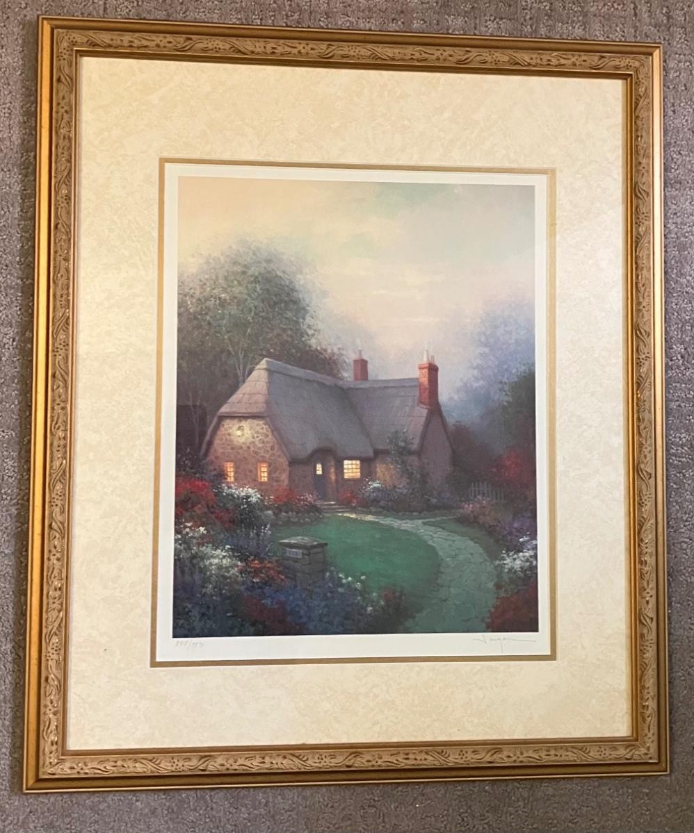 The print depicts a charming English-style cottage at twilight, with warm lights glowing from the windows, a winding path through a flowering garden, misty trees, and a soft, atmospheric sky. It is a limited edition (typically out of 375, based on similar works in this series), pencil-signed by the artist in the lower right.