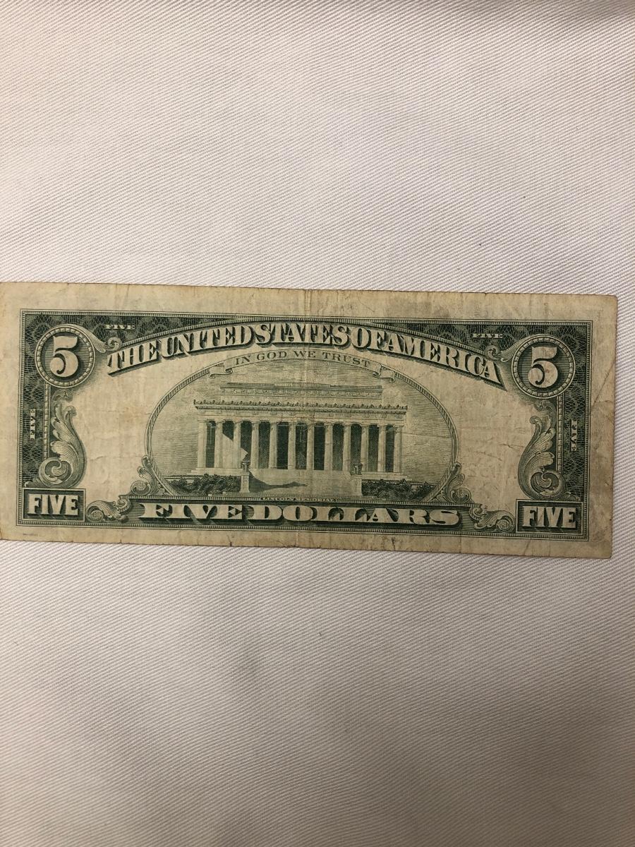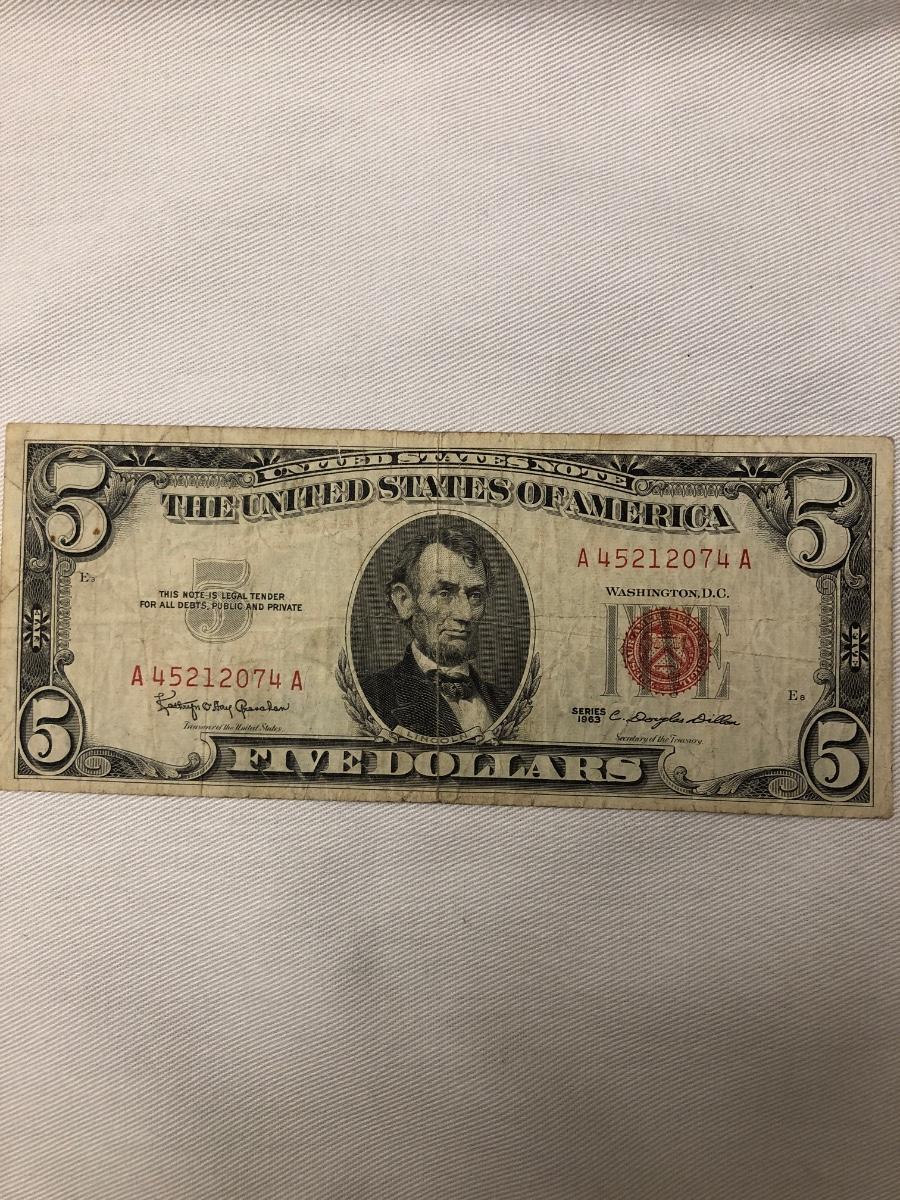 Interesting five dollar United States note from 1963 with red serial numbers and seal. Please see pictures for condition.