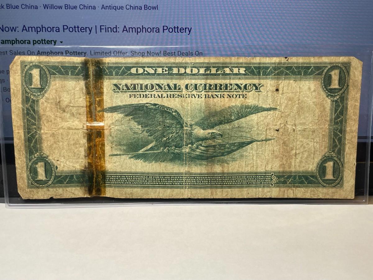Series of 1918 $1 Philadelphia National Currency Taped in Heavily Circulated Condition as Pictured.