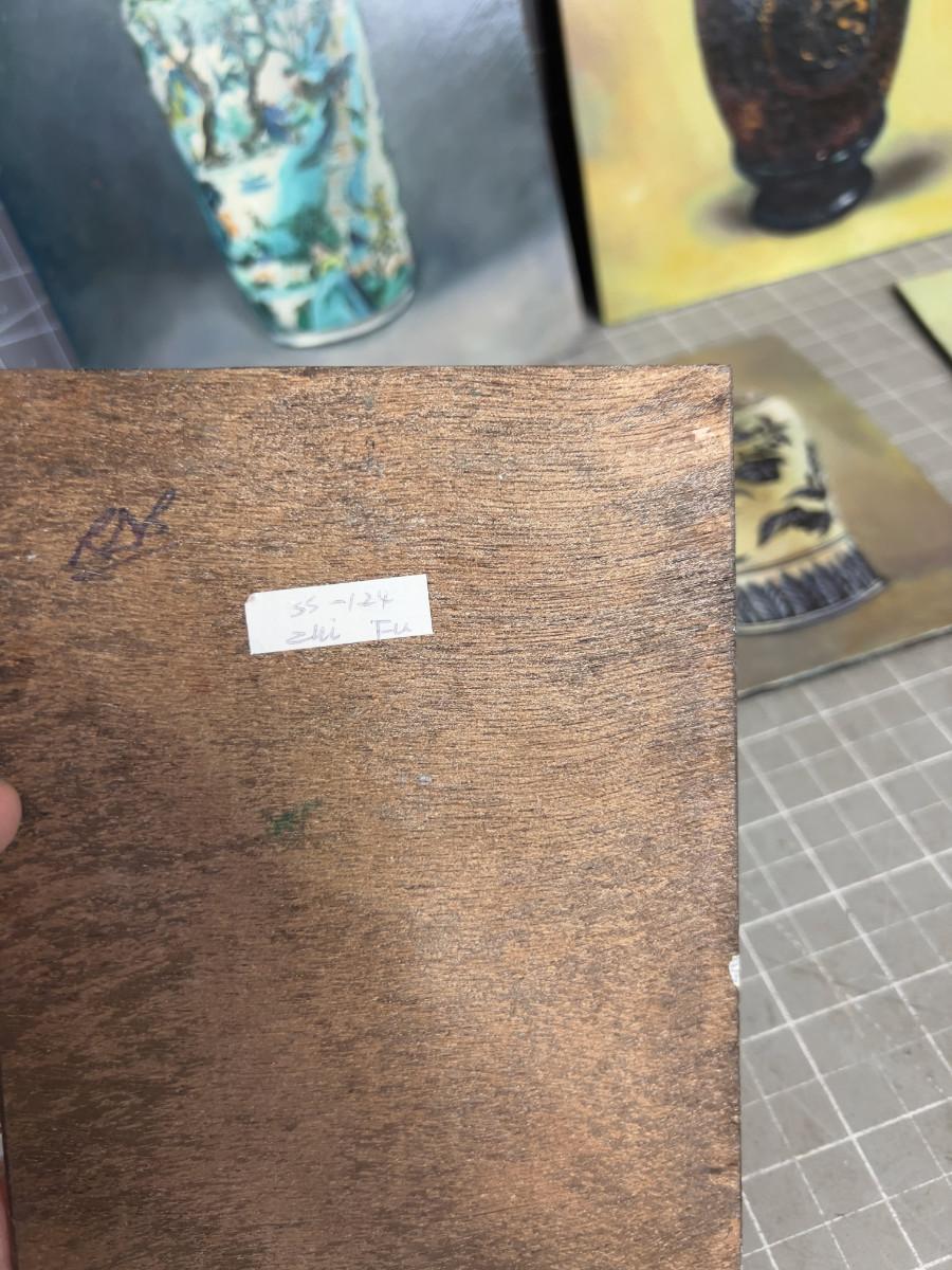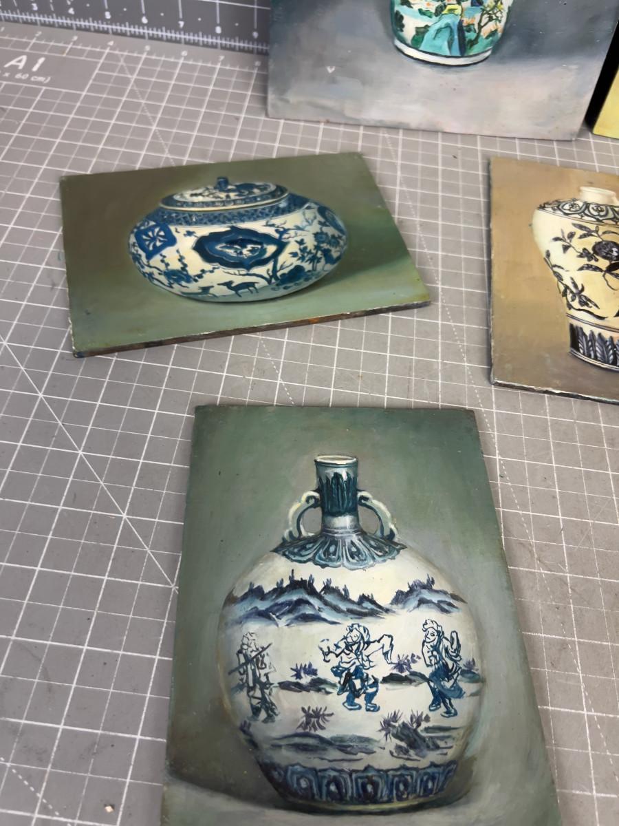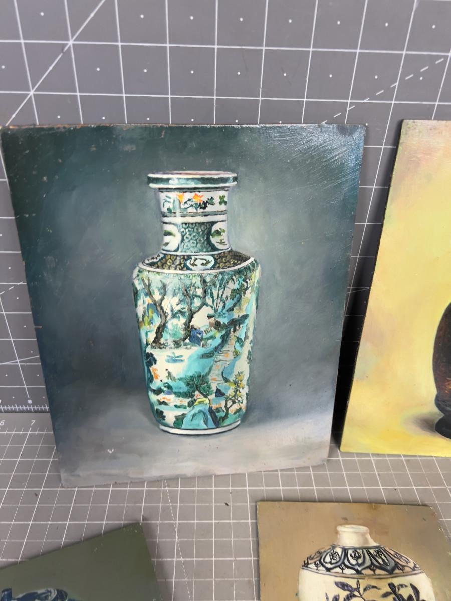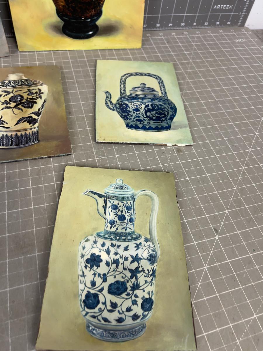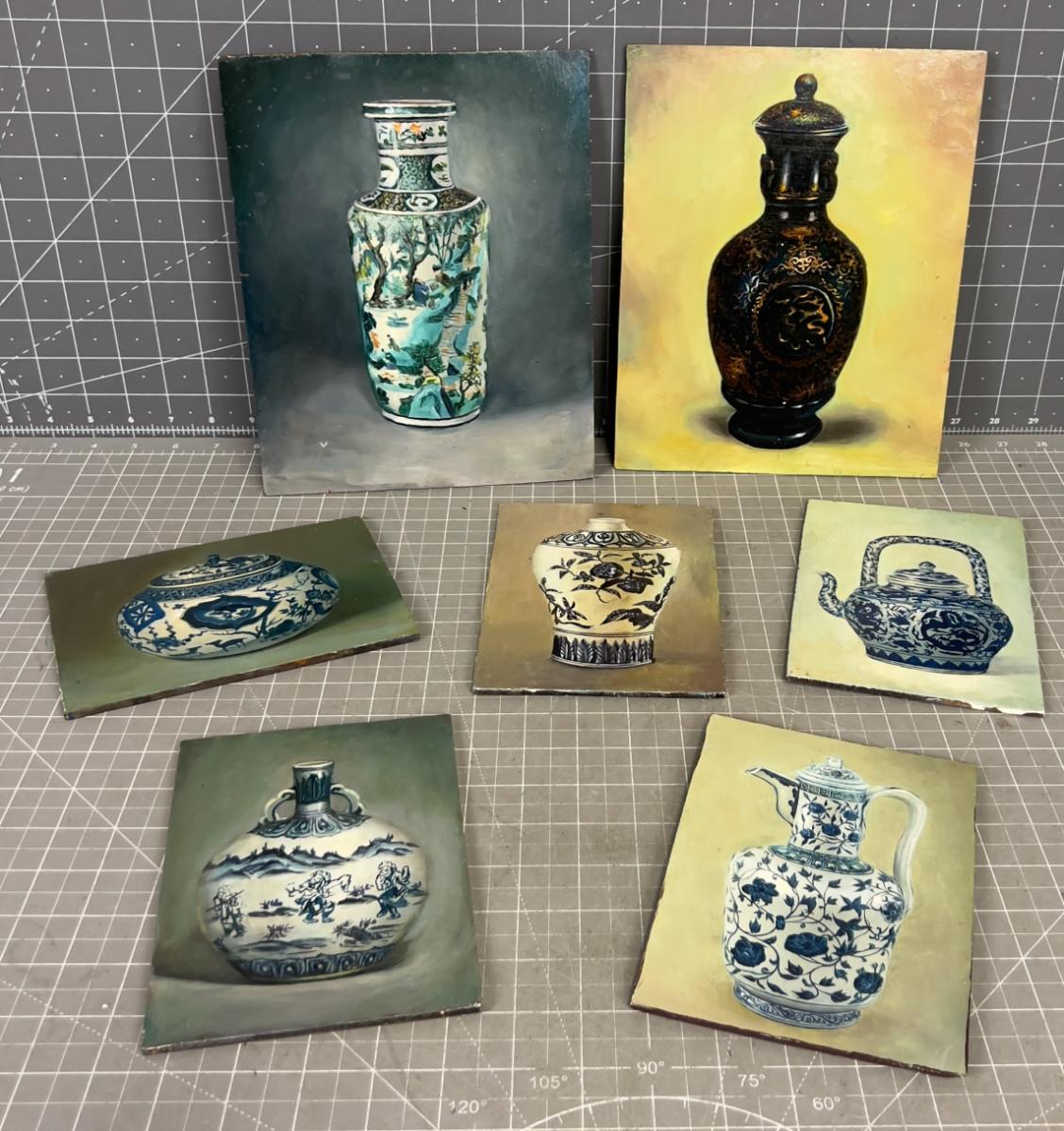 Depicting mostly Blue Willow Type Pottery. Good Condition. NO Frames.