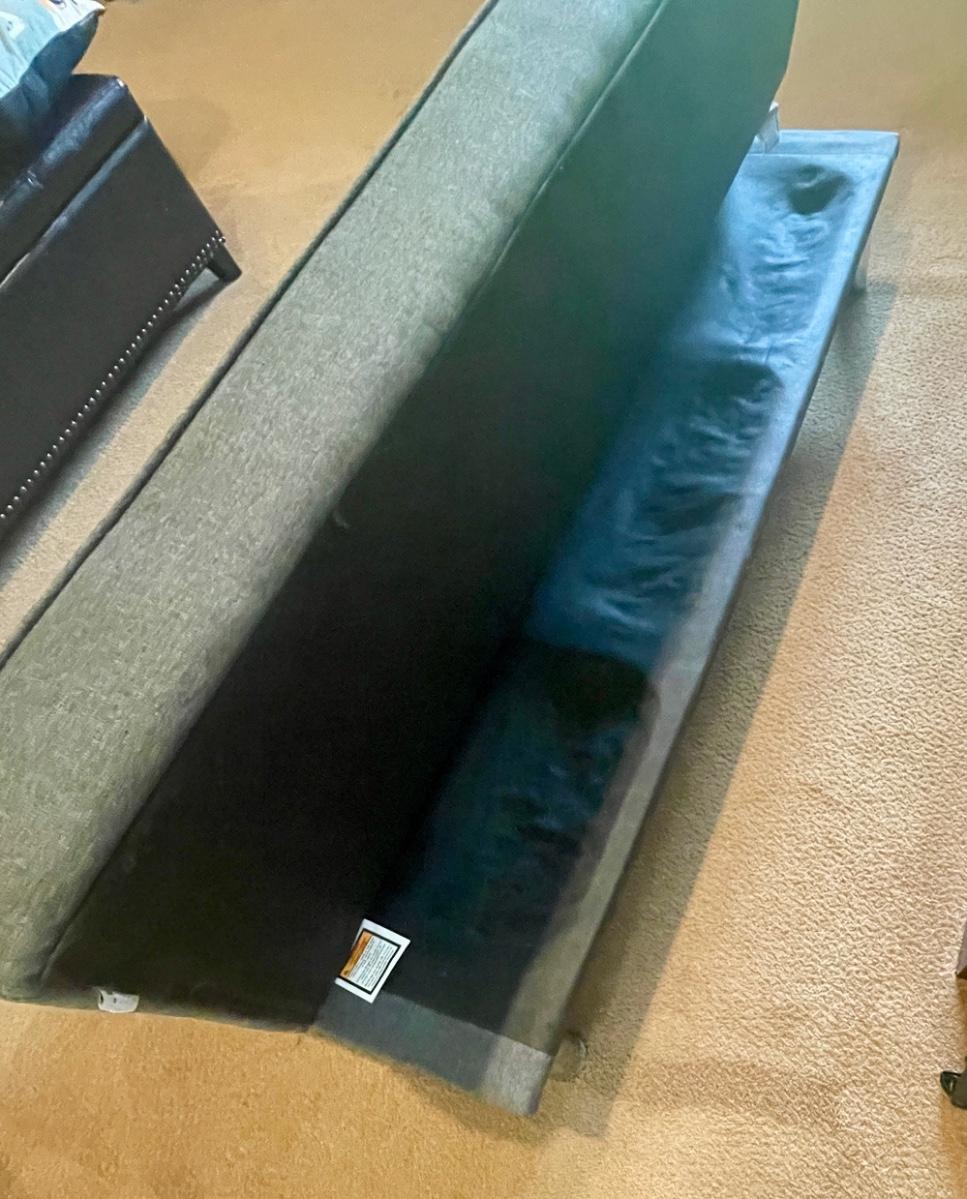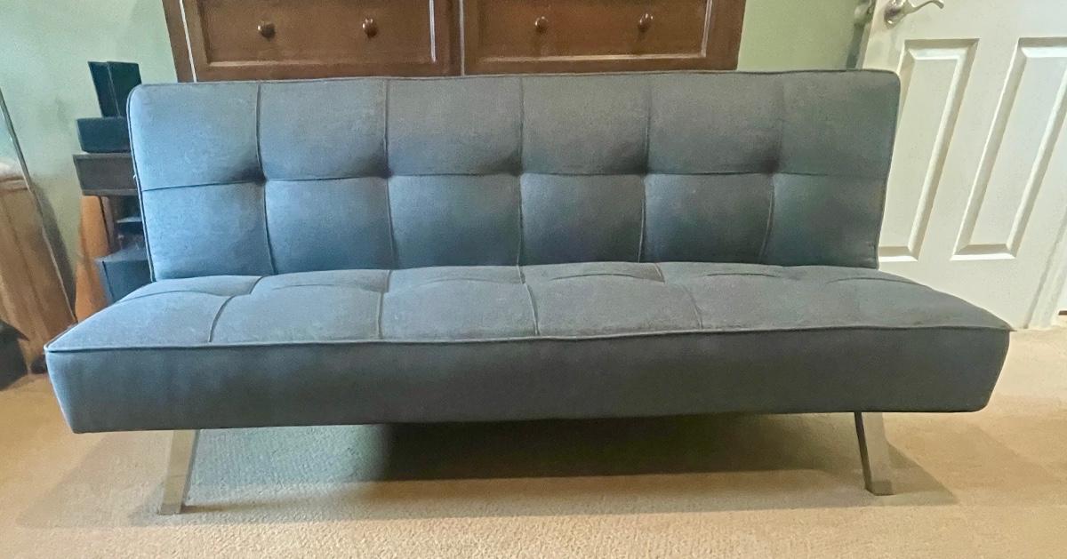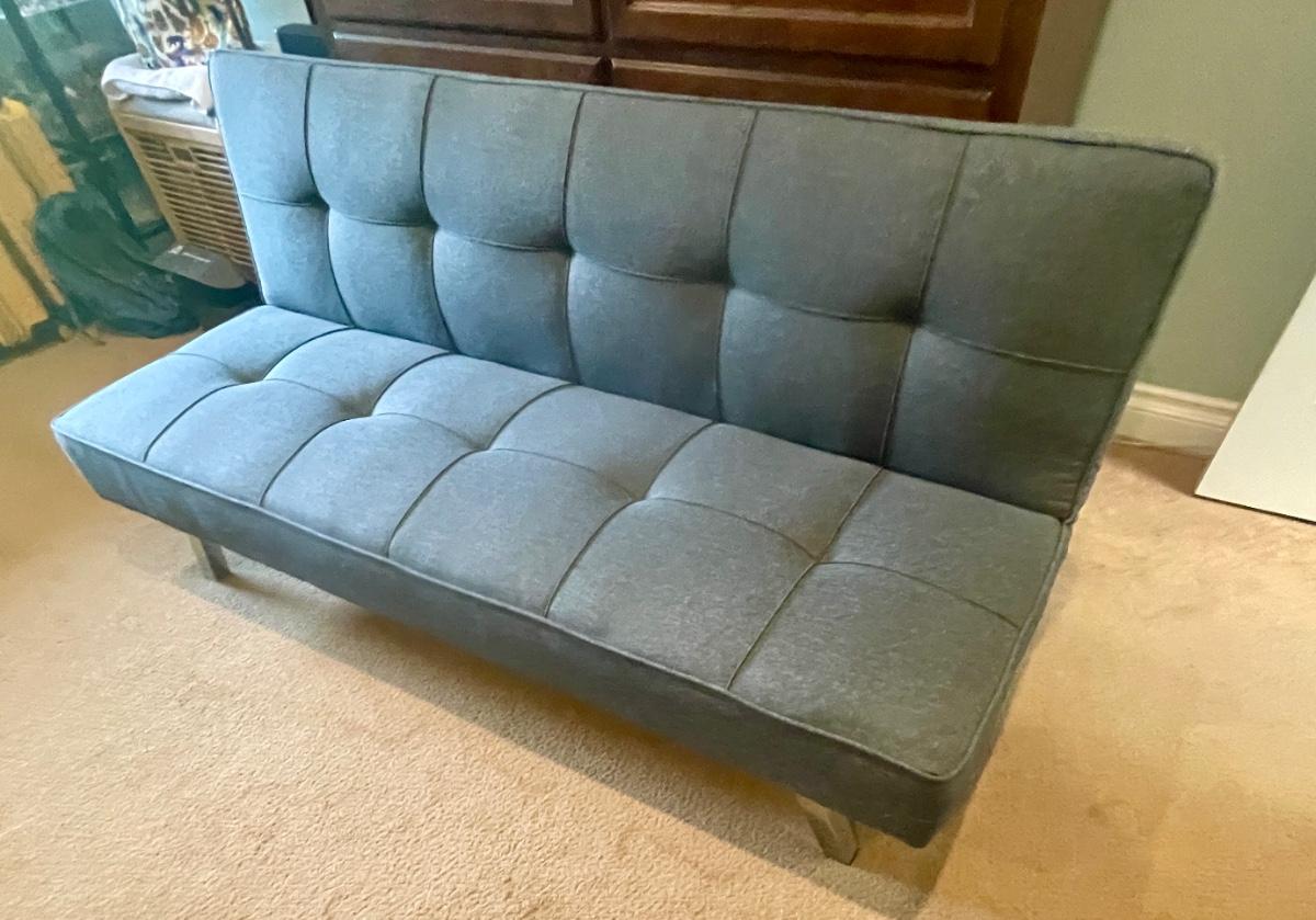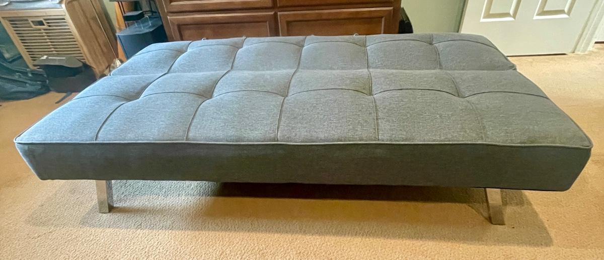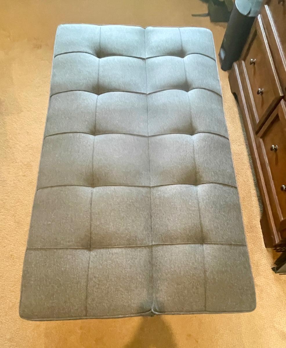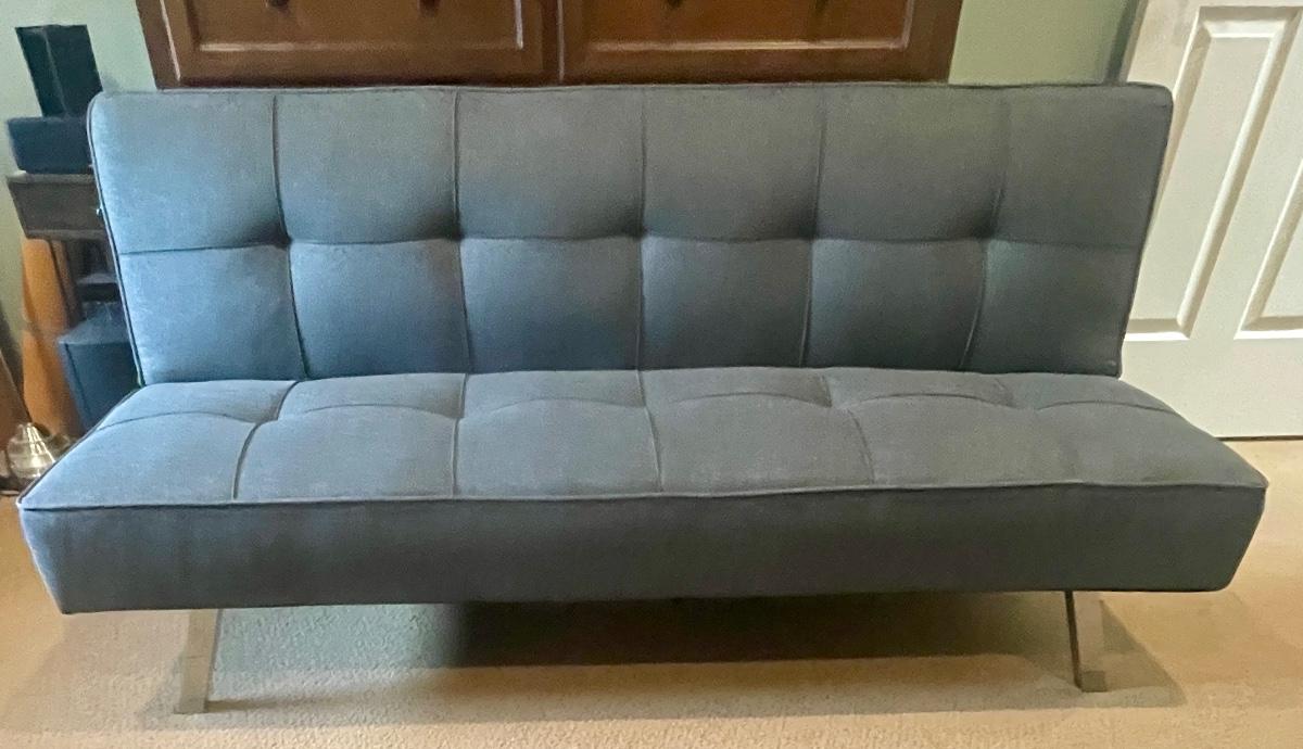 Carson offers you a multi-functional piece that transforms from a sofa to a lounger and finally to a full-size bed. Backrest can be folded flat to make a 66” x 37” bed. 66” long, seat depth 19”, seat height 14”, height at back is 29”. Very good condition, chrome legs, dark gray fabric.