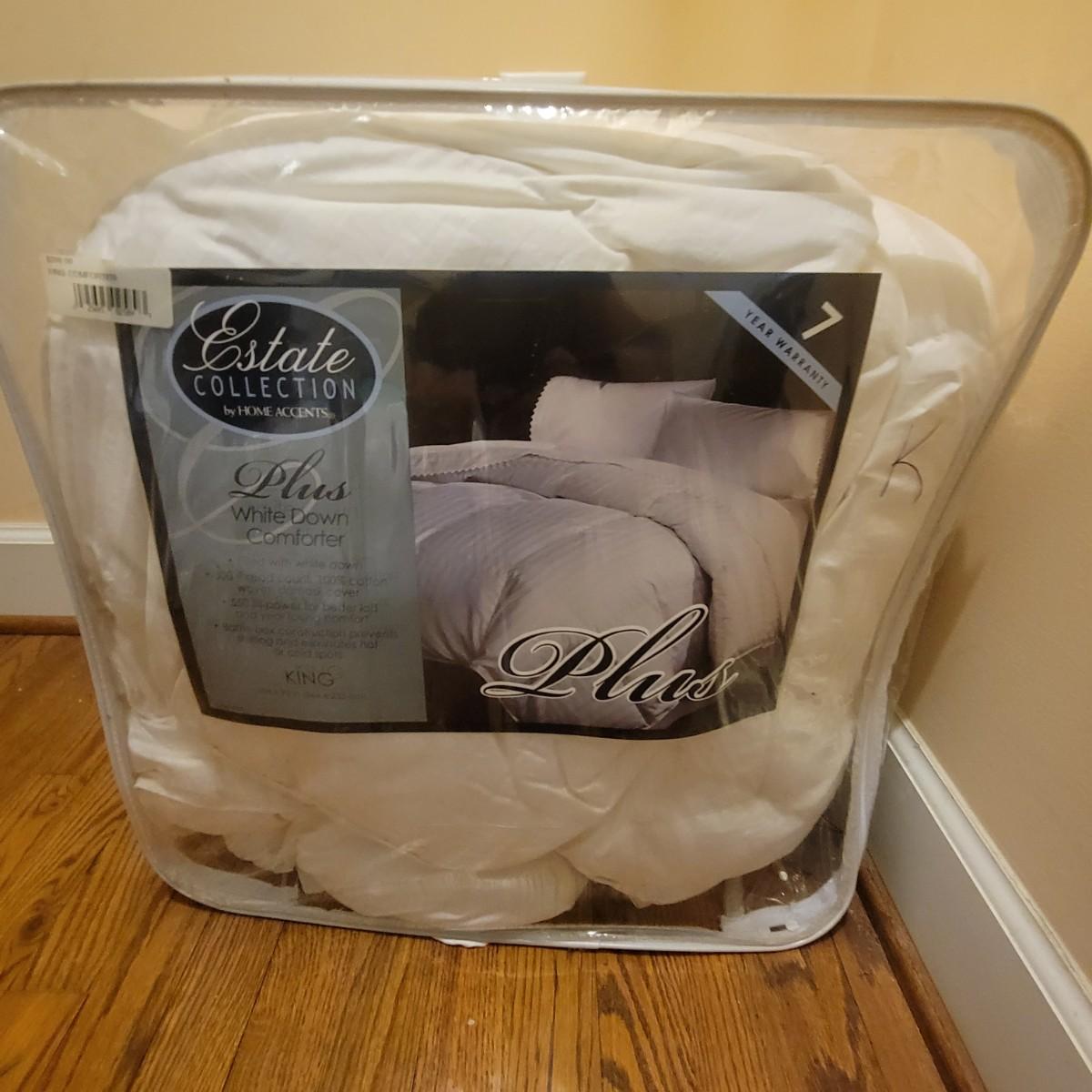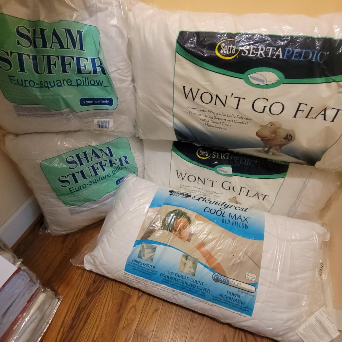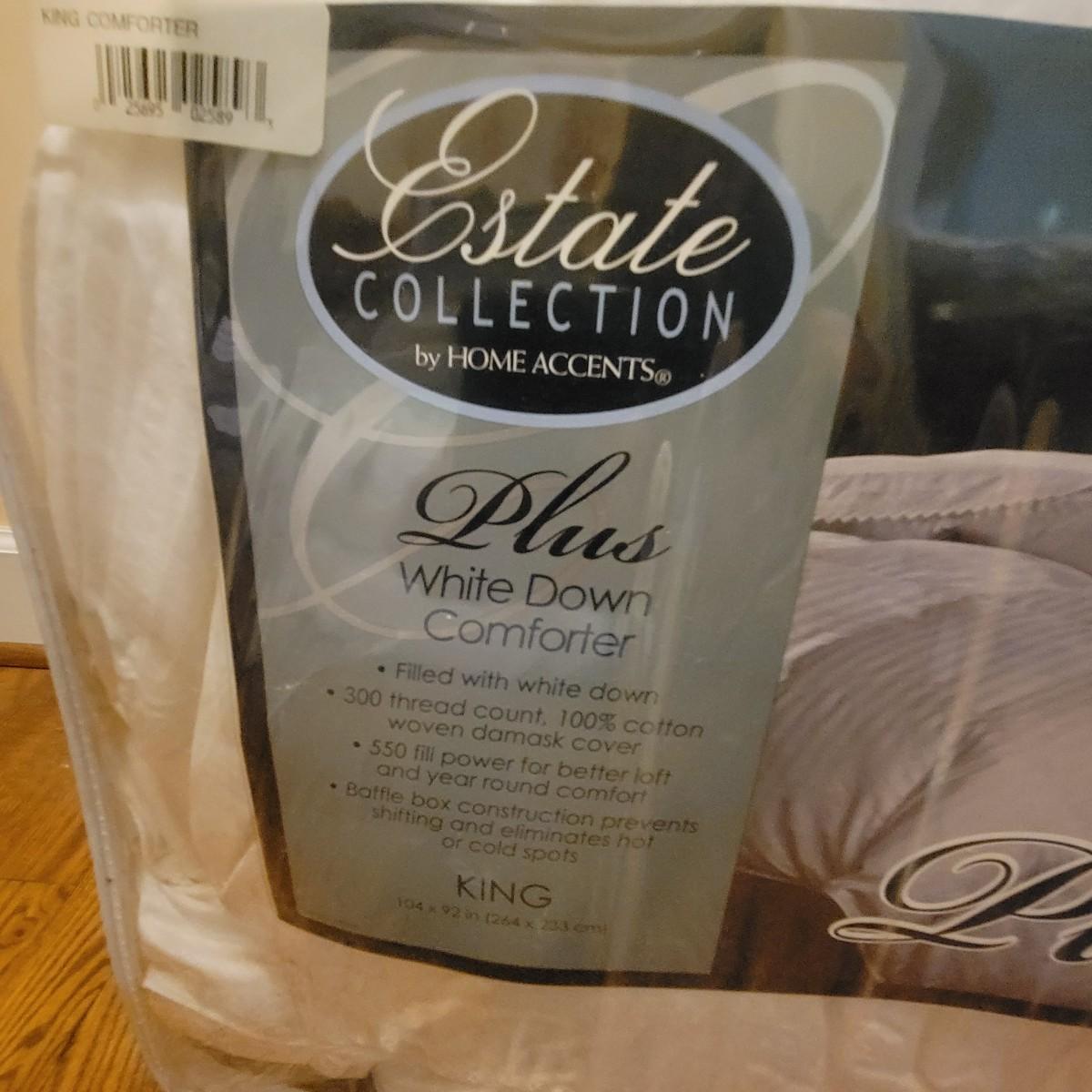 3 Serta king sized pillows, 2 sham stuffer Euro-square pillows measuring 22"x 22" and a king sized down comforter by Home Accents Estate Collection. Pillows are all new and in original packing. Down comforter is white with faint stripes and has seen light use.