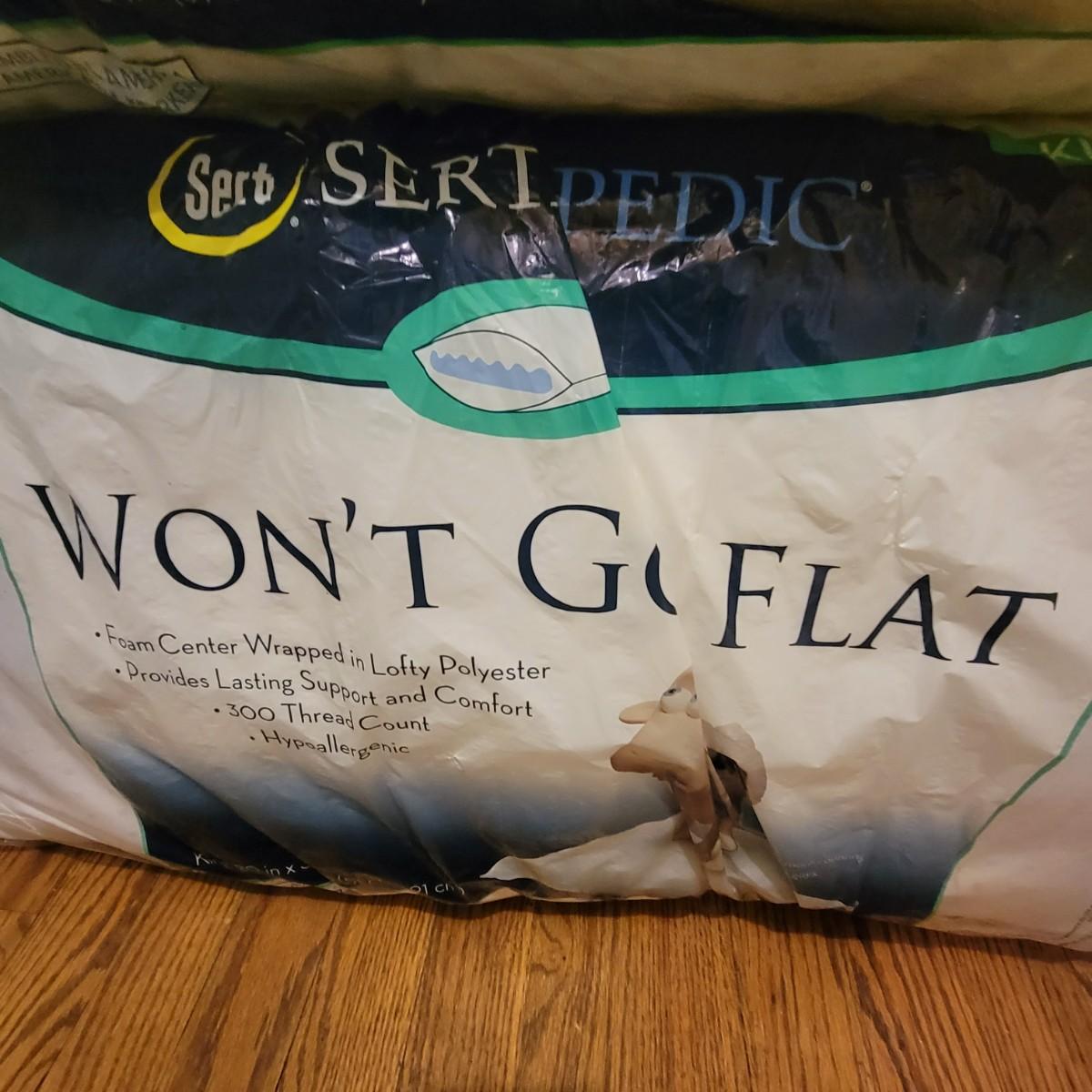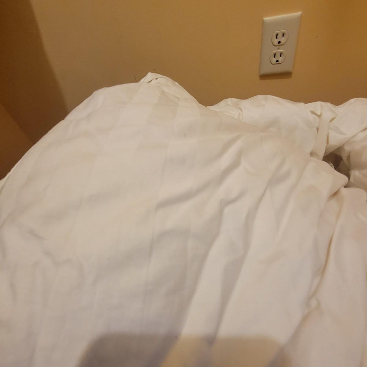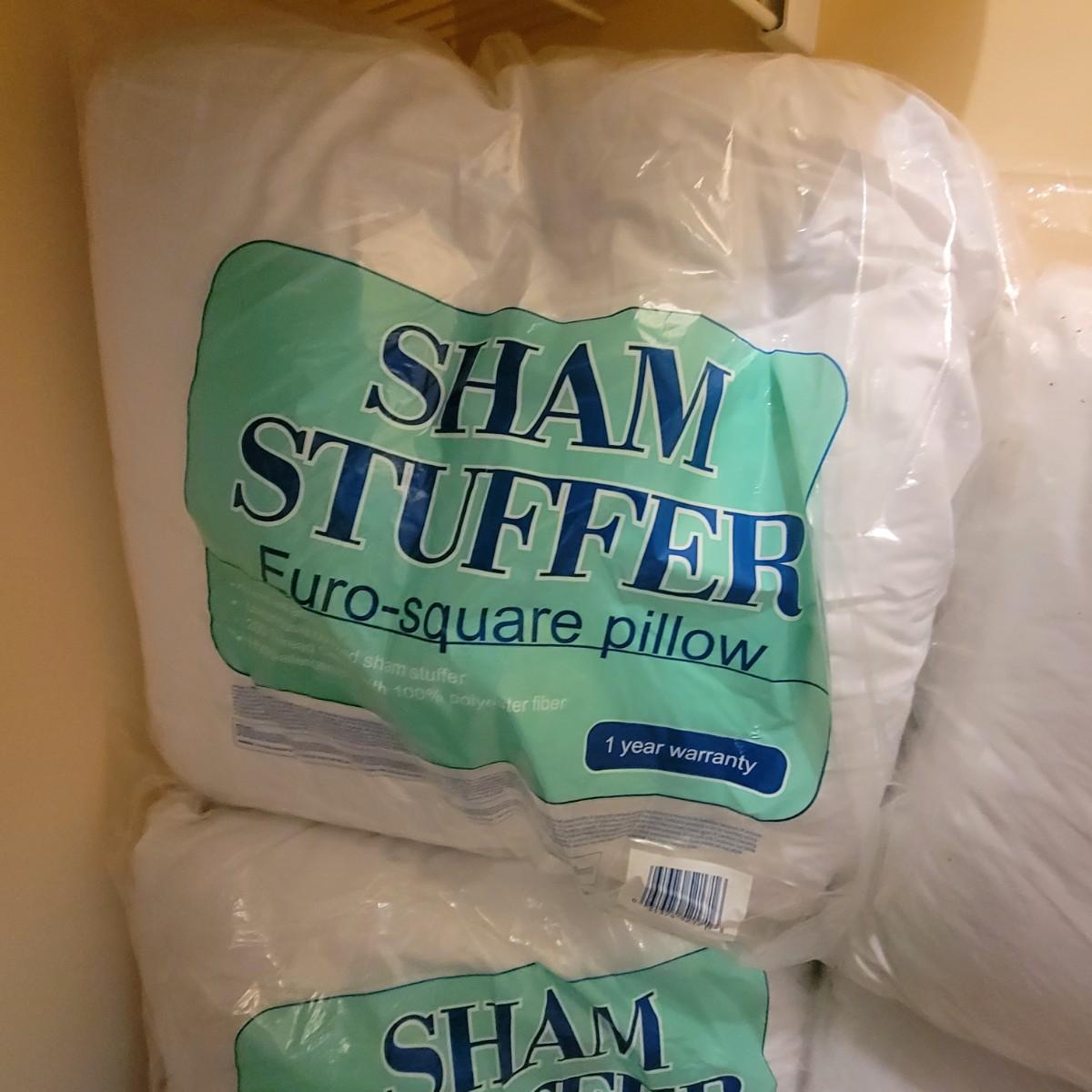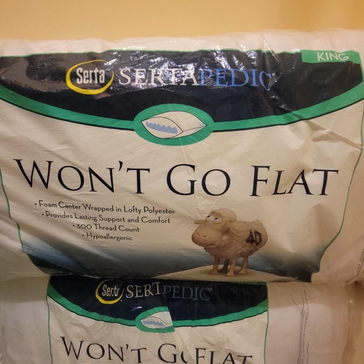 3 Serta king sized pillows, 2 sham stuffer Euro-square pillows measuring 22"x 22" and a king sized down comforter by Home Accents Estate Collection. Pillows are all new and in original packing. Down comforter is white with faint stripes and has seen light use.