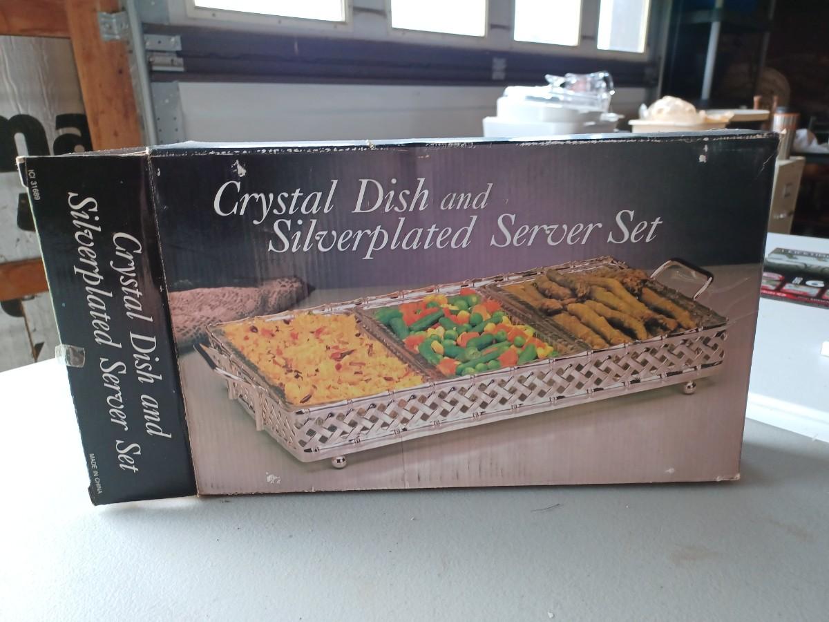 Vintage NOS Crystal Dish & Silverplated Server Set Original Box 3 Sections