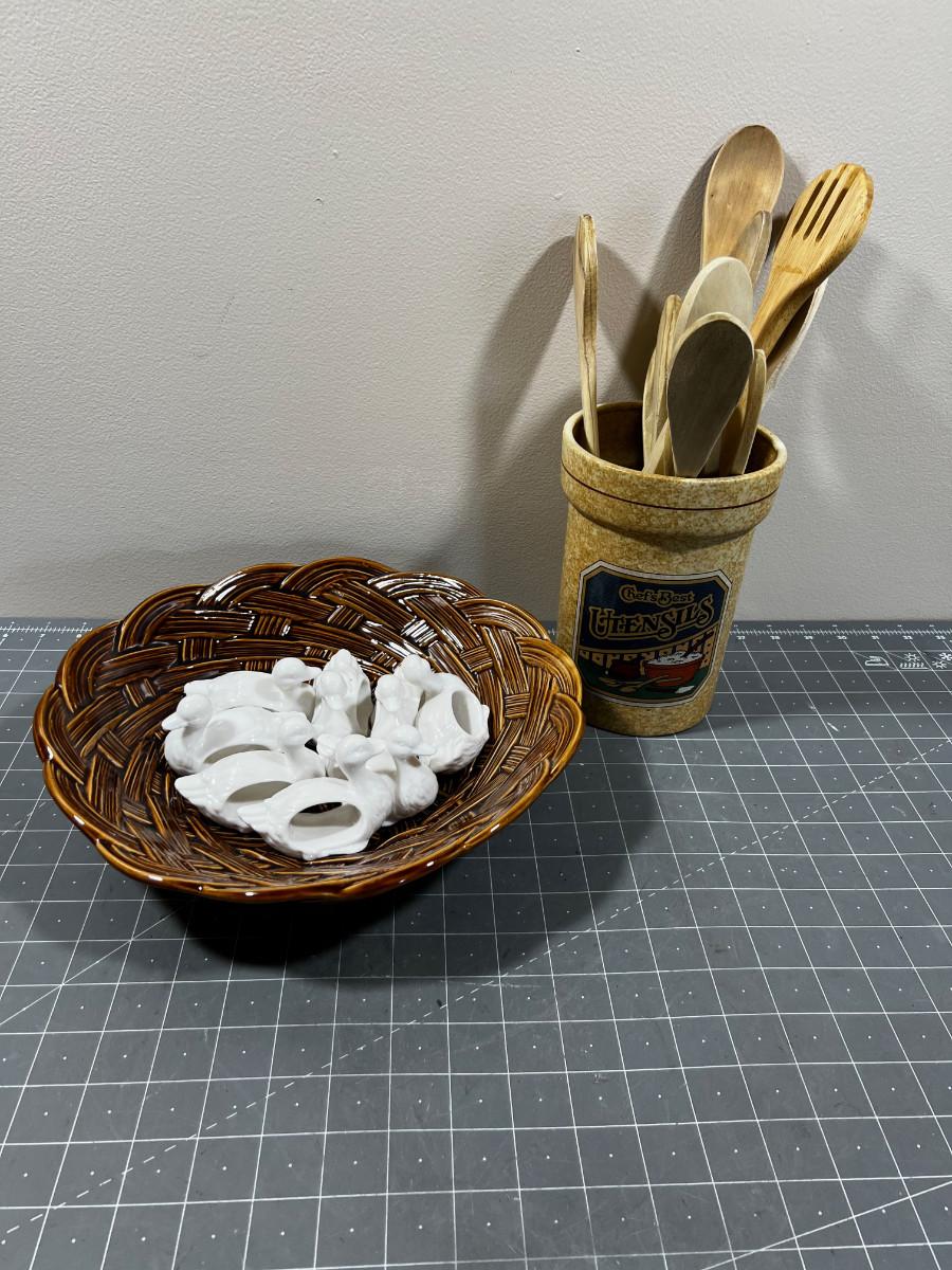 Serving Bowl, Napkin Rings Ducks and Wooden Spoon LOT