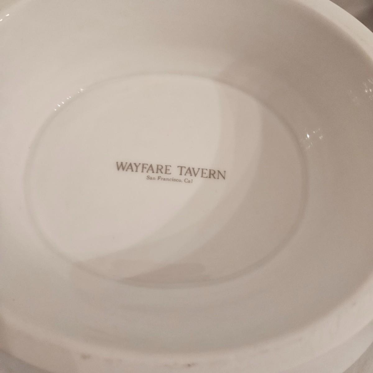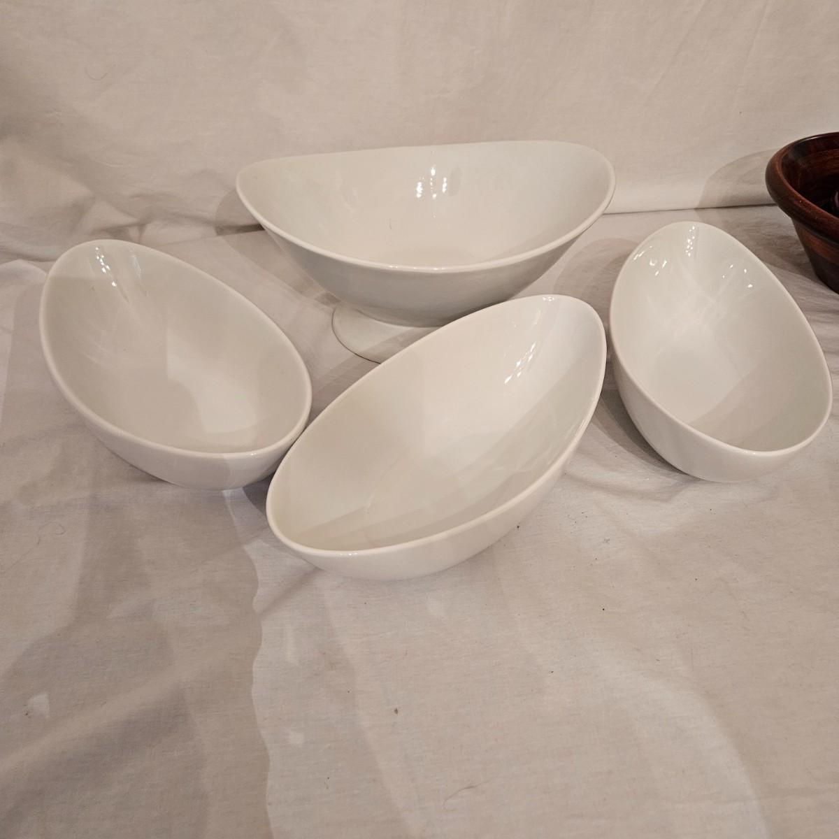A mix of kitchen entertainment items made of ceramics and wood. Included are a set of three ceramic platters and one footed ceramic bowl by Wayfare Tavern that measures approximately 12" x 9" x 5.5" H. There are also eight ceramic dipping saucers by Delallo, a wooden salad bowl, a wooden spoon, four wooden salad bowls, and a pair of 'Chase' salad forks. Shipping available