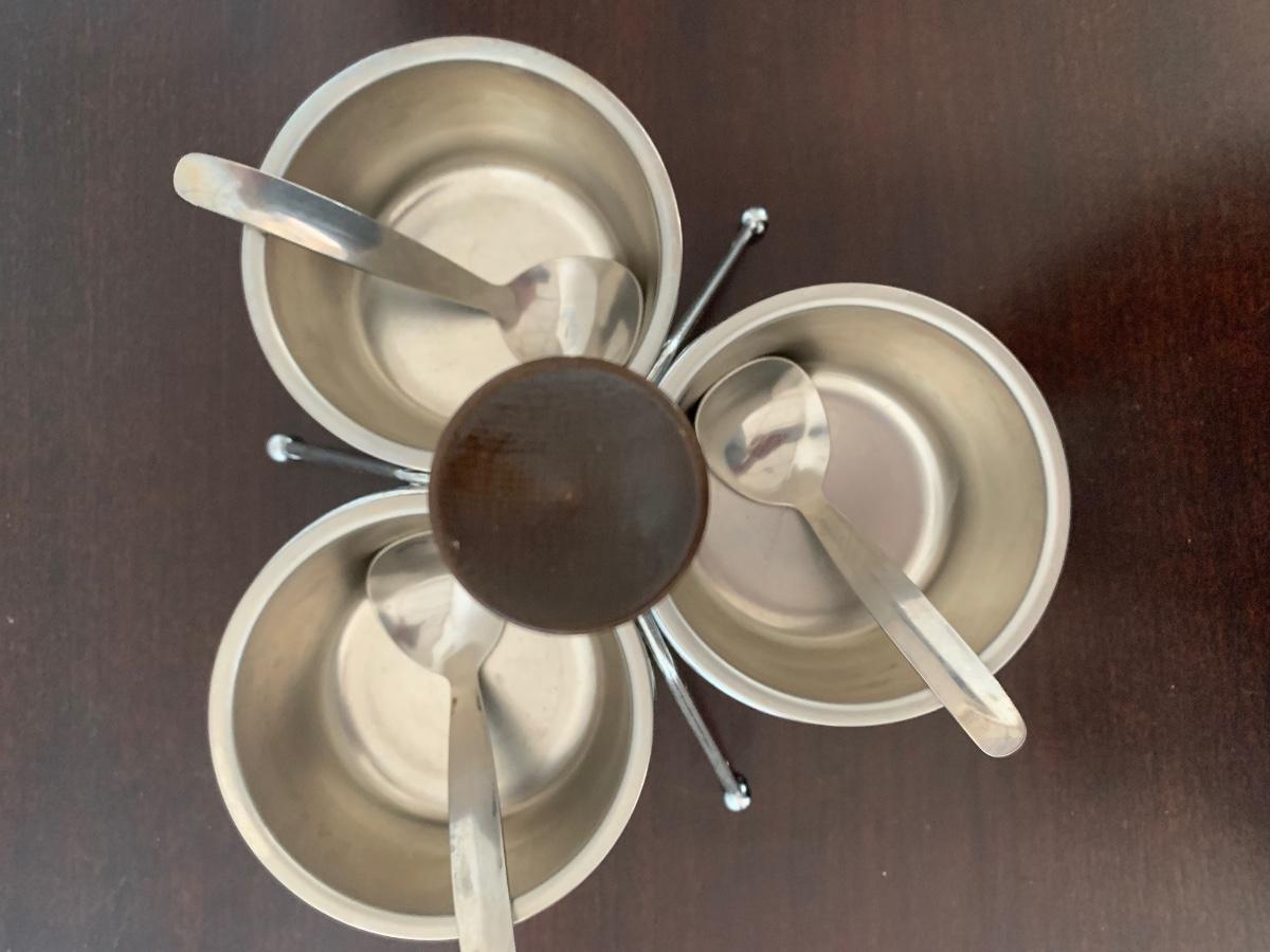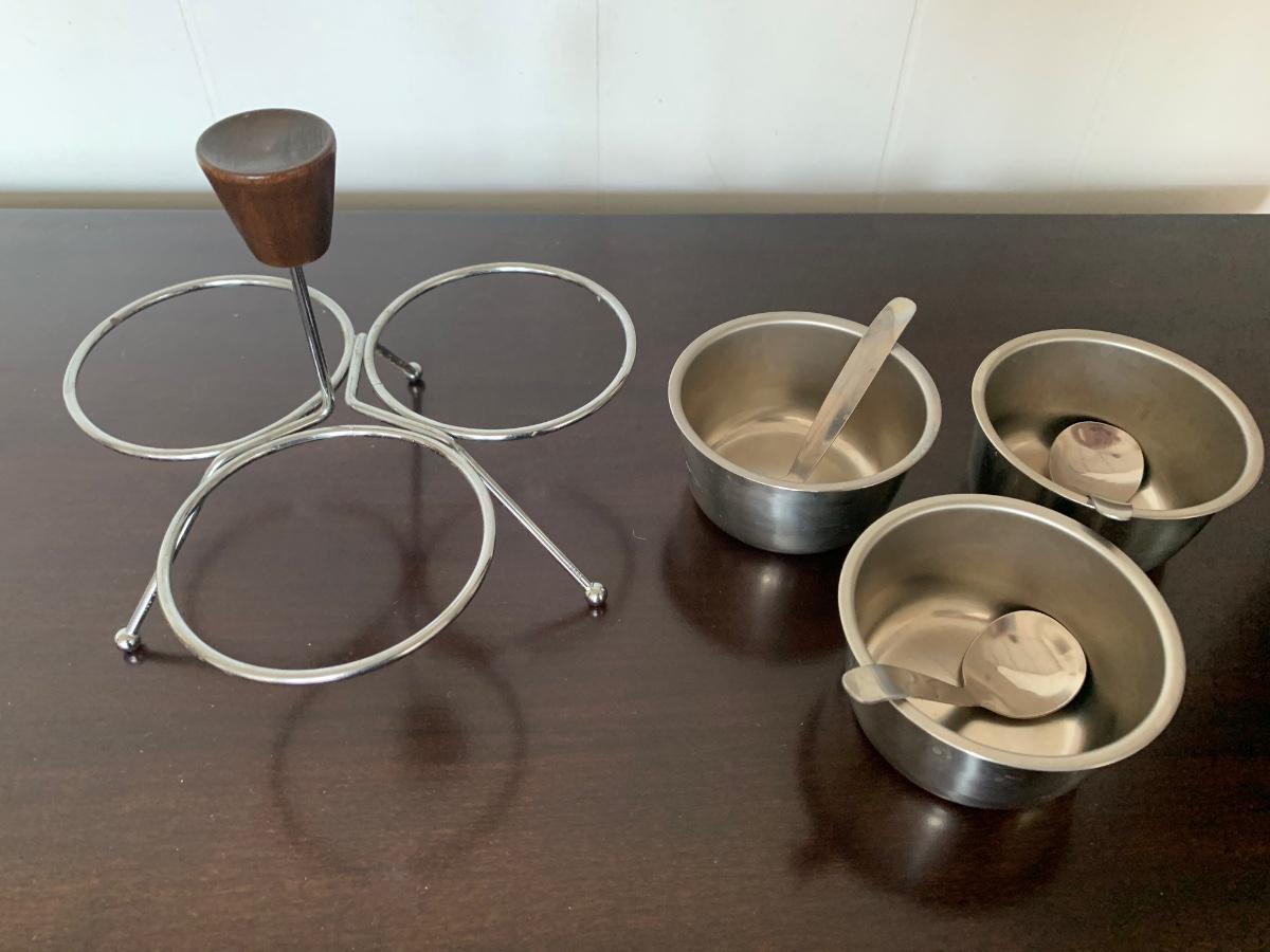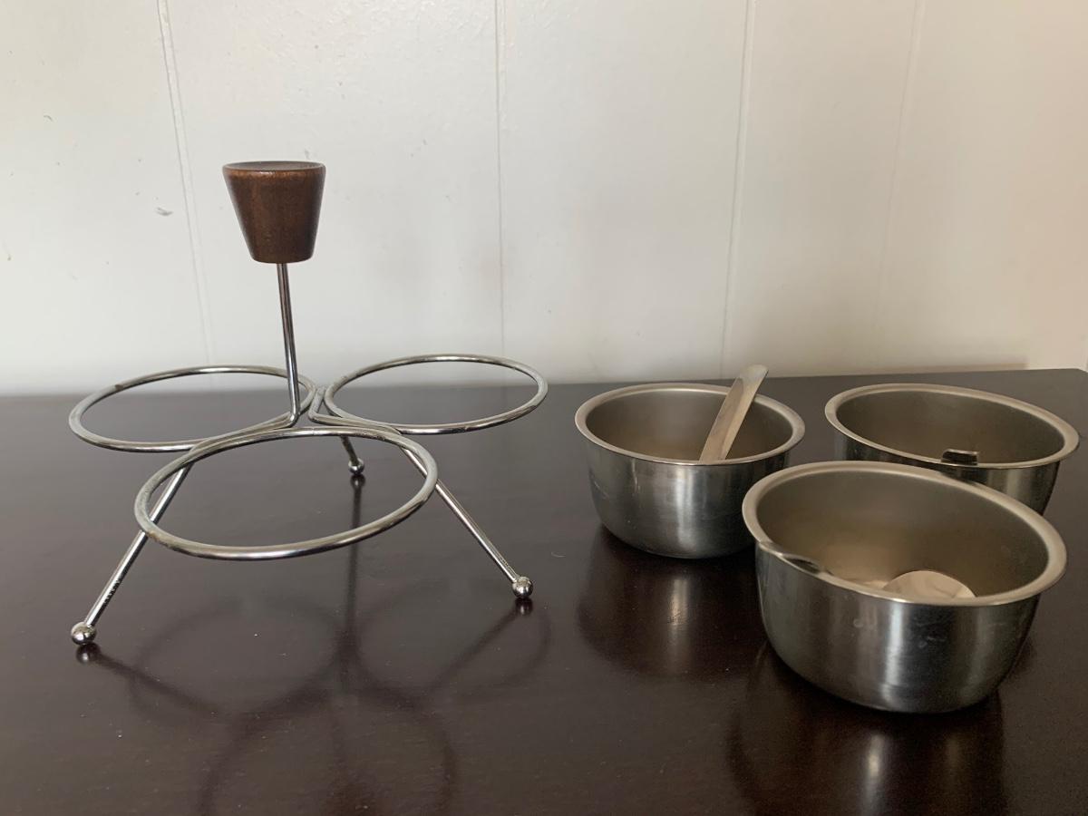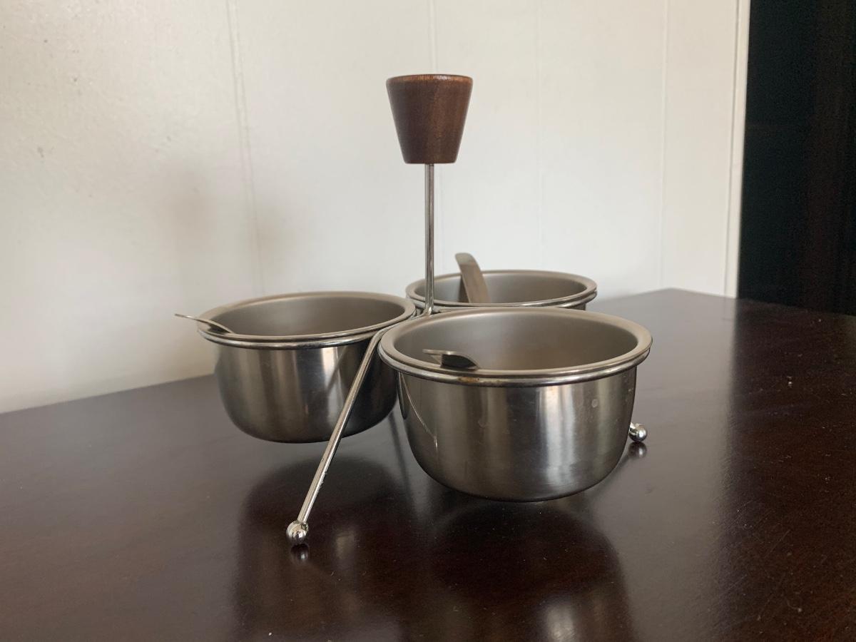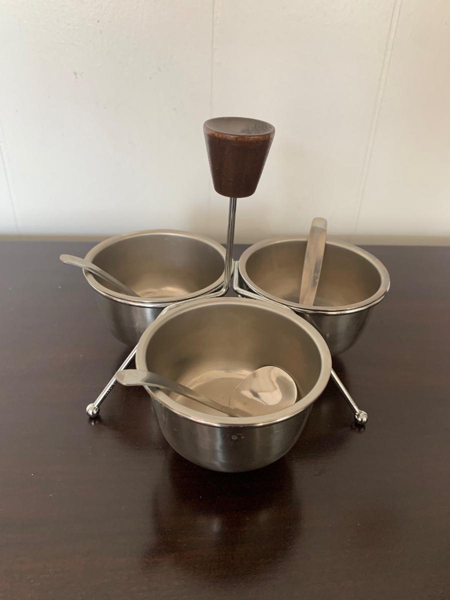MCM Condiment Relish 3-Bowl Serving Caddy with Three Spoons & Wood Handle