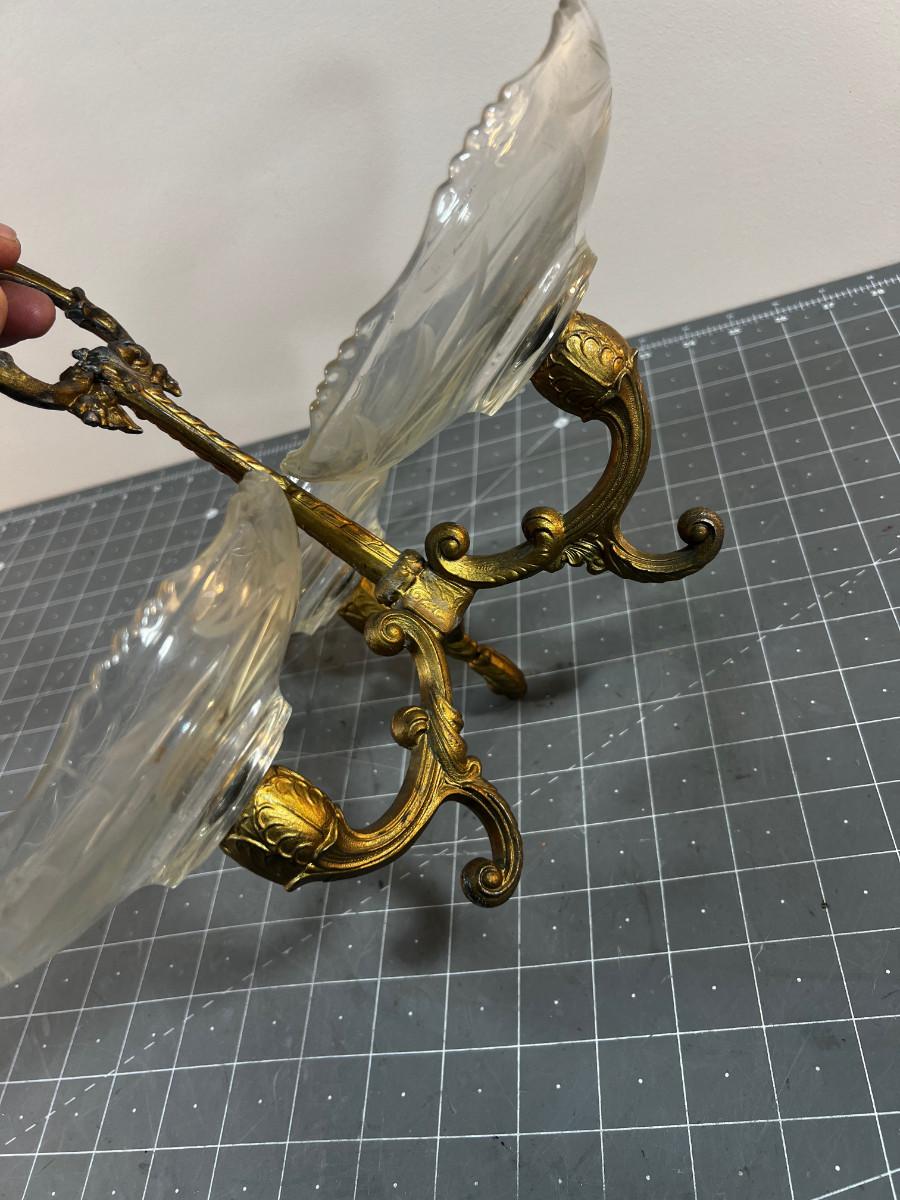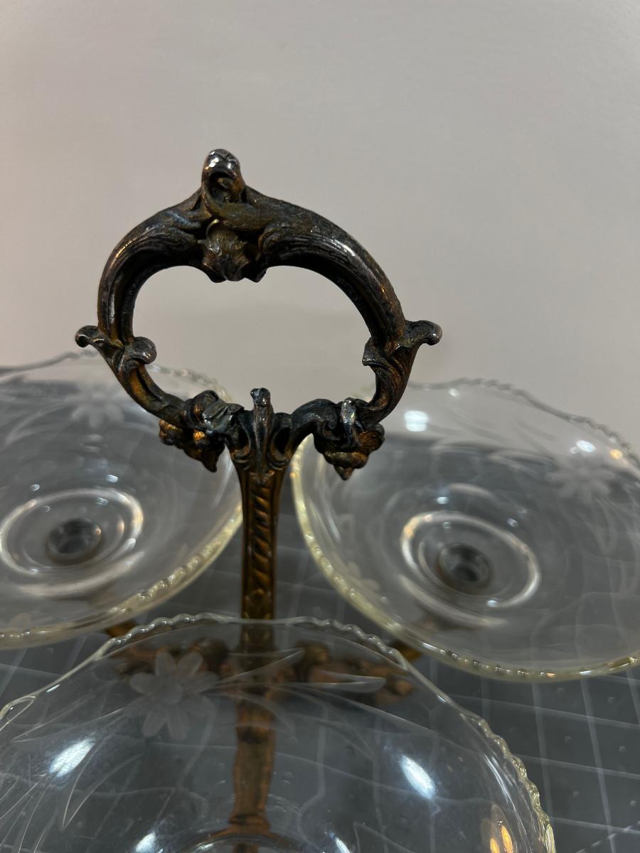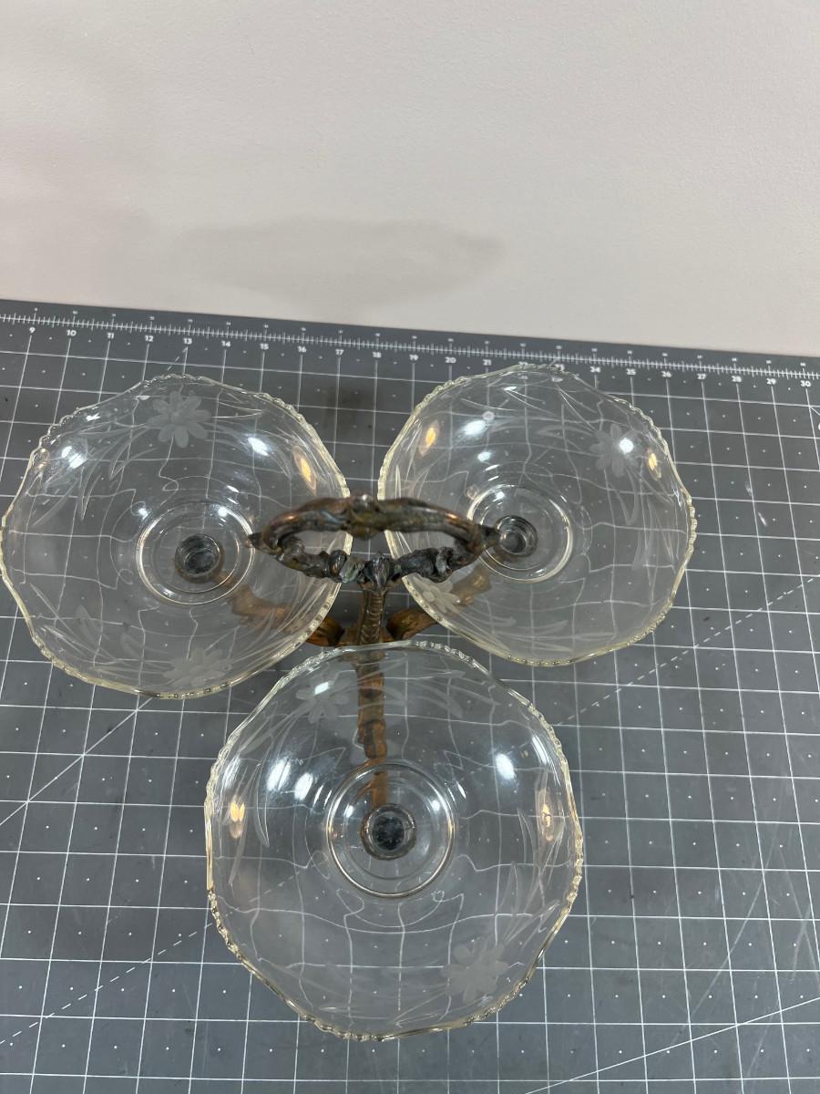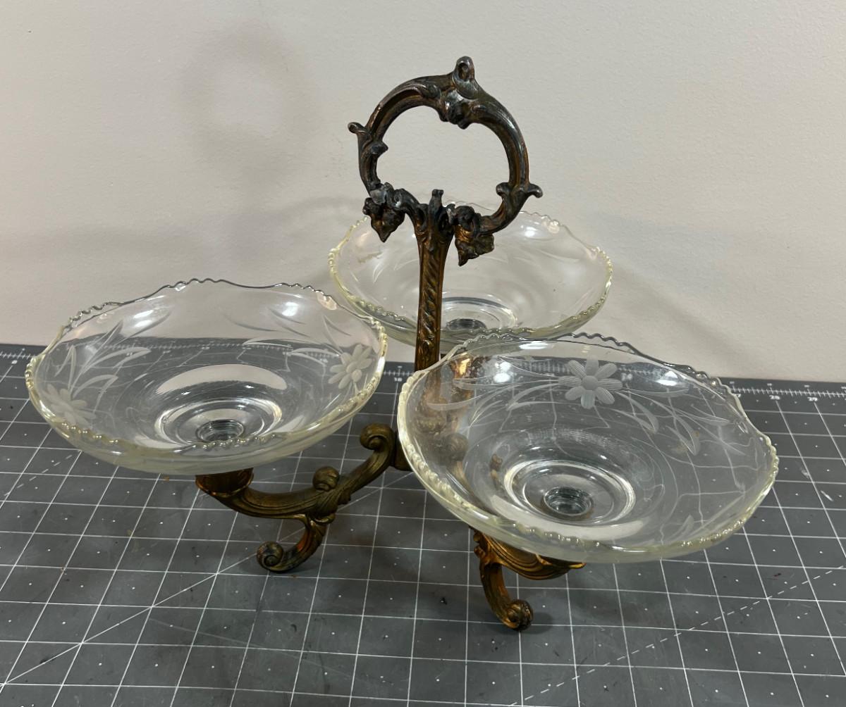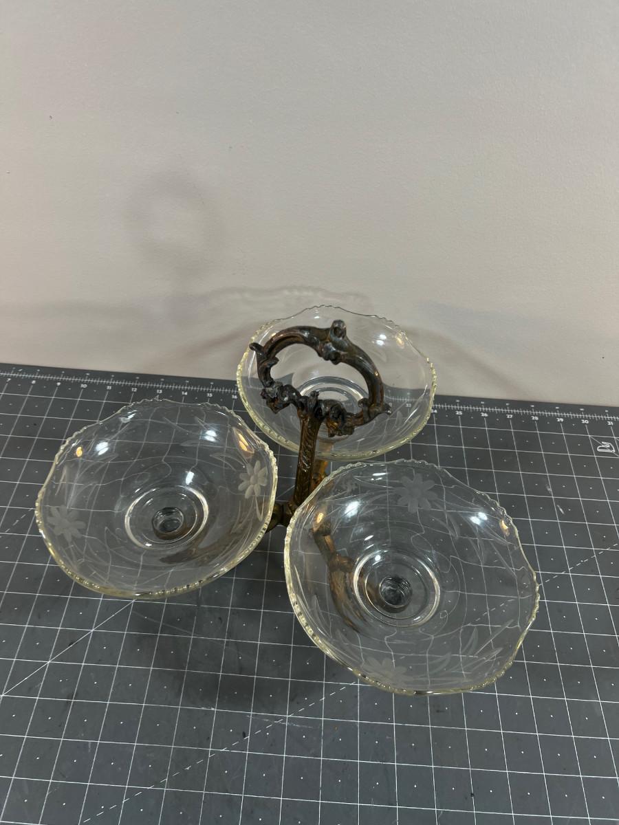 Serving Dish or Tray Cast Metal with 3 Glass Dishes, Etched