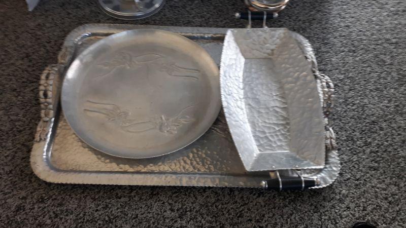 TRAYS, GLASS DECANTER/PITCHER, CRYSTAL COASTERS TRIMMED WITH SILVER