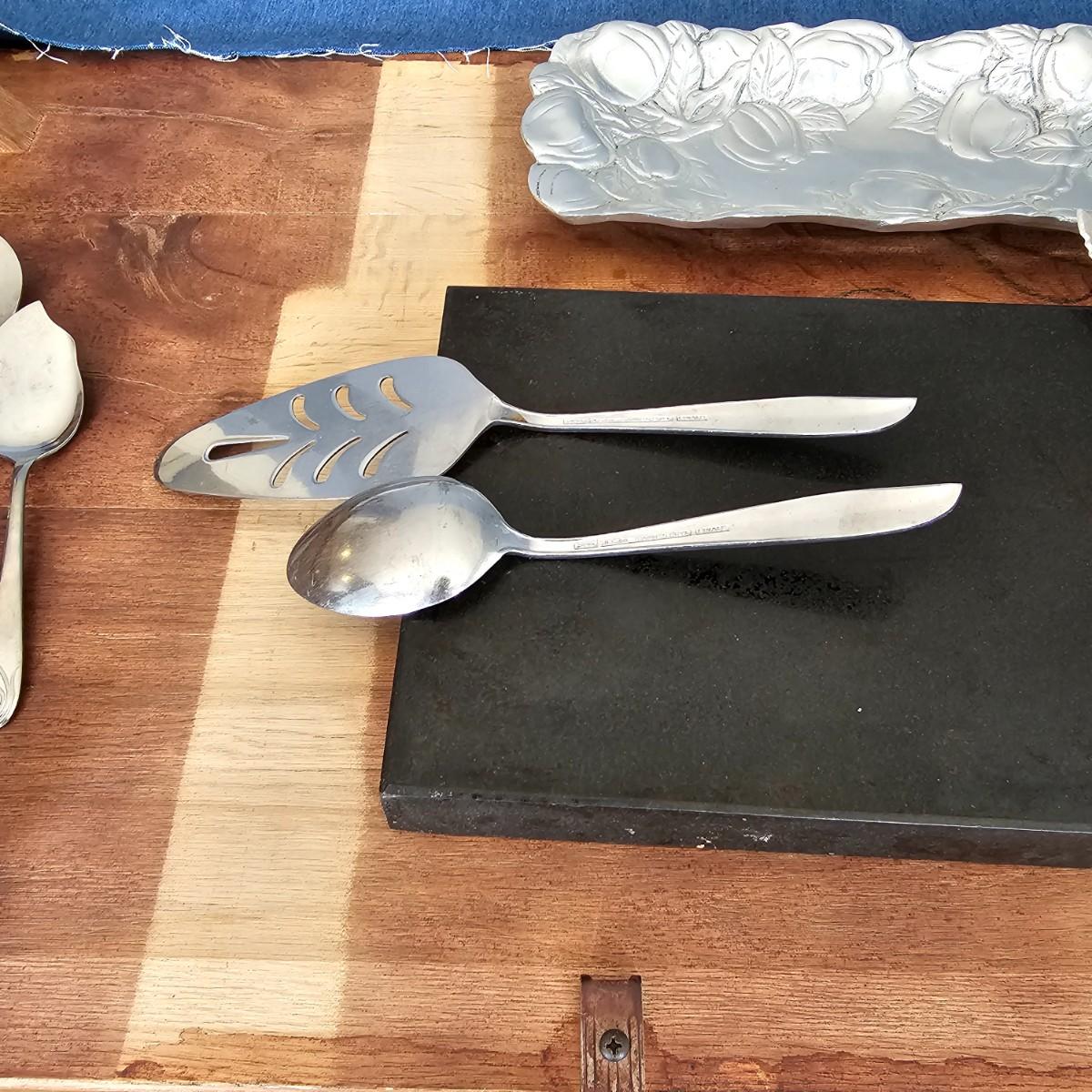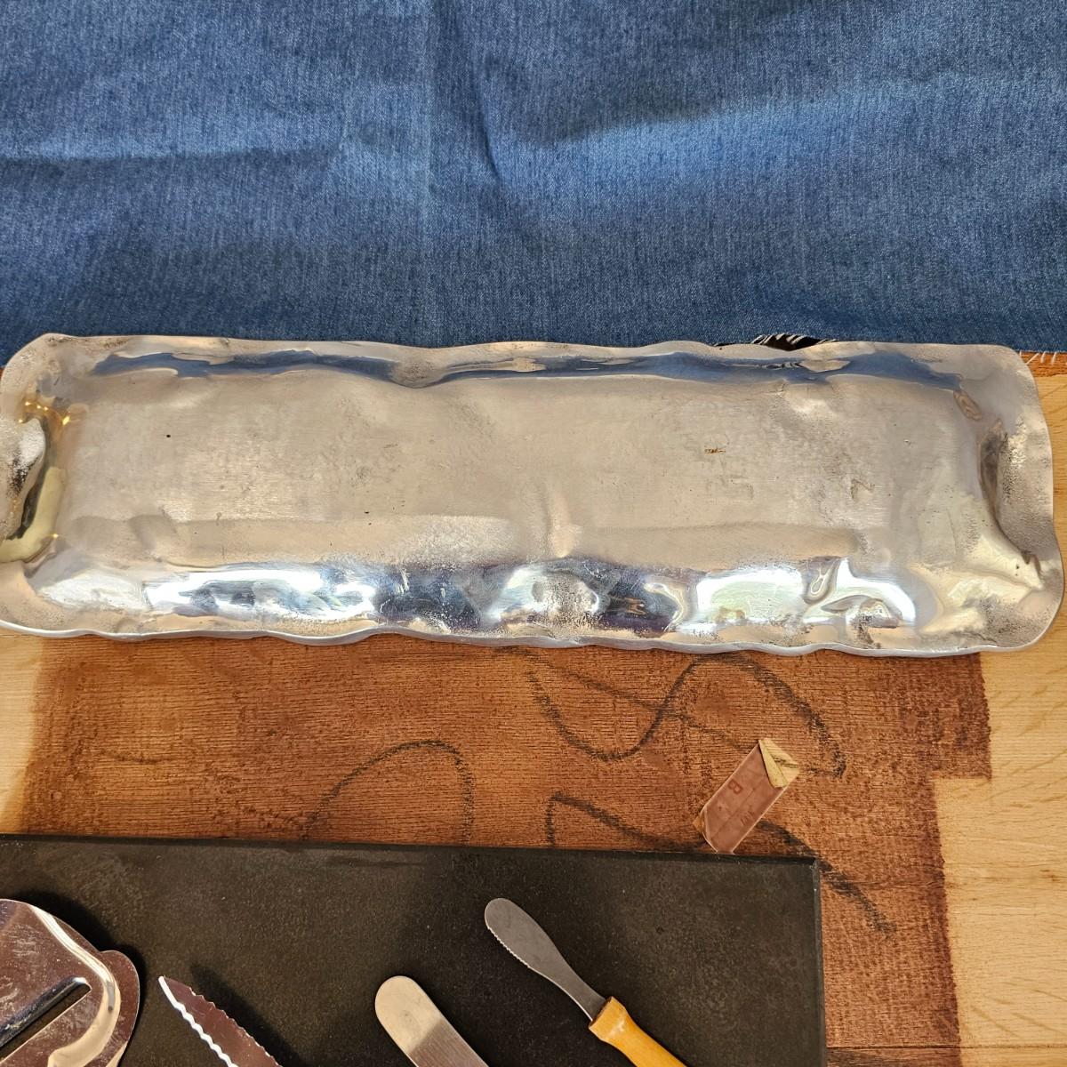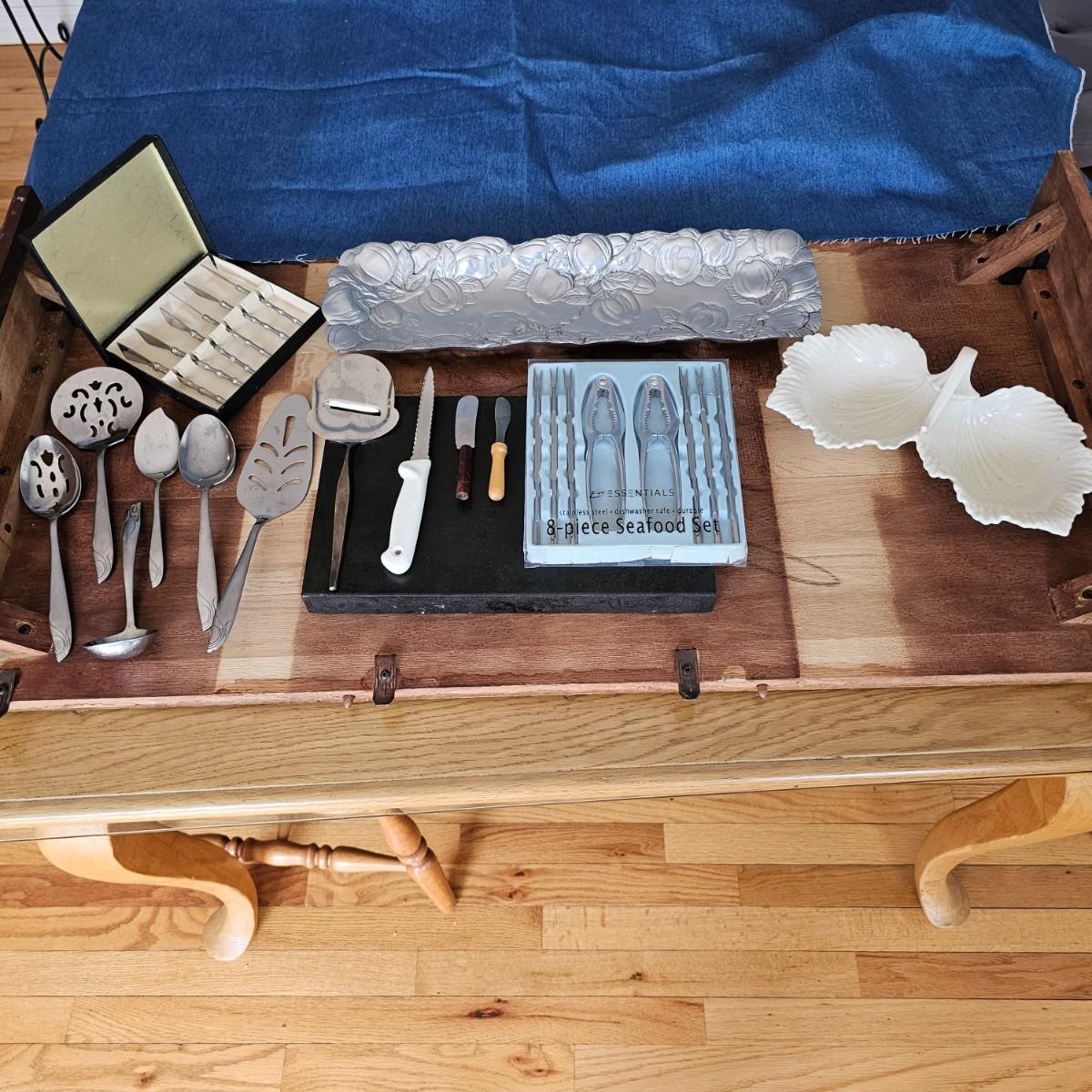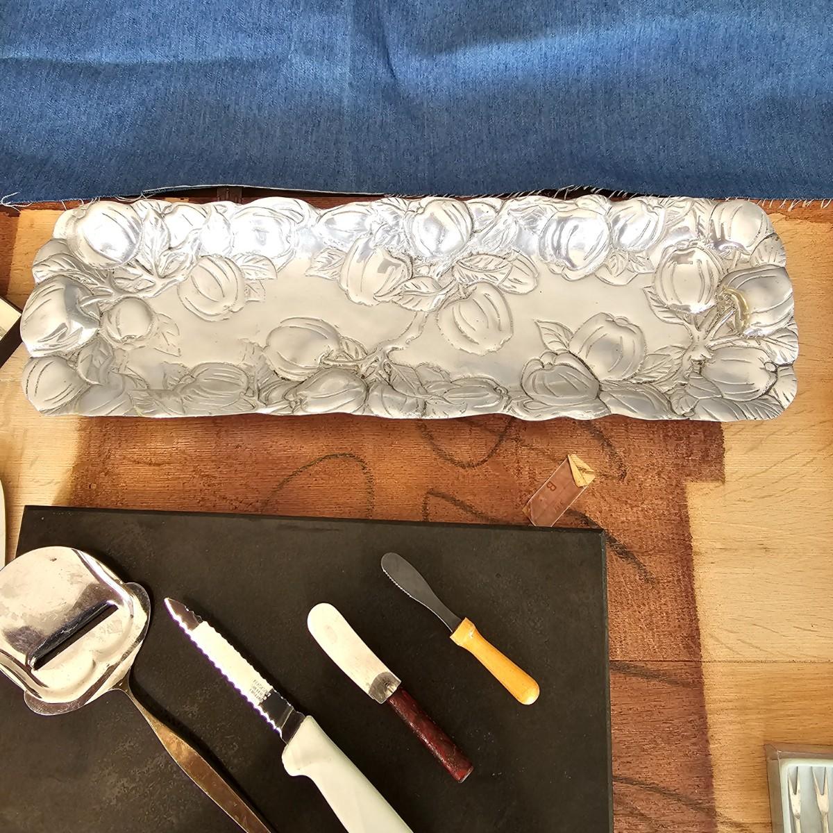 Unique assortment of serving items. The main serving pieces are stainless, the cheese sampler is Lanard silverplate from Holland. The two leaf handled serving bowl is Lenox. Long floral/fruit tray is aluminum, measures 17.5" x 5". Marble cutting board is 12" x 7.5" x 1.5"H. Also includes a seafood set and a box with six small twig handles knives. See photos for details. Local Pick Up Only.