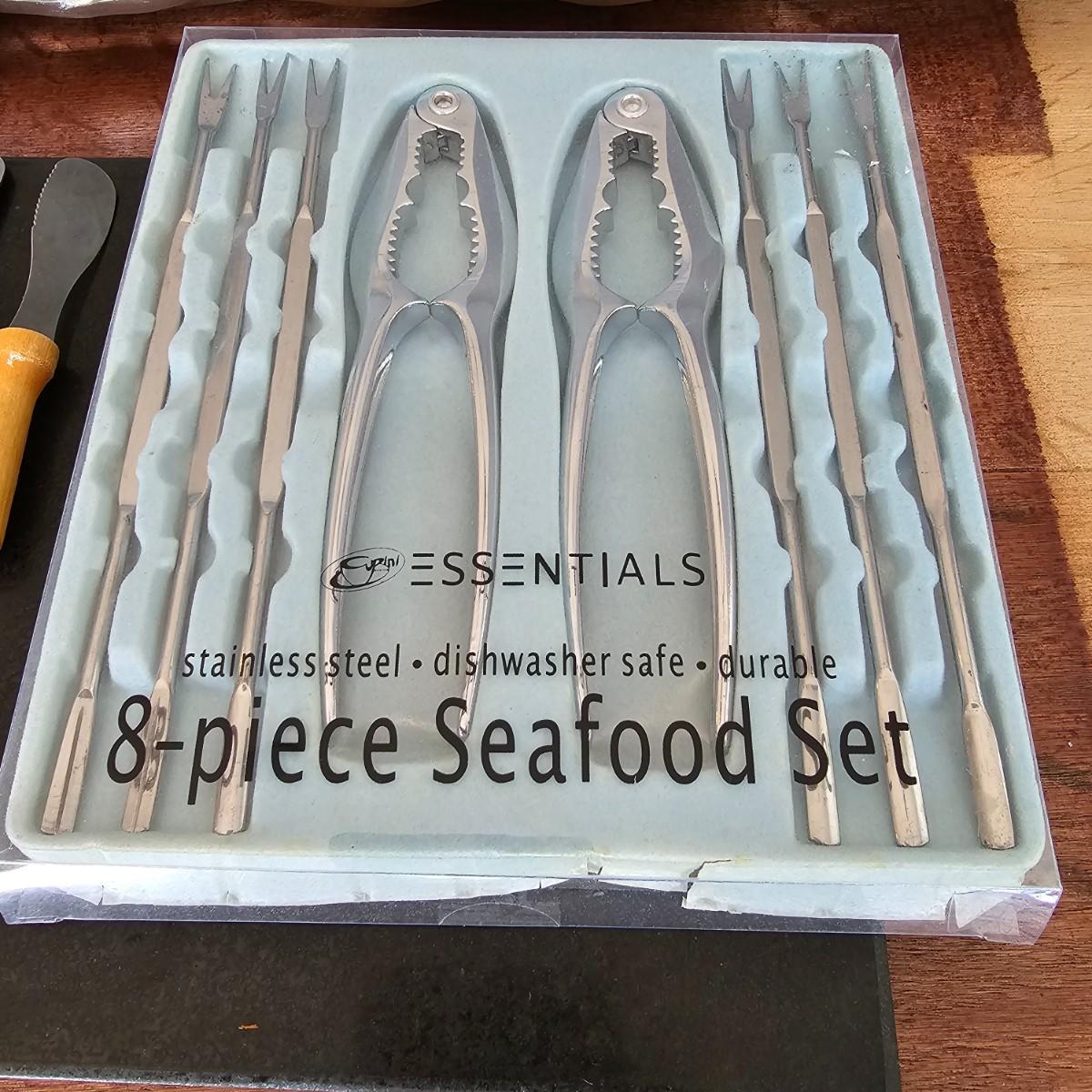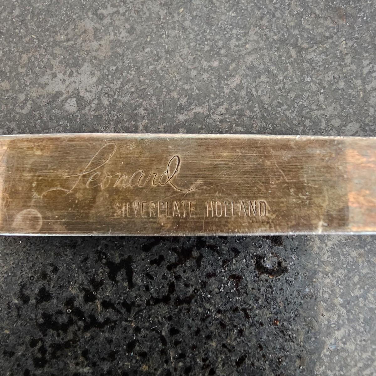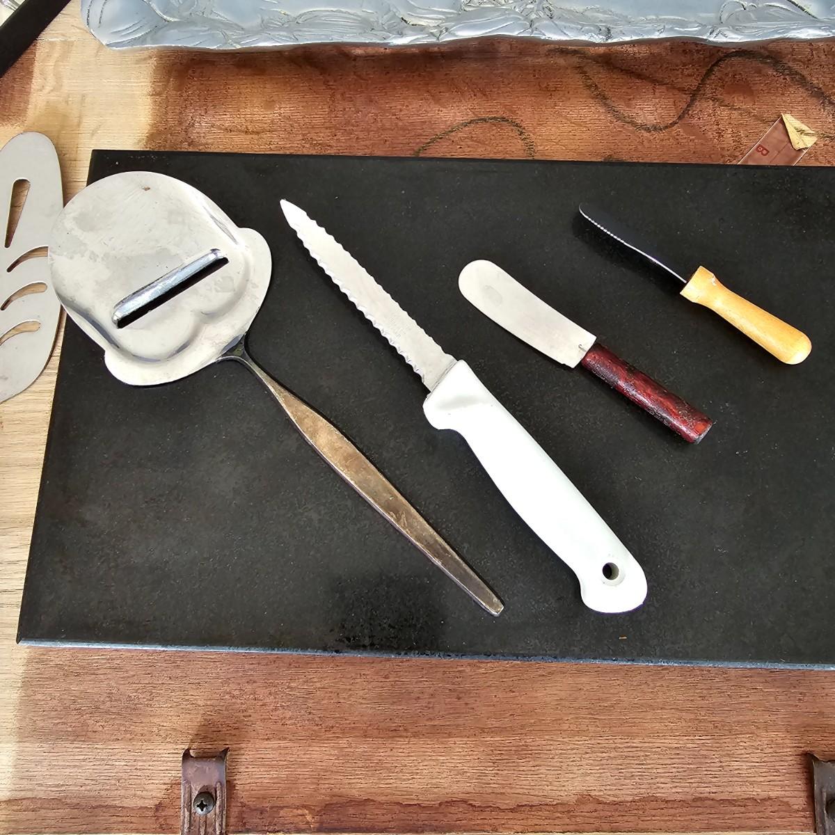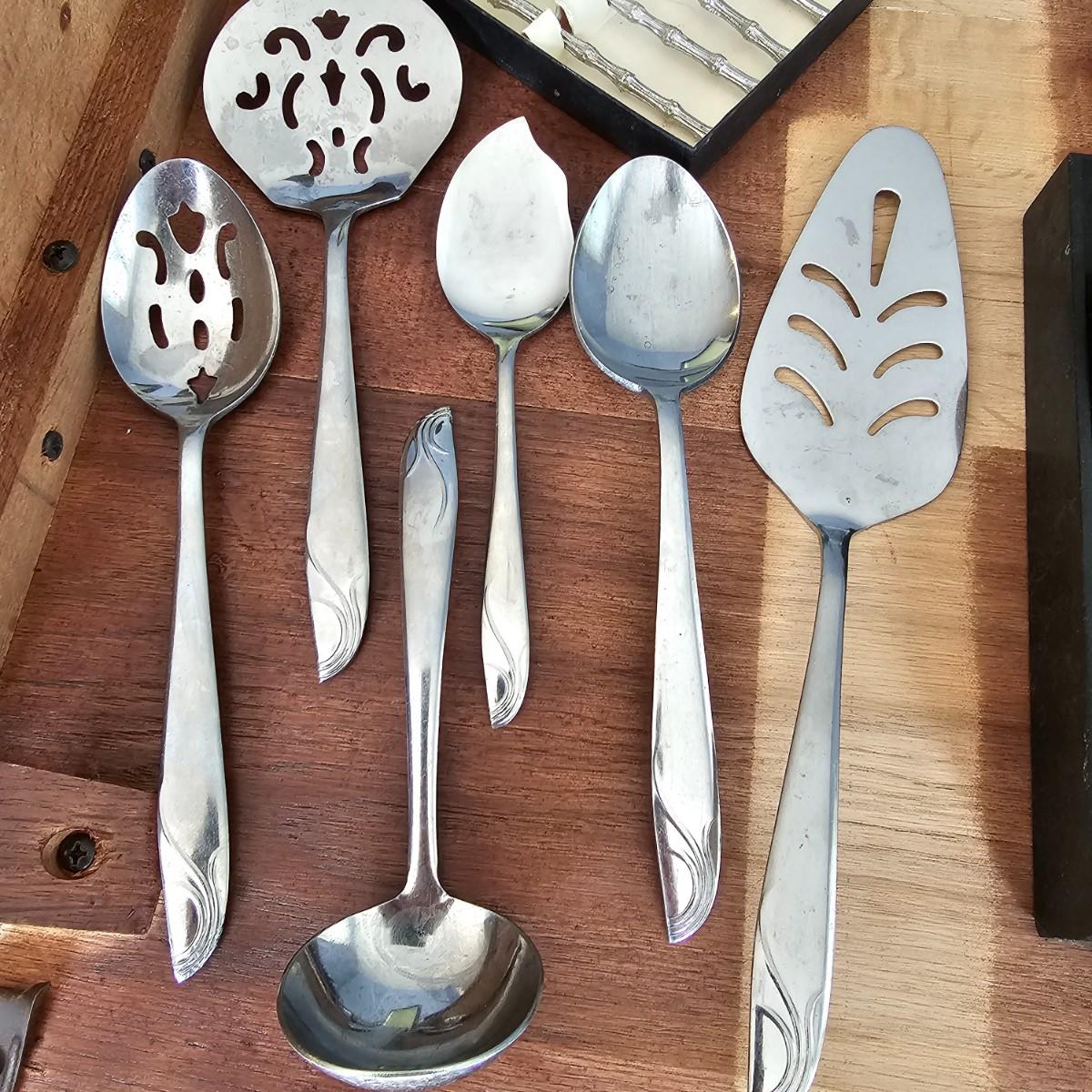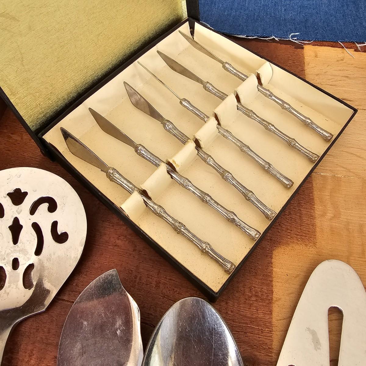 Unique assortment of serving items. The main serving pieces are stainless, the cheese sampler is Lanard silverplate from Holland. The two leaf handled serving bowl is Lenox. Long floral/fruit tray is aluminum, measures 17.5" x 5". Marble cutting board is 12" x 7.5" x 1.5"H. Also includes a seafood set and a box with six small twig handles knives. See photos for details. Local Pick Up Only.