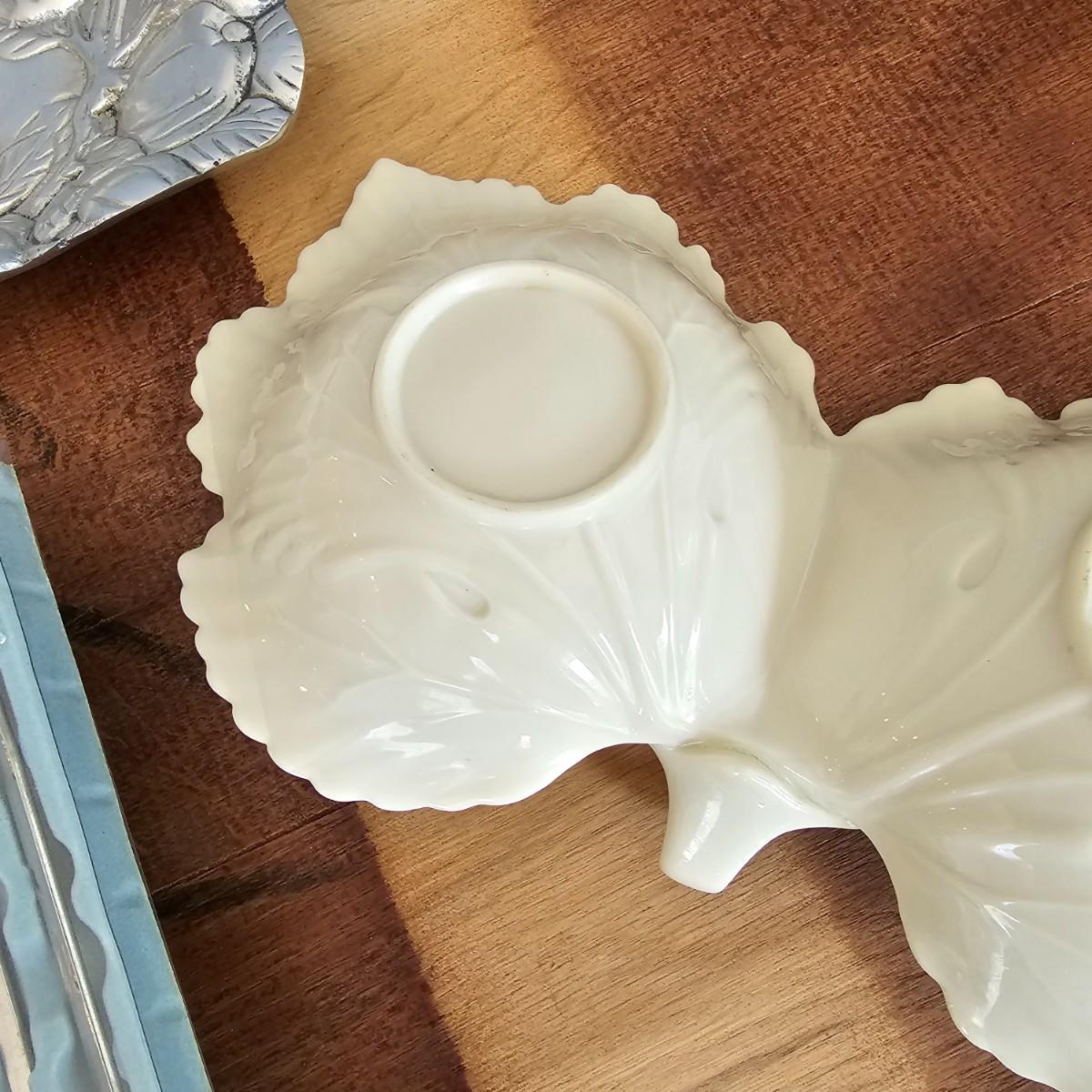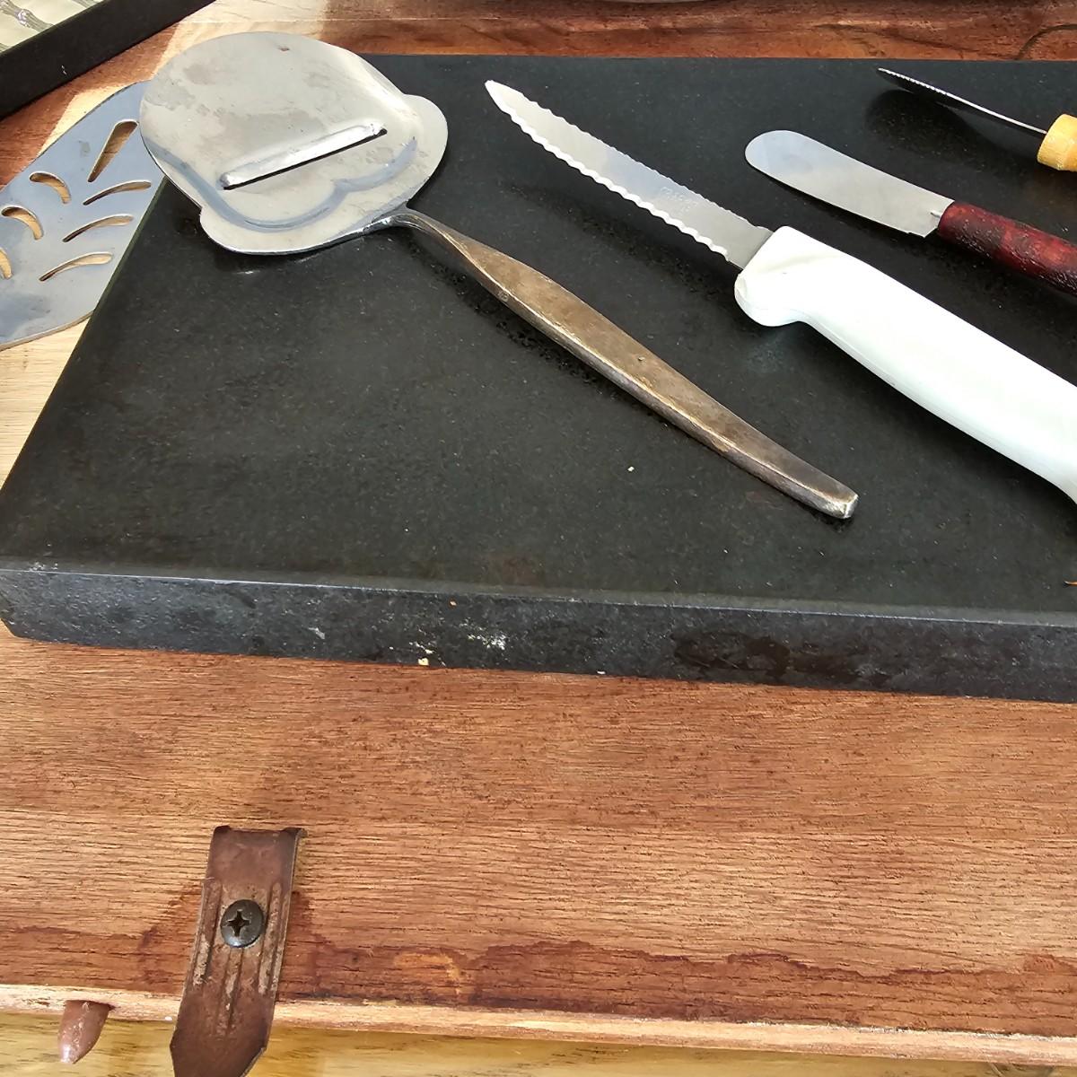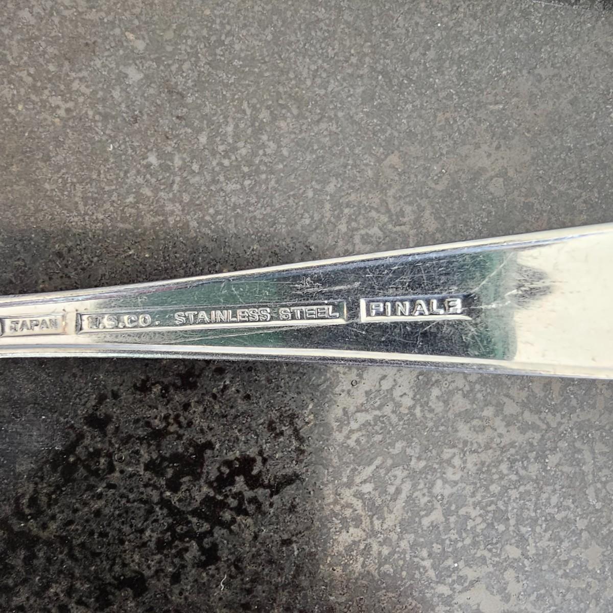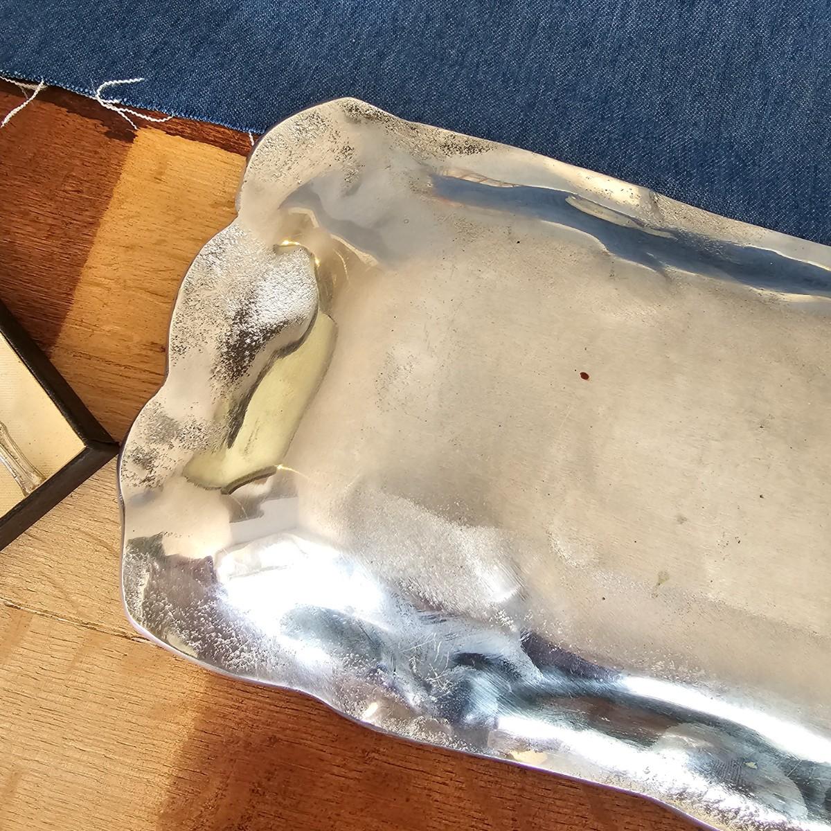 Unique assortment of serving items. The main serving pieces are stainless, the cheese sampler is Lanard silverplate from Holland. The two leaf handled serving bowl is Lenox. Long floral/fruit tray is aluminum, measures 17.5" x 5". Marble cutting board is 12" x 7.5" x 1.5"H. Also includes a seafood set and a box with six small twig handles knives. See photos for details. Local Pick Up Only.