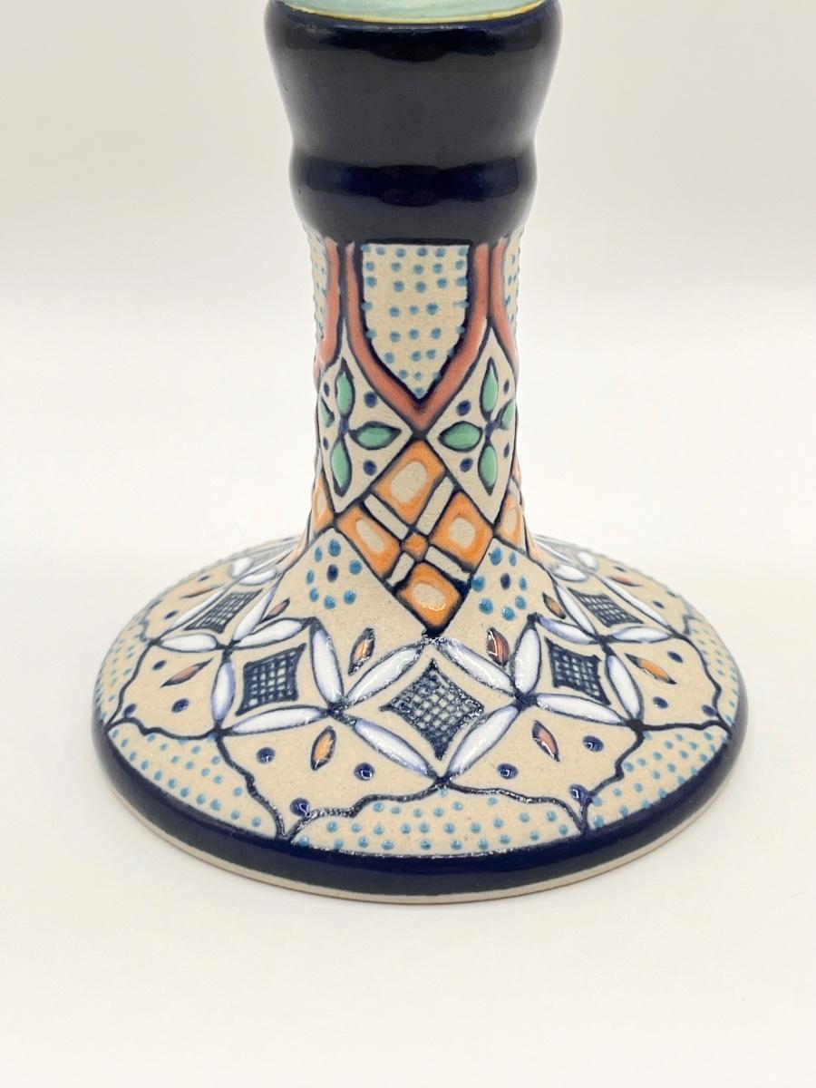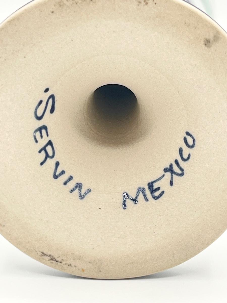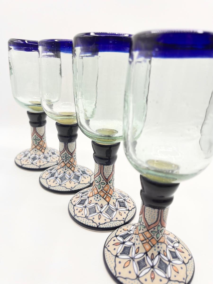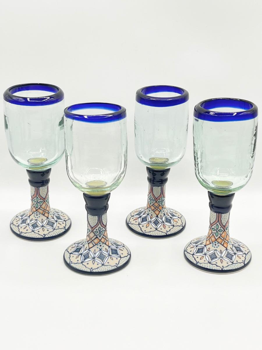 SERVIN MEXICO ~ Hand Blown Glass & Hand Painted Ceramic Base Set Of Four (4) Wine Glasses