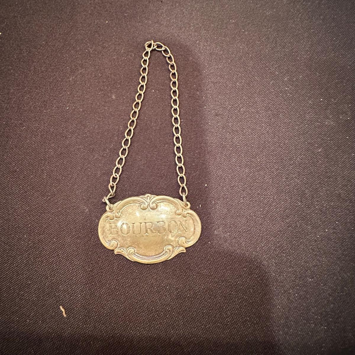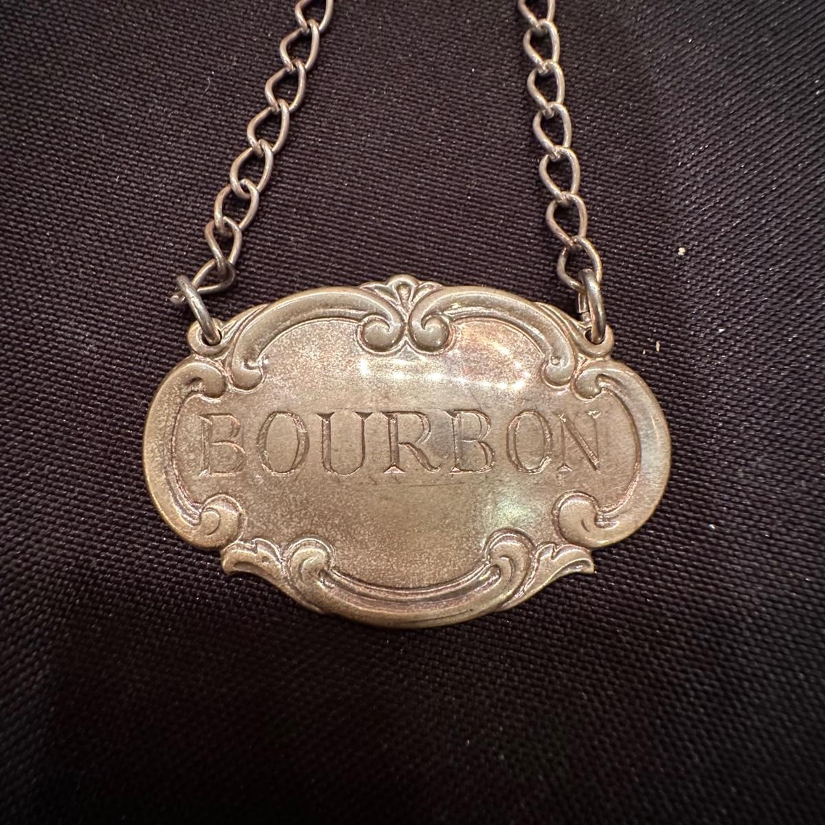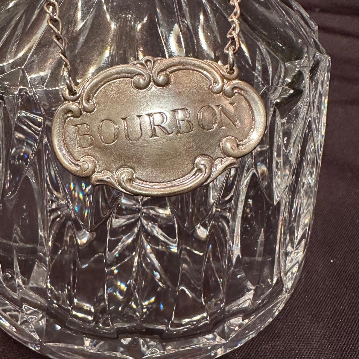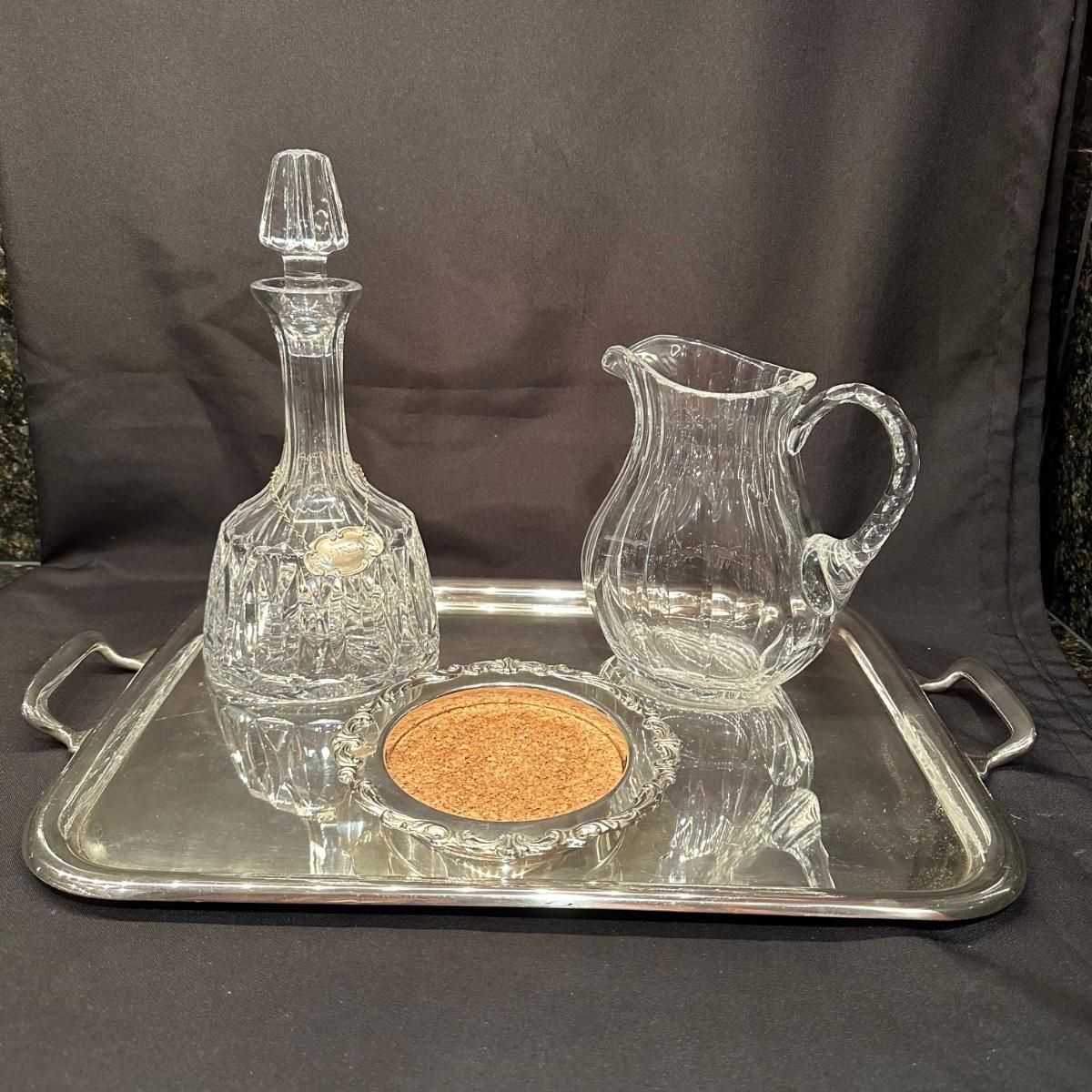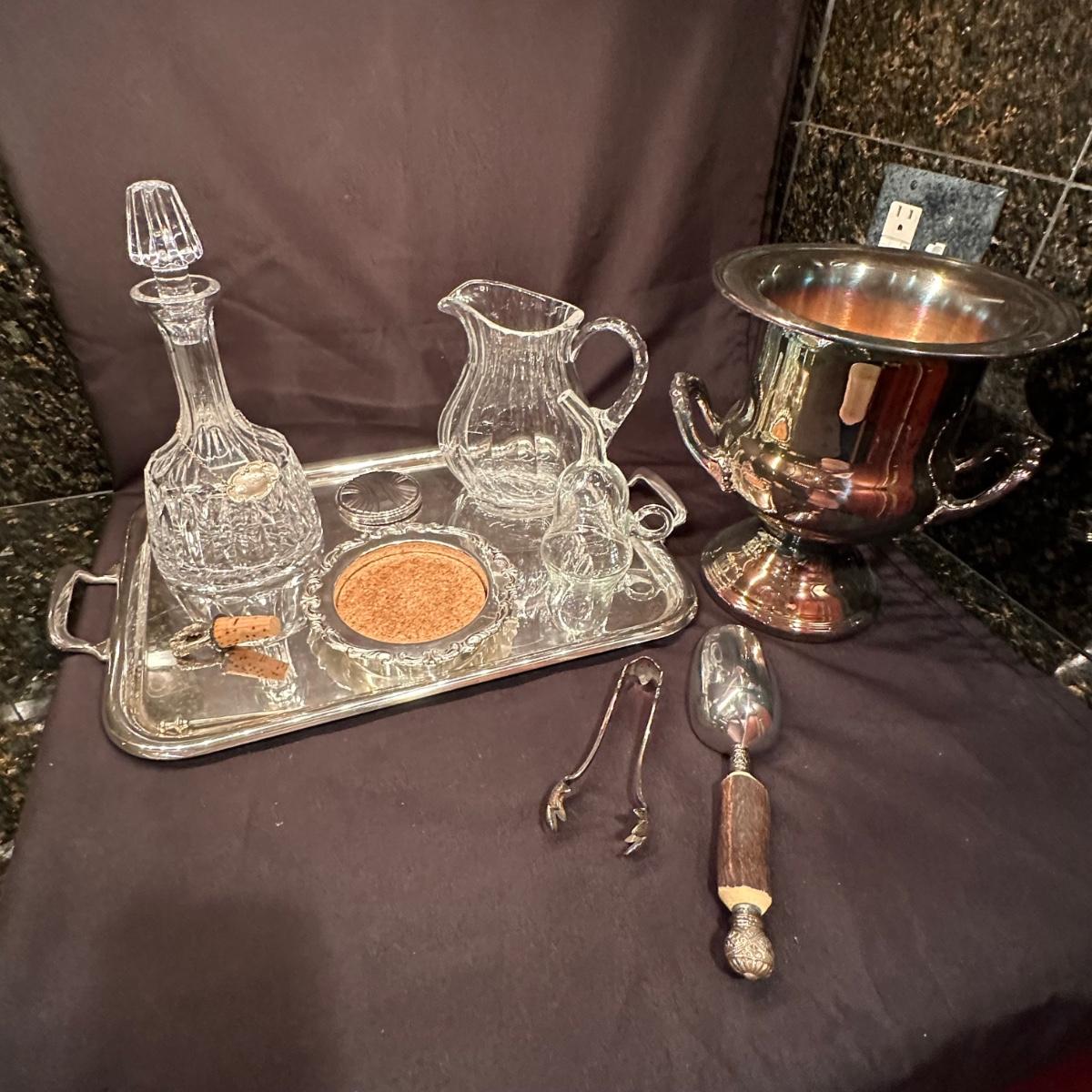 Serving tray with carved glass bourbon decanter, Tiffany silver stamped “Bourbon” tag, carved glass pitcher, silver stamped corked glass cover. Ice bucket is stamped and appears to be silver plated. It is engraved on one side and measures 10”H. Tray measures 20.5” x 13.25” x 1”H. Other accessories include wine cork, ice tongs and ice scoop. Shipping available.