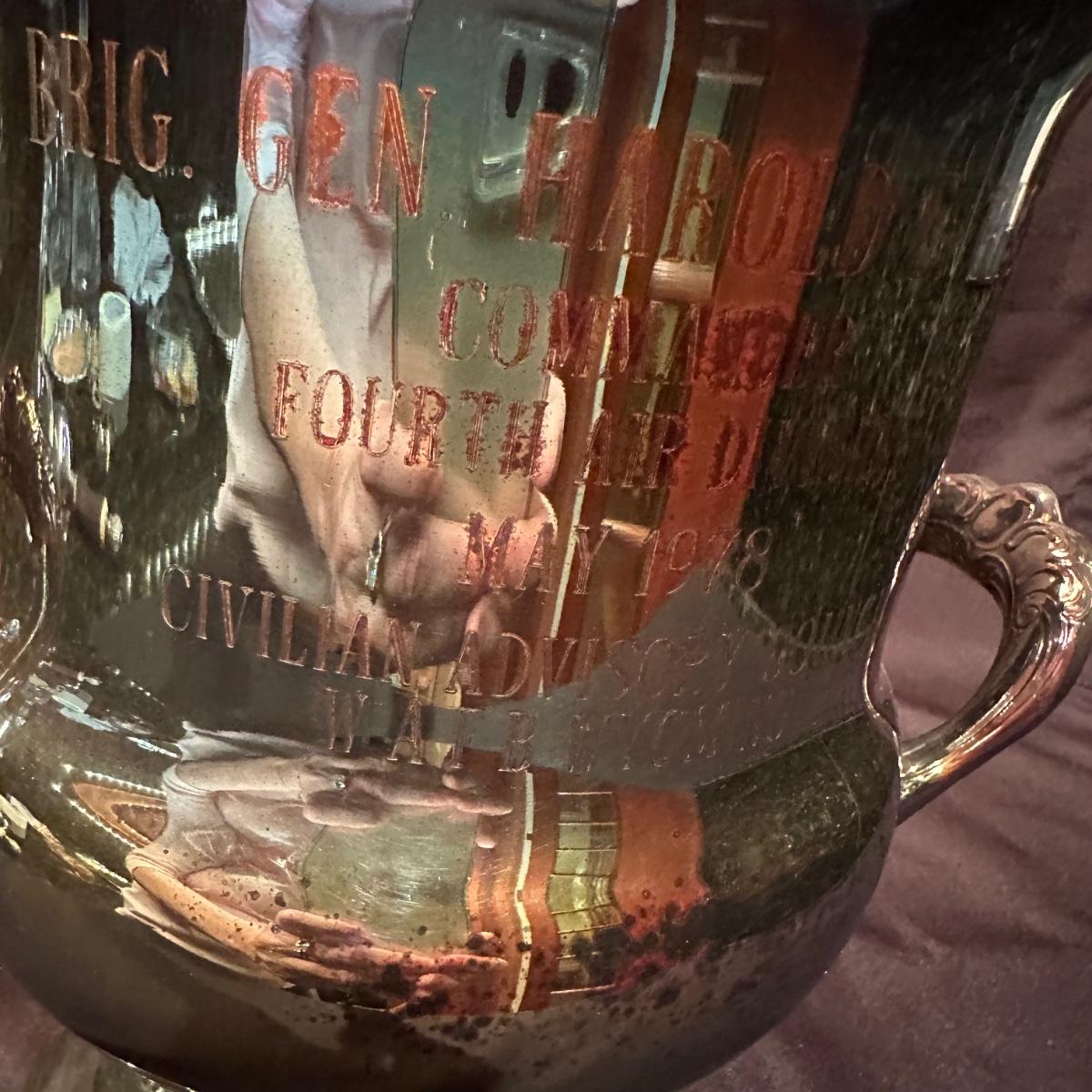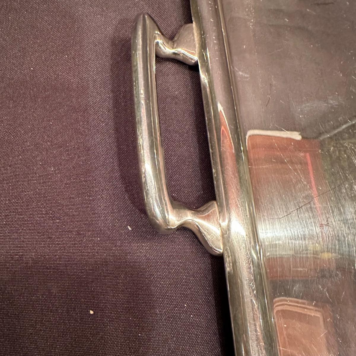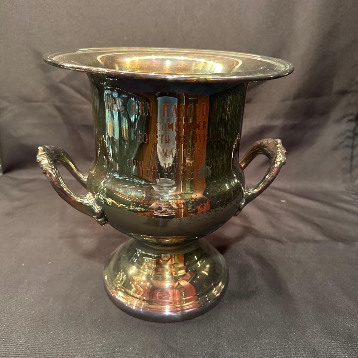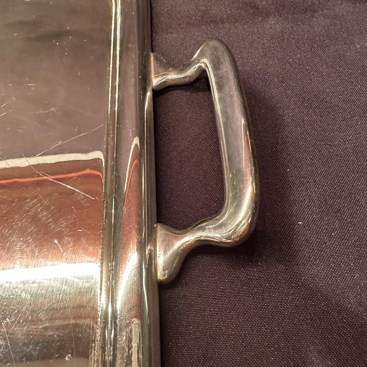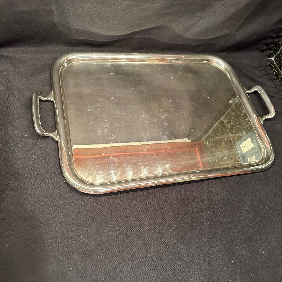 Serving tray with carved glass bourbon decanter, Tiffany silver stamped “Bourbon” tag, carved glass pitcher, silver stamped corked glass cover. Ice bucket is stamped and appears to be silver plated. It is engraved on one side and measures 10”H. Tray measures 20.5” x 13.25” x 1”H. Other accessories include wine cork, ice tongs and ice scoop. Shipping available.