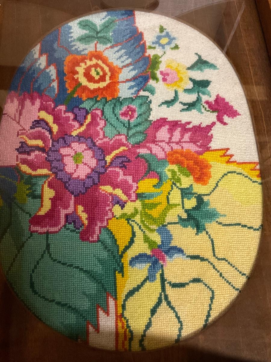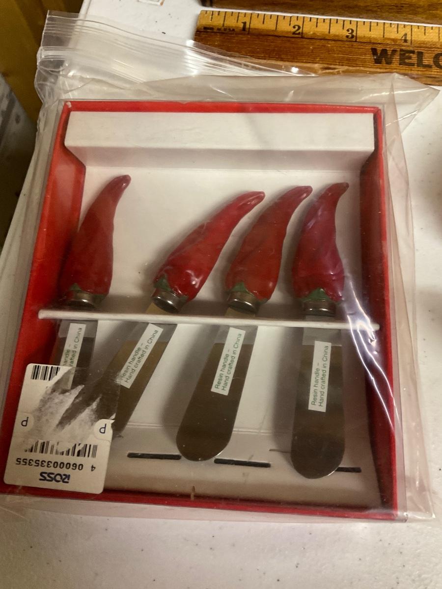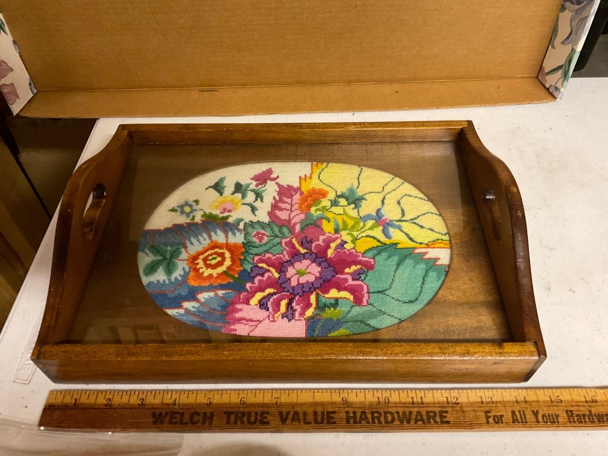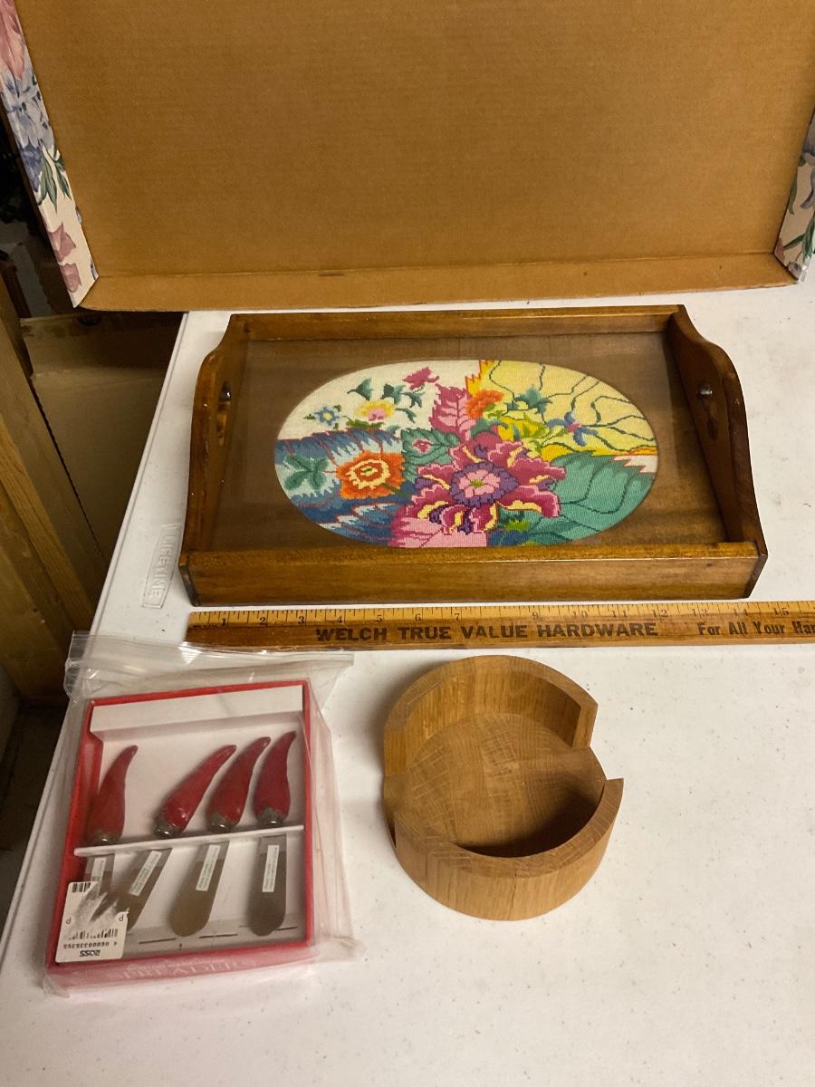 Serving Tray With Cross Stitch In Lay Glass On Top And Hot Pepper Butter Knives