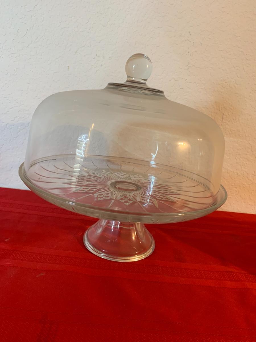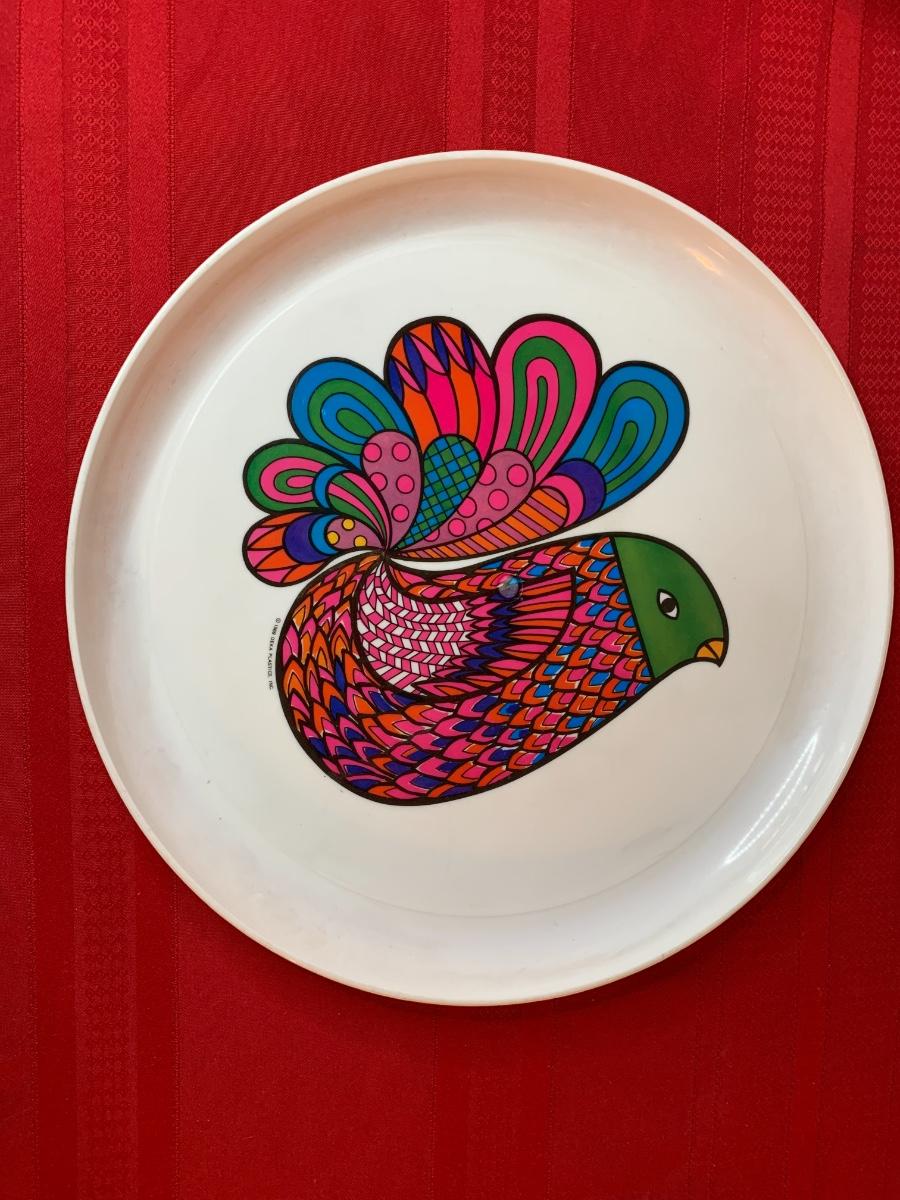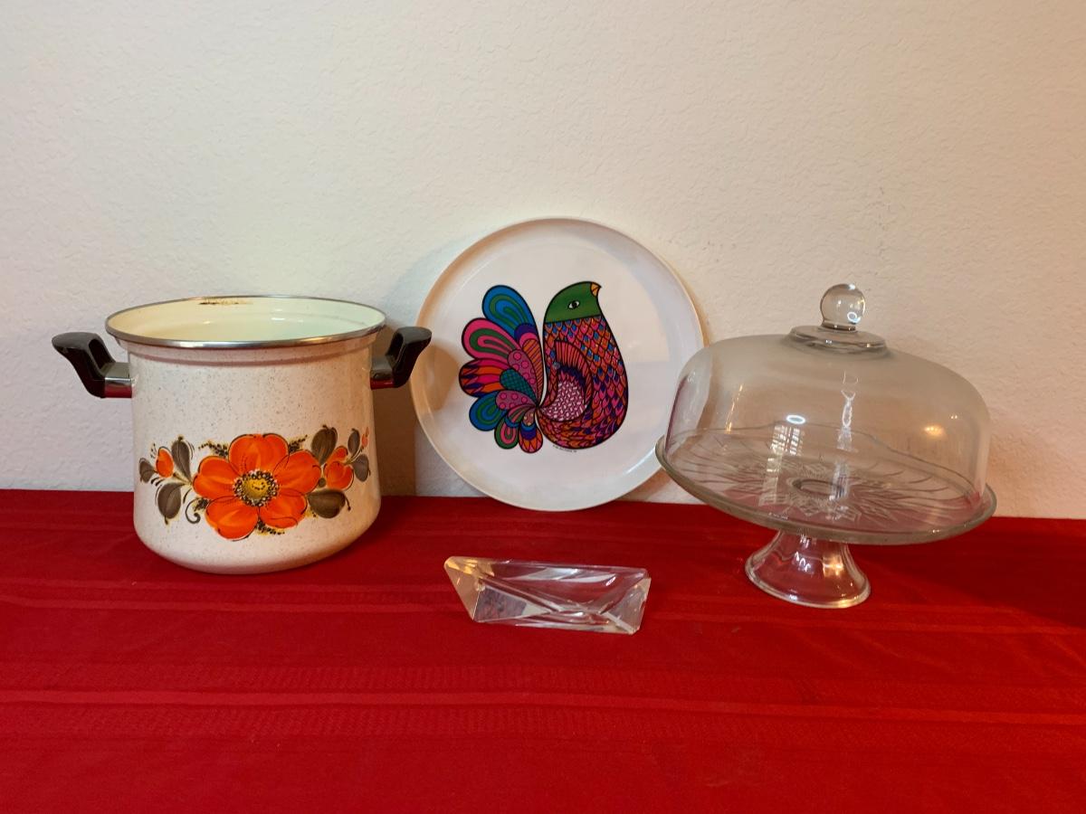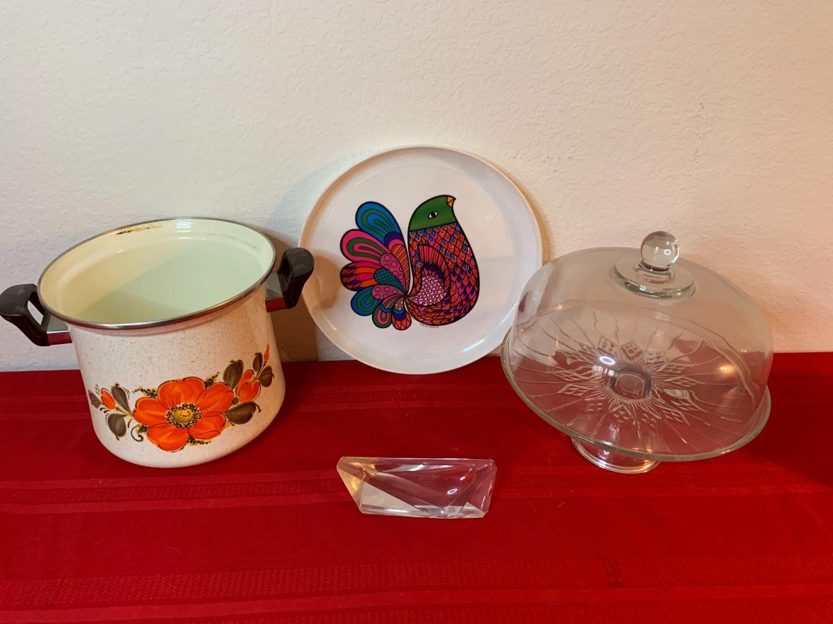 Glass serving ware (cake platter), glass catch all (some chips), 1969 Deka Plastics Bird Tray, and Senko Show-Pans Pot with no lid.