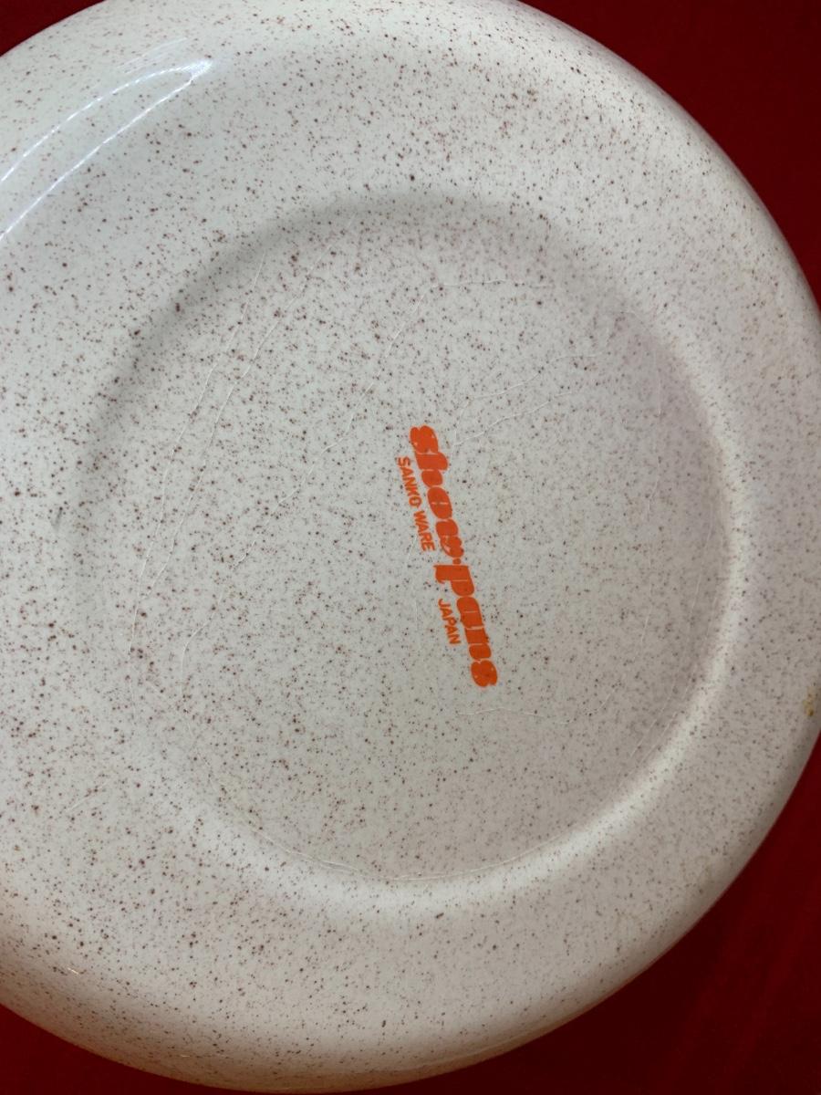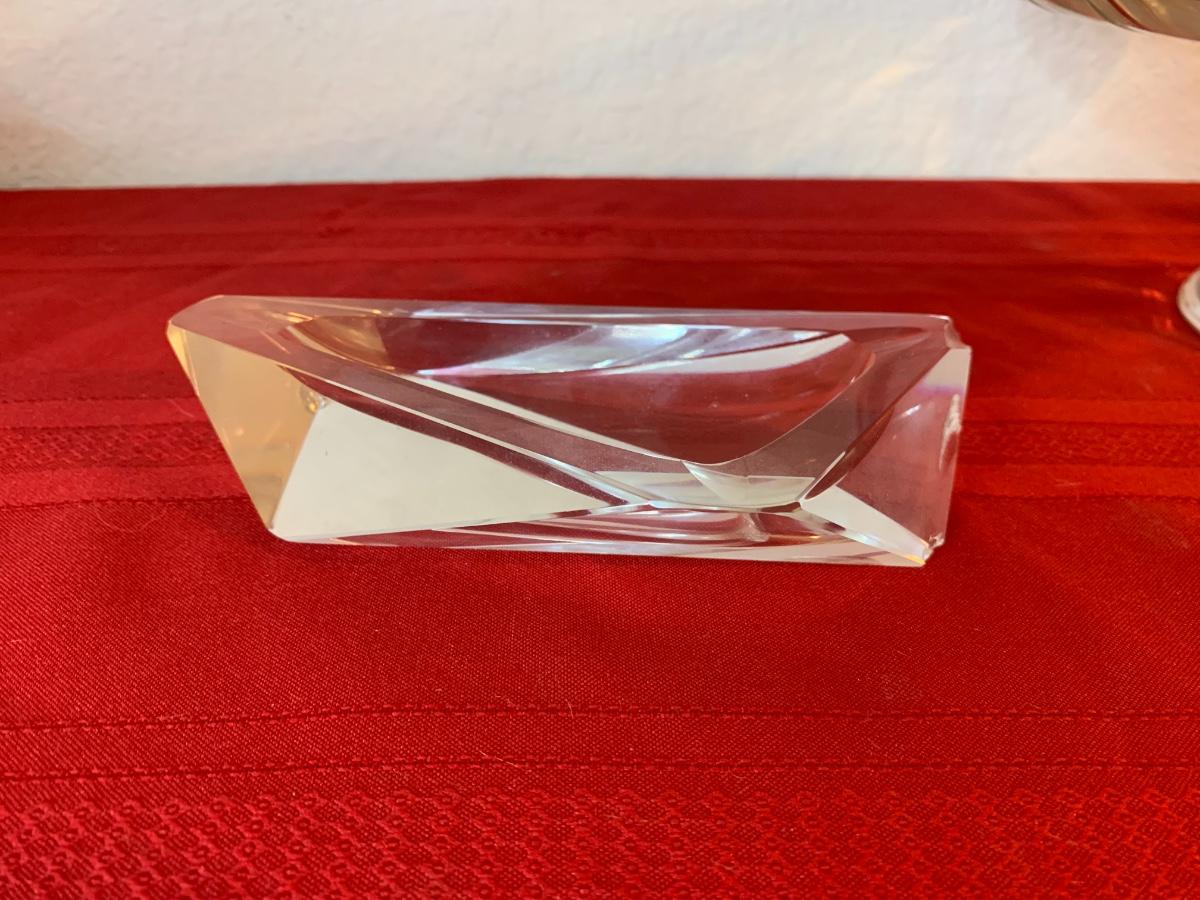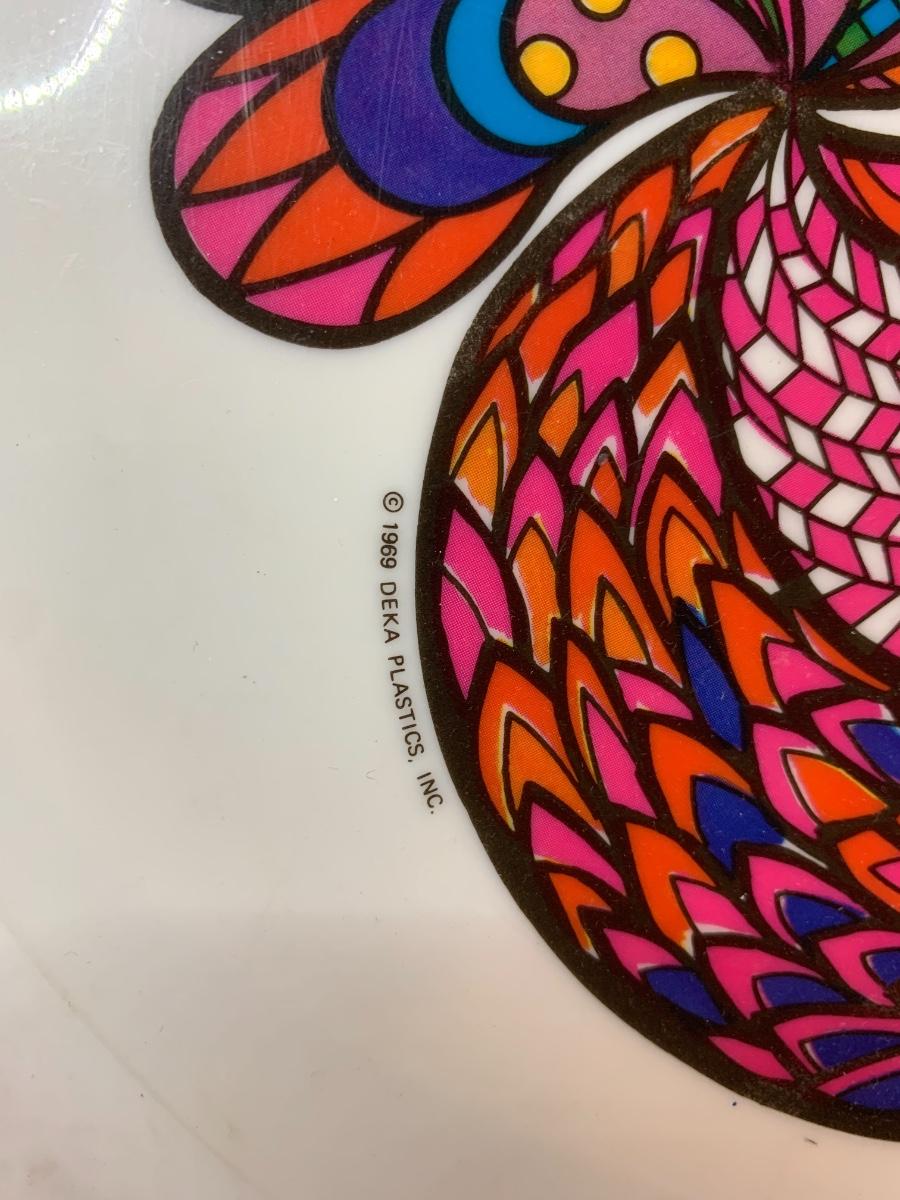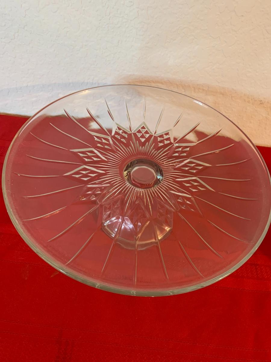 Glass serving ware (cake platter), glass catch all (some chips), 1969 Deka Plastics Bird Tray, and Senko Show-Pans Pot with no lid.