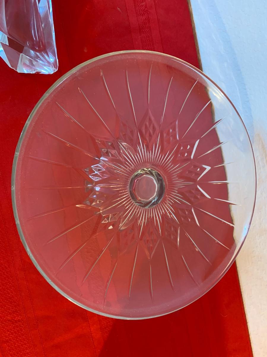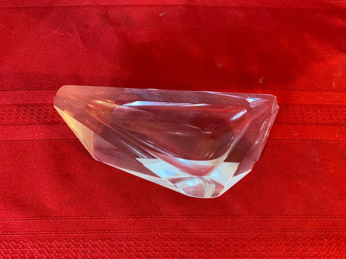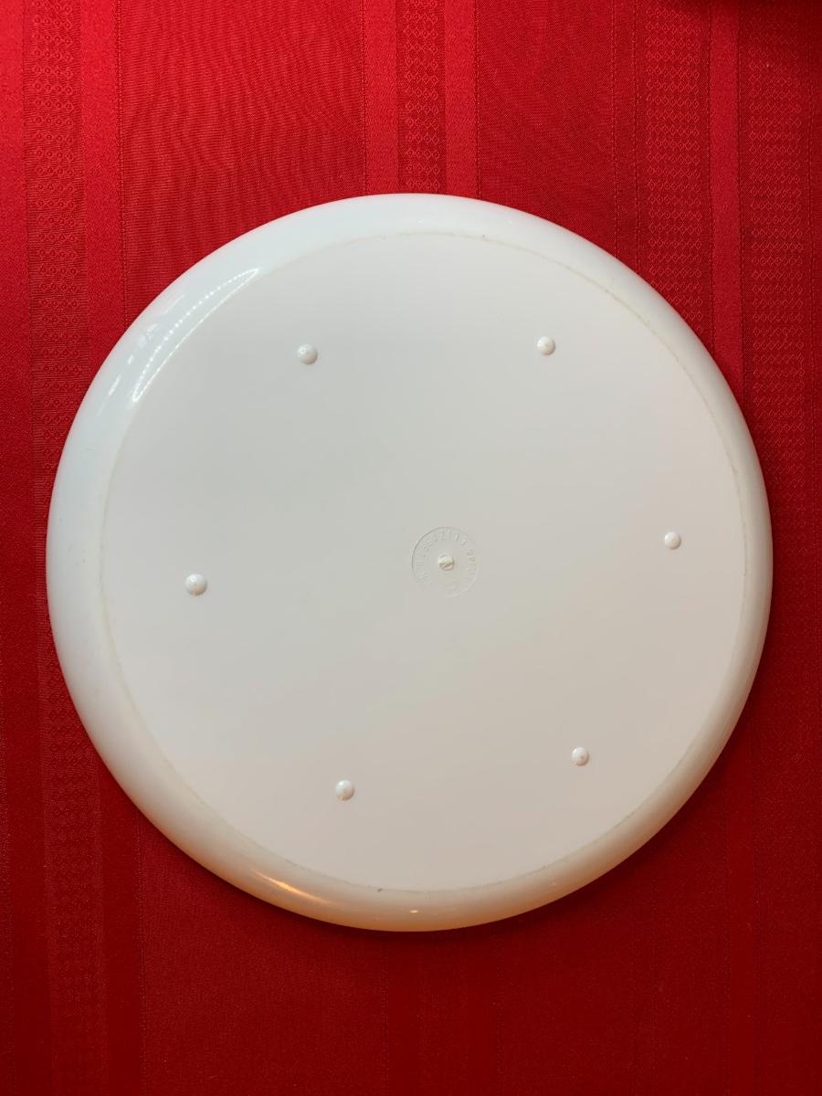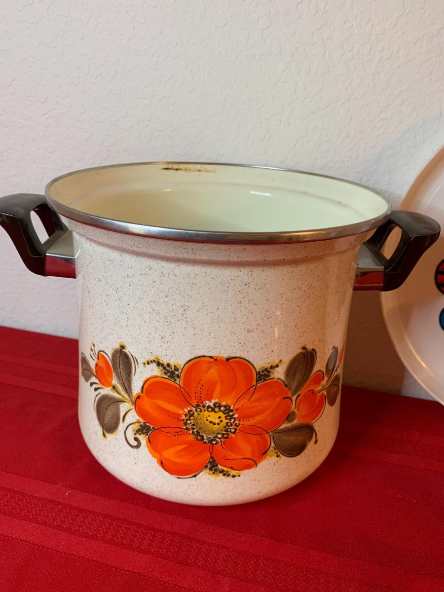 Glass serving ware (cake platter), glass catch all (some chips), 1969 Deka Plastics Bird Tray, and Senko Show-Pans Pot with no lid.