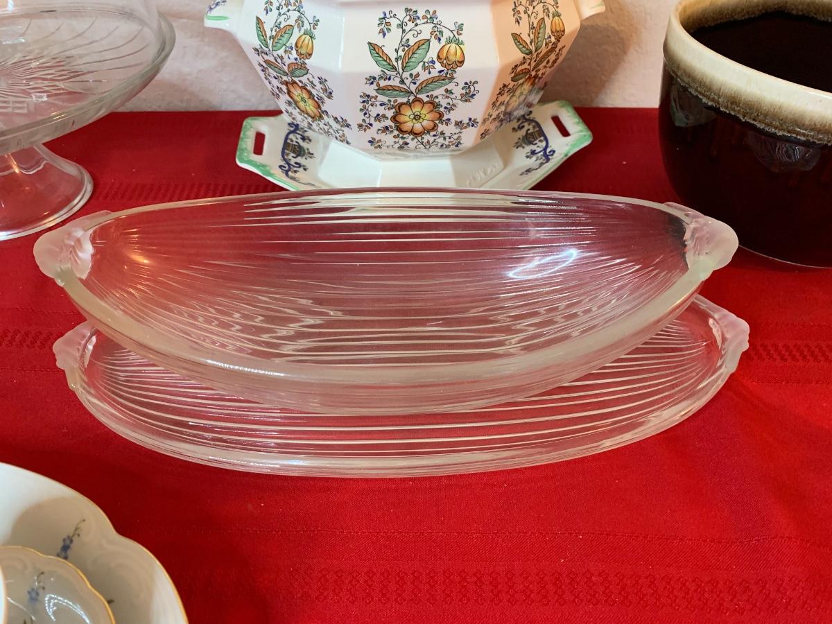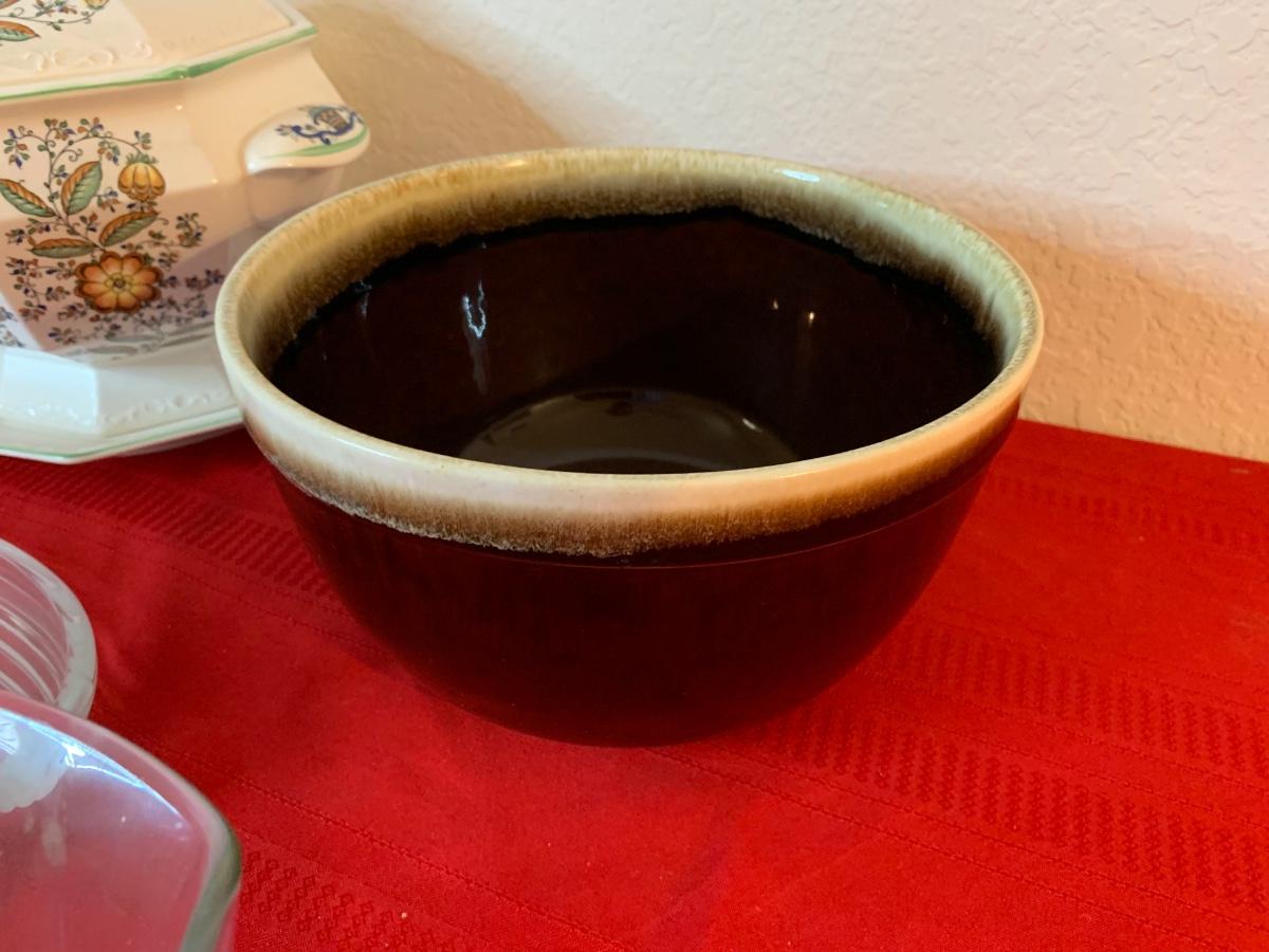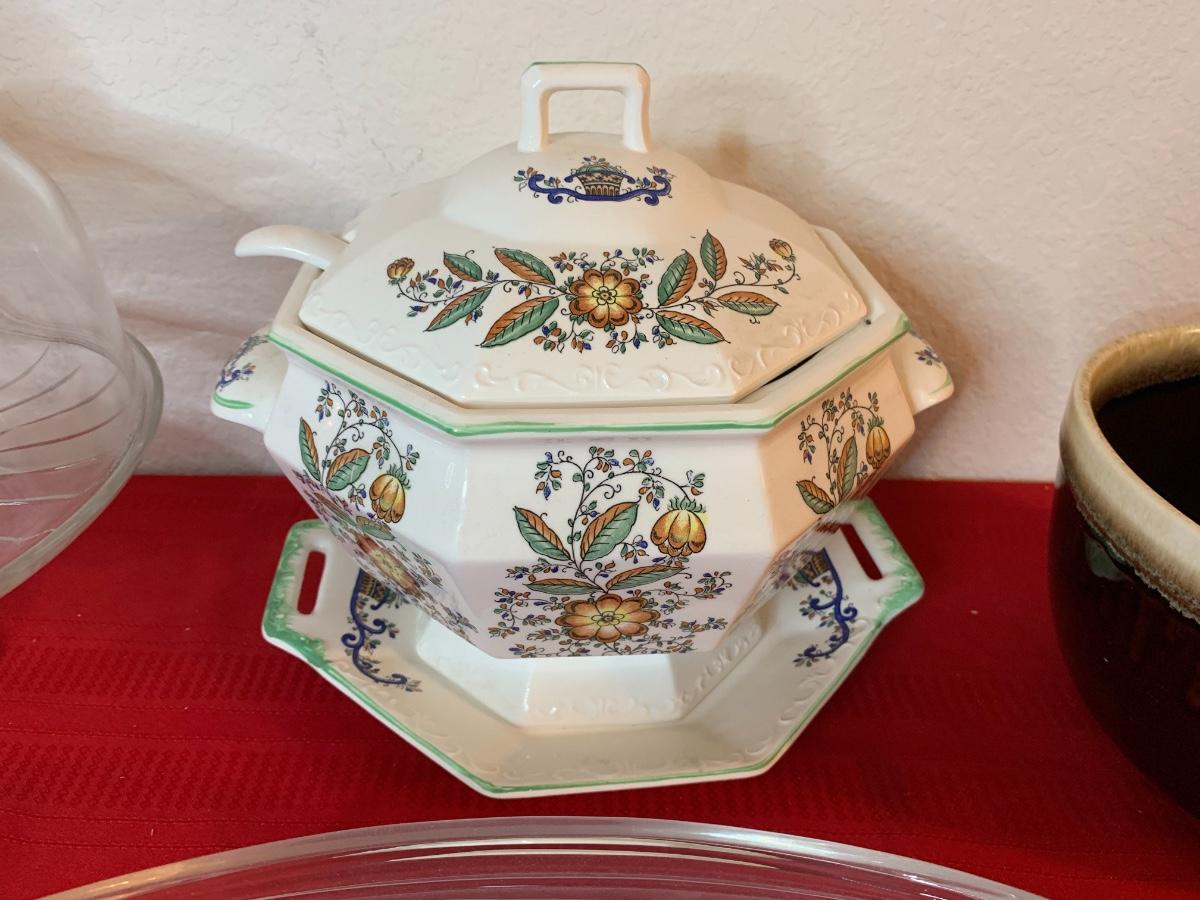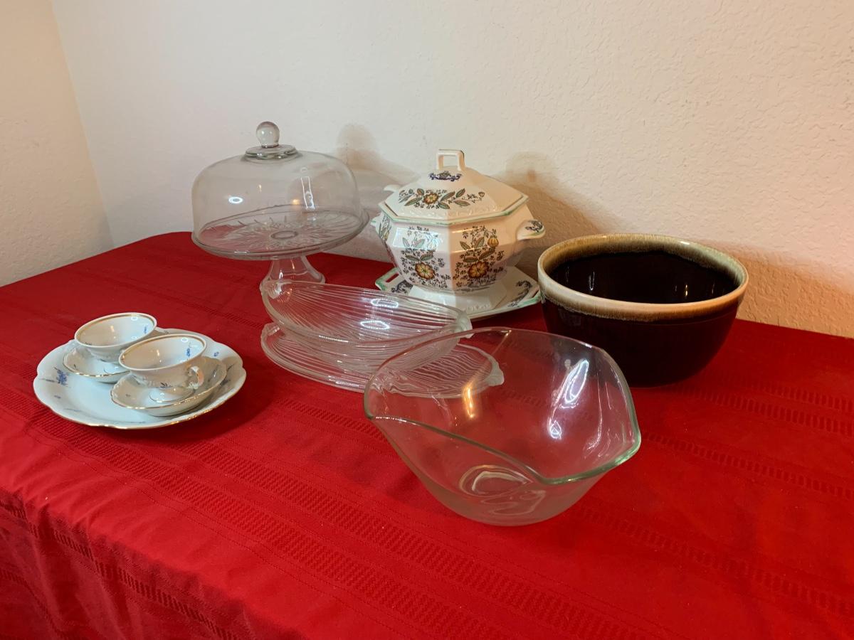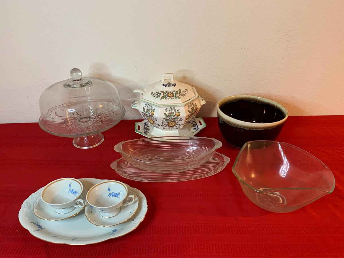 Ceramic Soup turine with ladle and plate (marked Japan), Pfaltzgraff brown pottery mixing bowl, clear glass cake pedestal with cover, glass serving bowls and a set of china with blue floral pattern made in Poland. Two boxes of China also included, unwrapped so not sure of all the pieces and quantity. All in good condition, no chips or cracks noted.