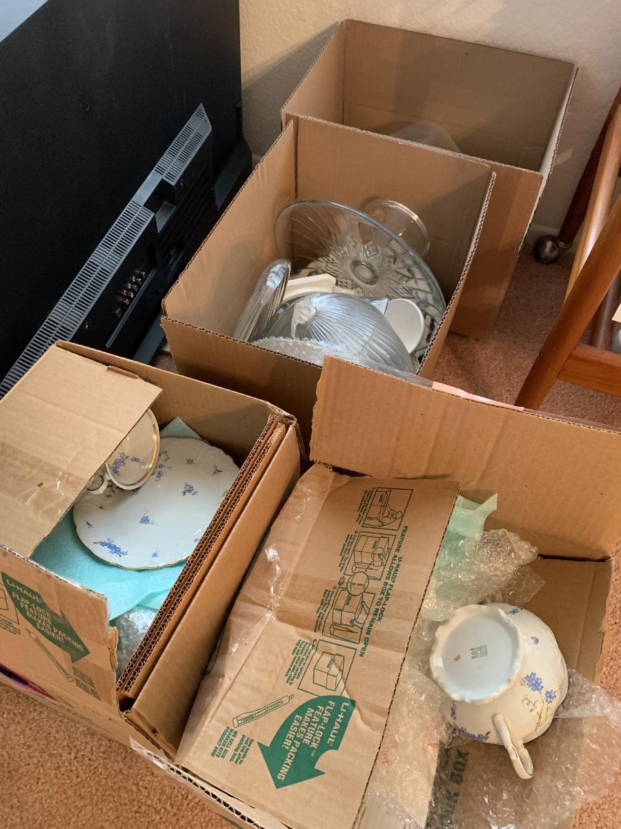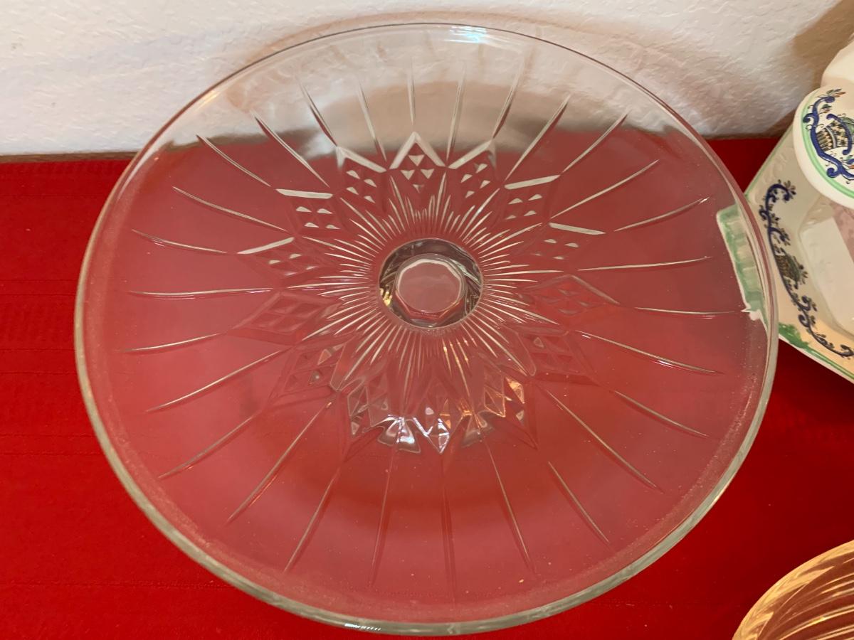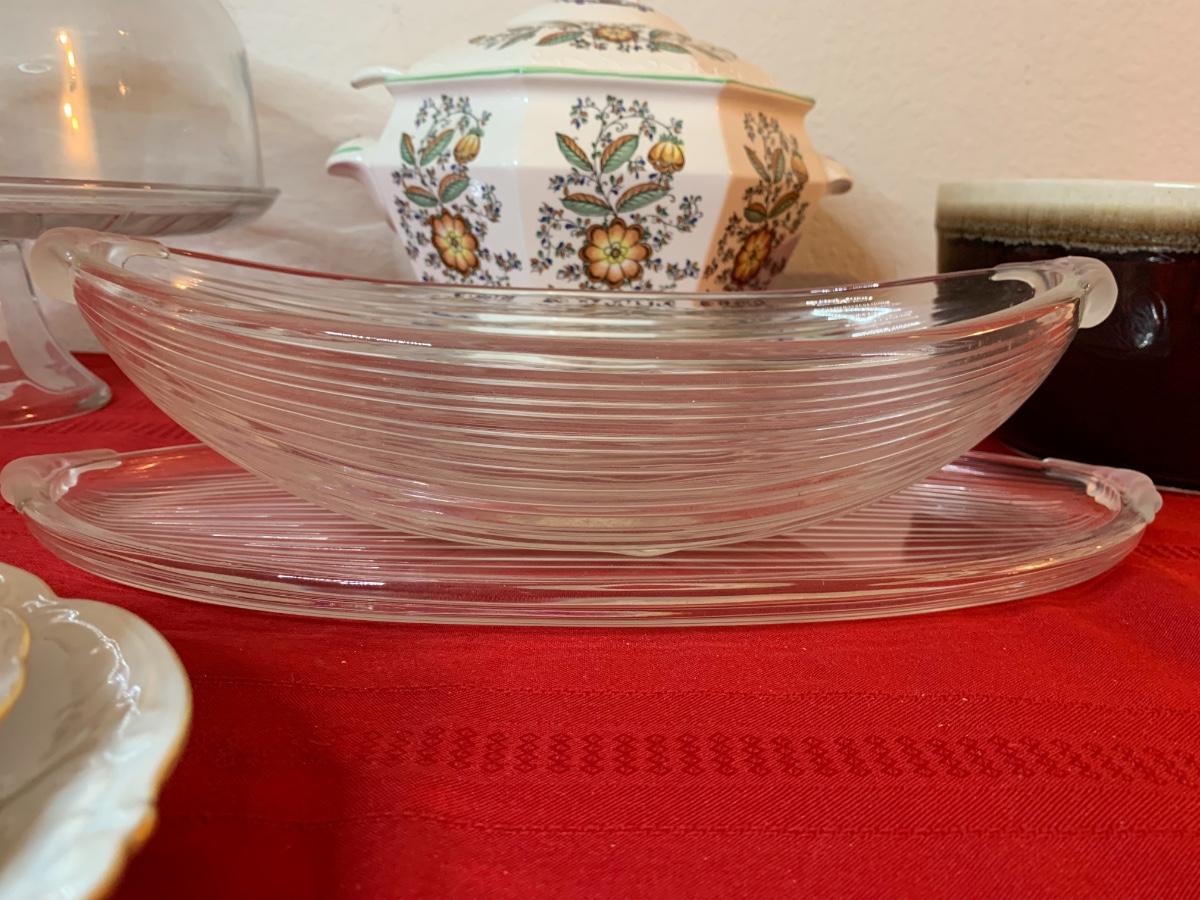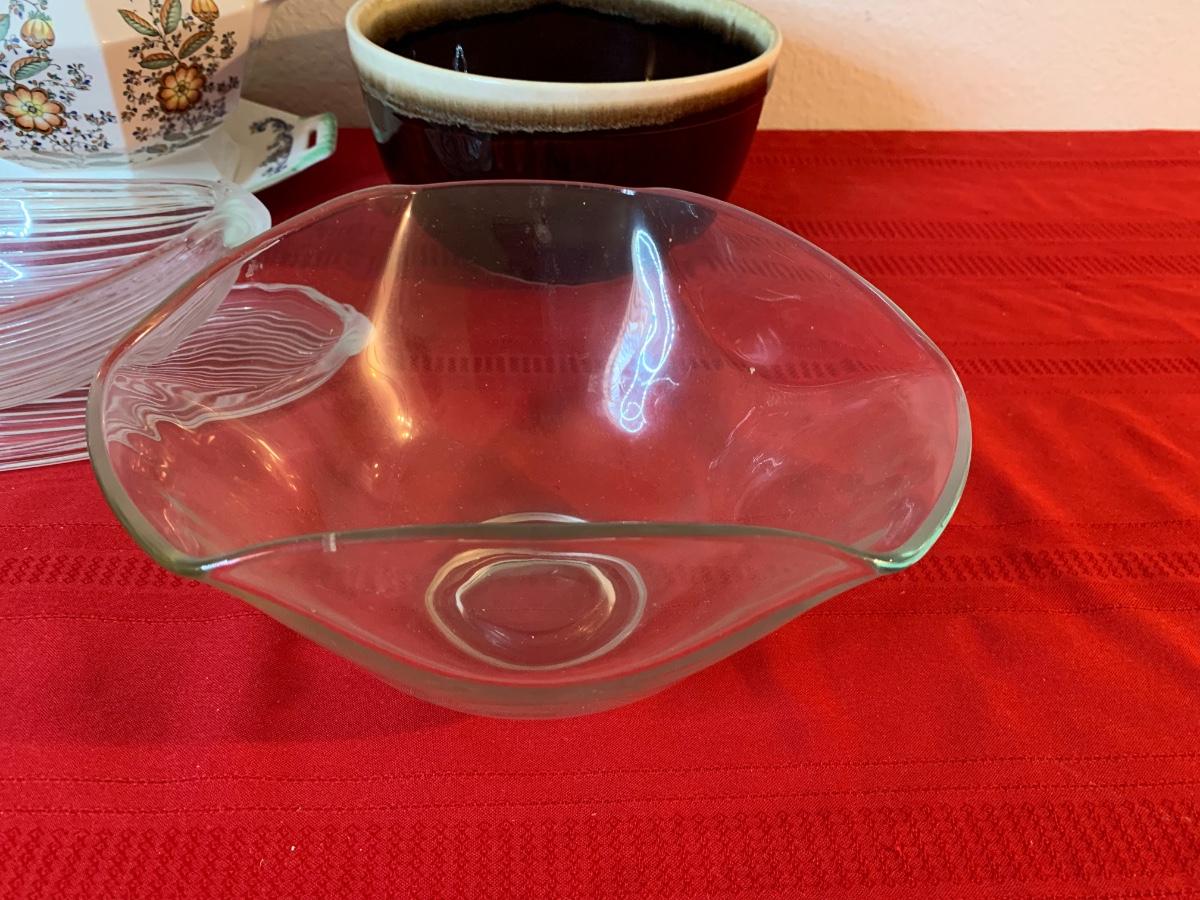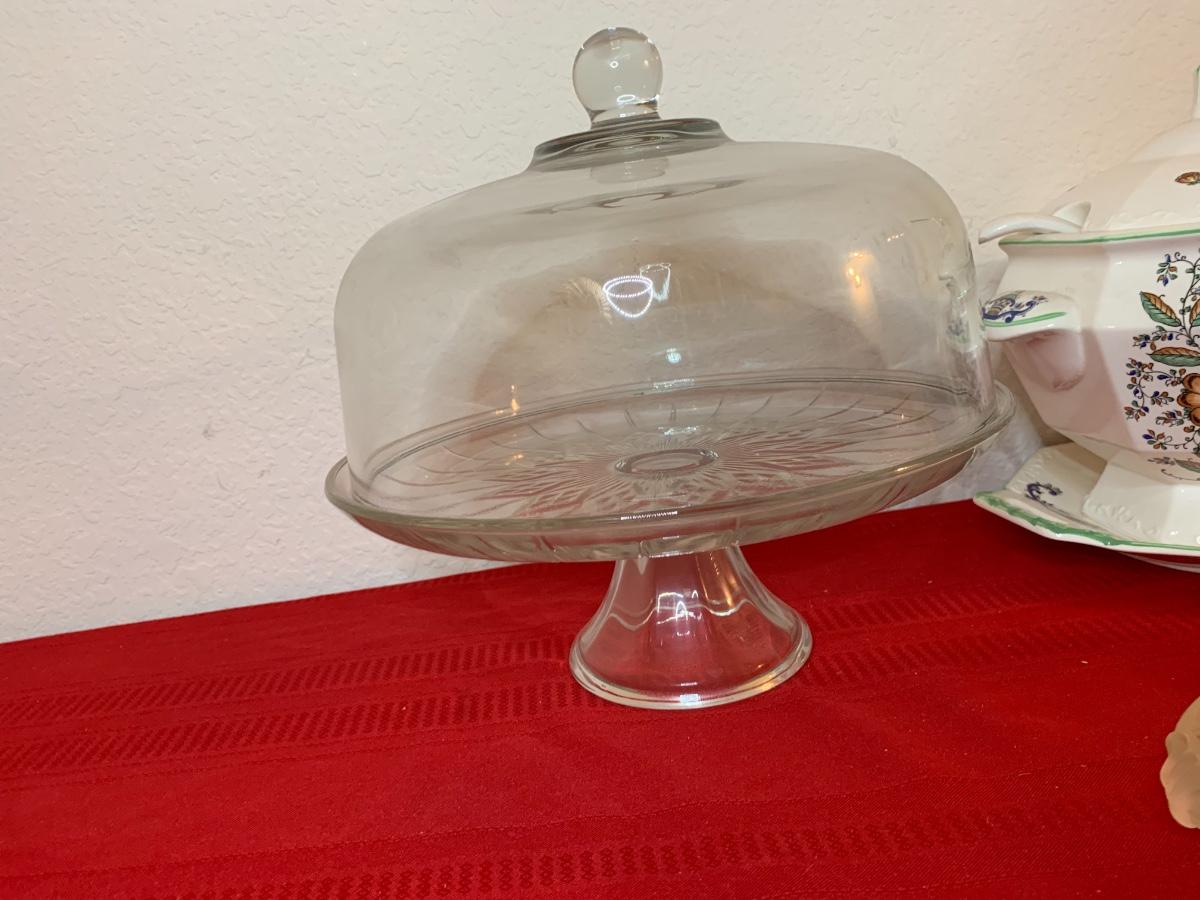 Ceramic Soup turine with ladle and plate (marked Japan), Pfaltzgraff brown pottery mixing bowl, clear glass cake pedestal with cover, glass serving bowls and a set of china with blue floral pattern made in Poland. Two boxes of China also included, unwrapped so not sure of all the pieces and quantity. All in good condition, no chips or cracks noted.
