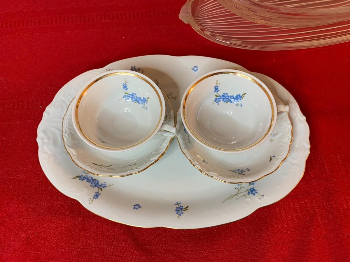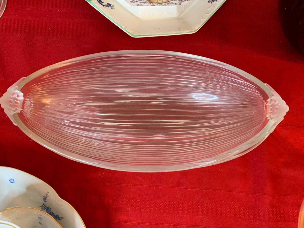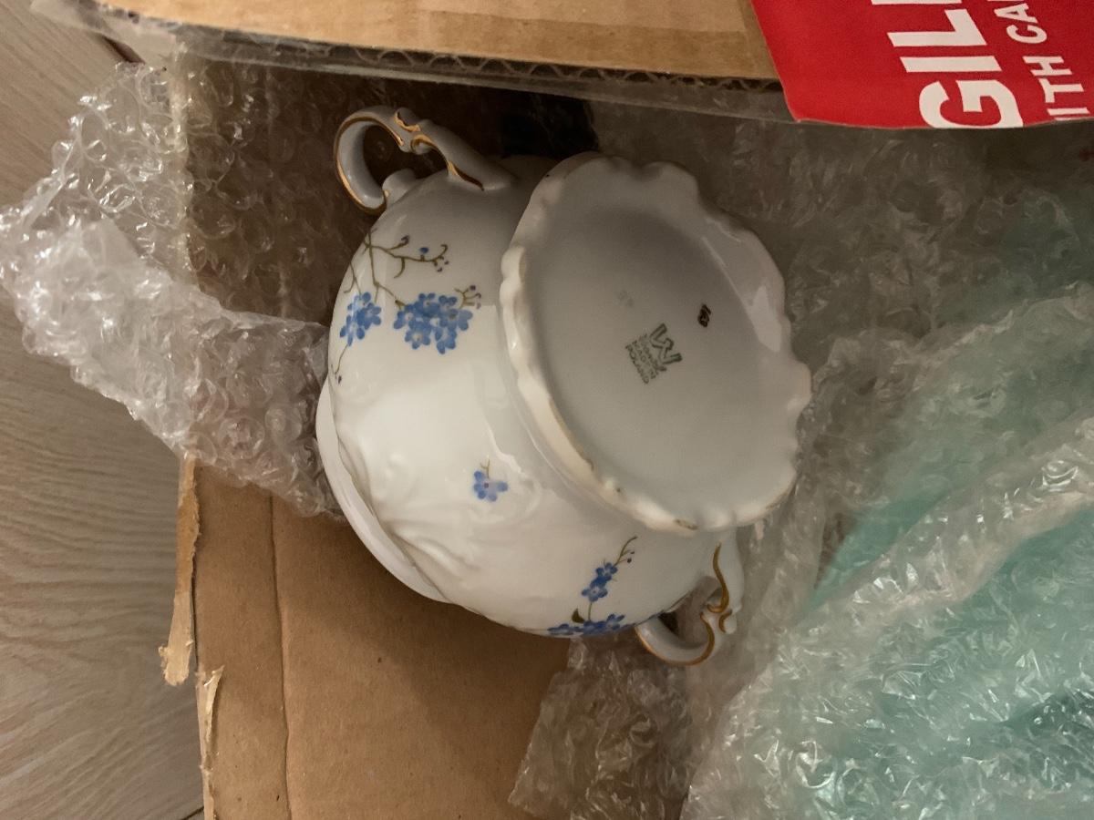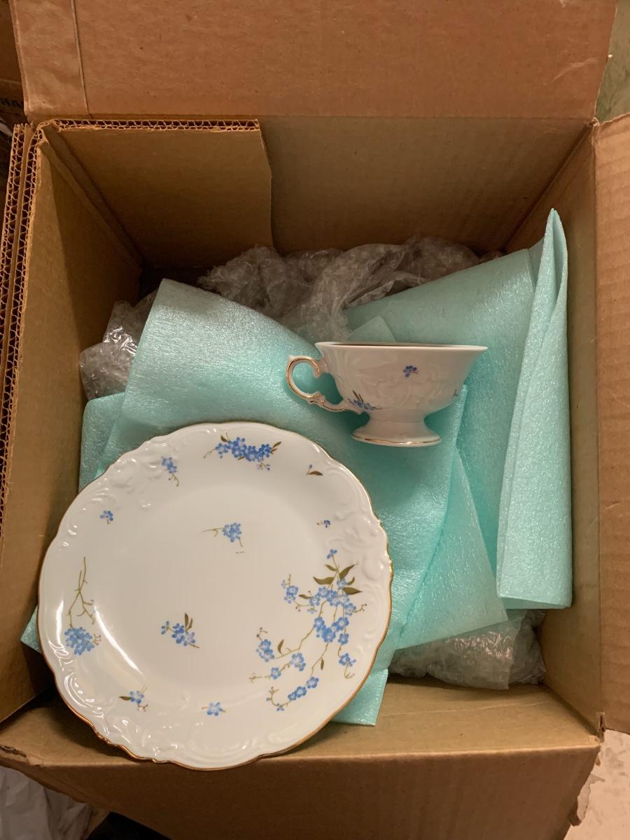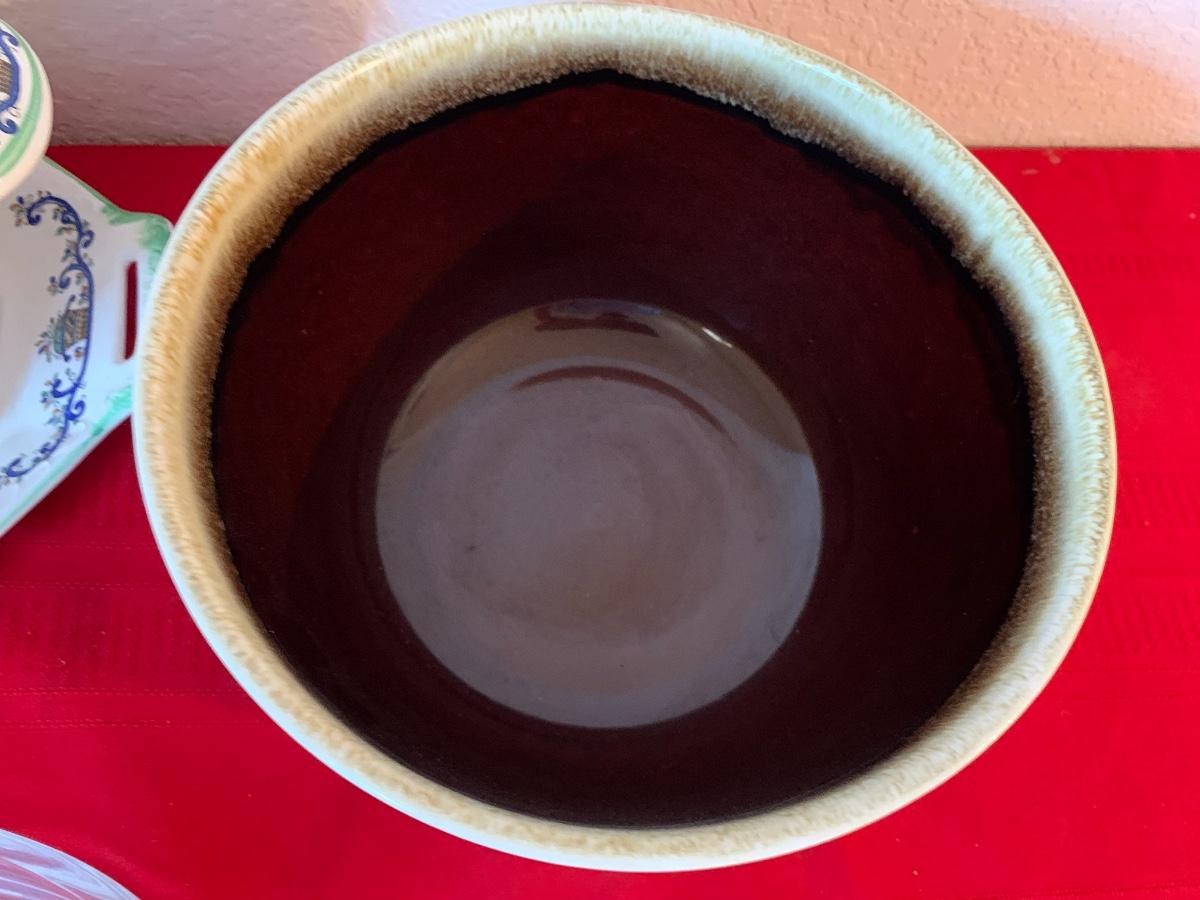Ceramic Soup turine with ladle and plate (marked Japan), Pfaltzgraff brown pottery mixing bowl, clear glass cake pedestal with cover, glass serving bowls and a set of china with blue floral pattern made in Poland. Two boxes of China also included, unwrapped so not sure of all the pieces and quantity. All in good condition, no chips or cracks noted.