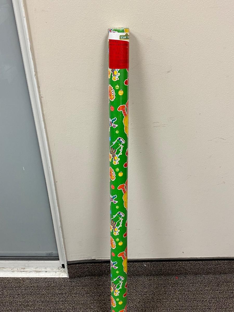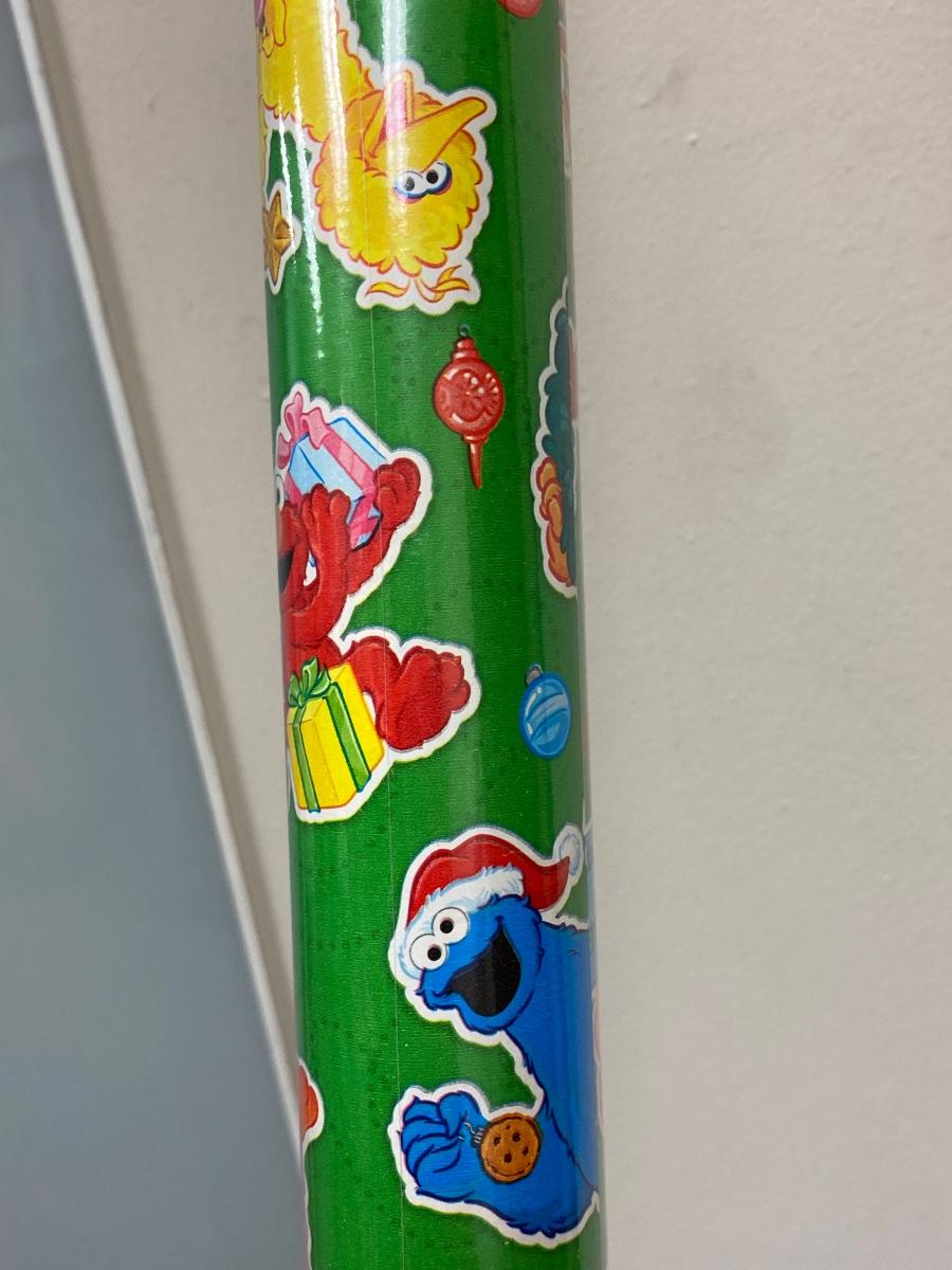 Unopened roll of Sesame Street Christmas holiday wrapping paper. Has everyone's favorite characters on it.