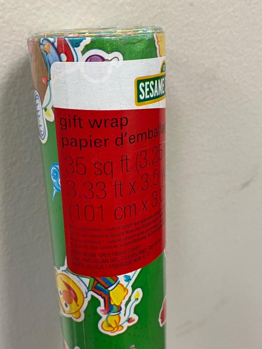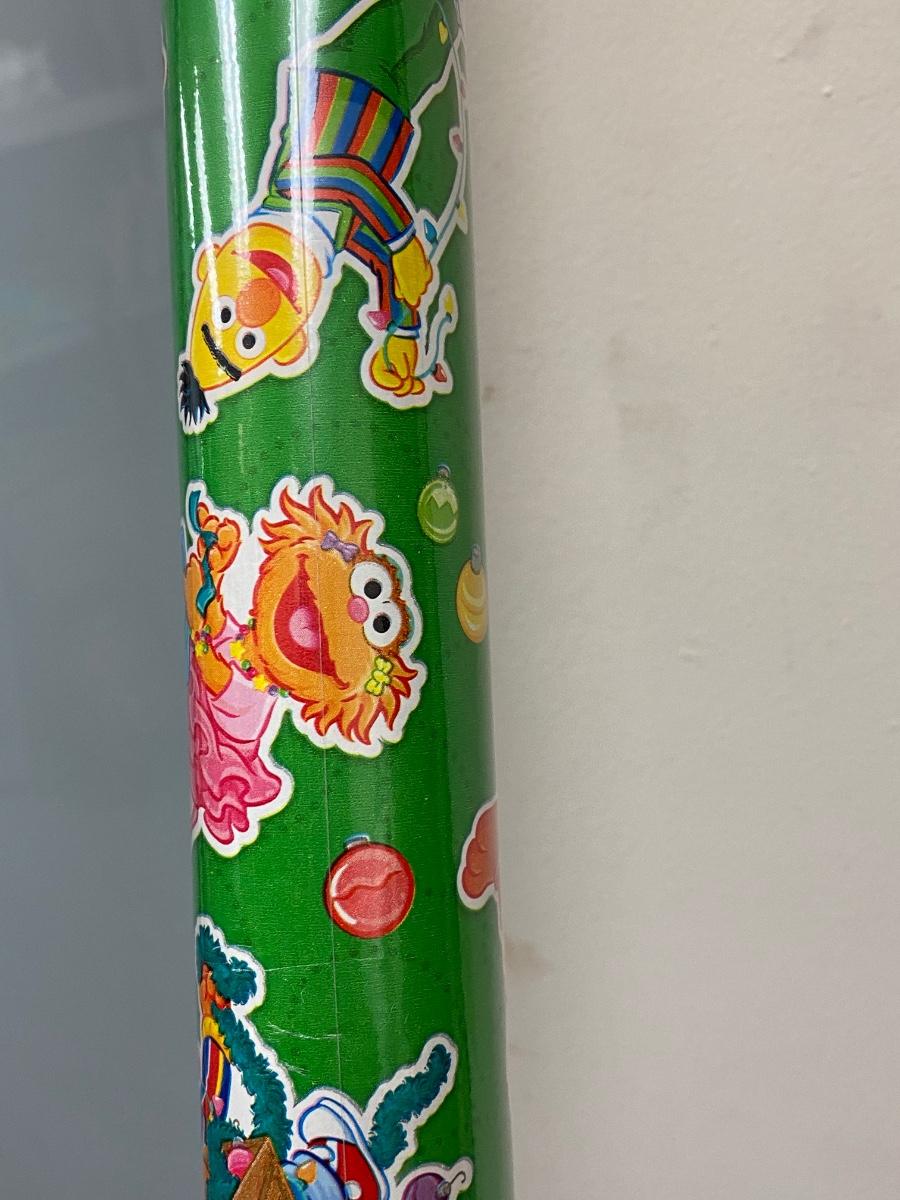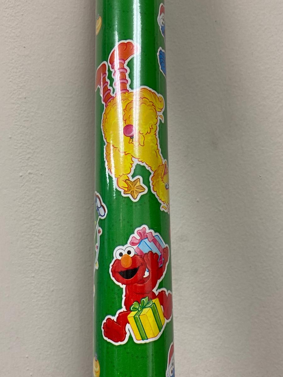 Unopened roll of Sesame Street Christmas holiday wrapping paper. Has everyone's favorite characters on it.