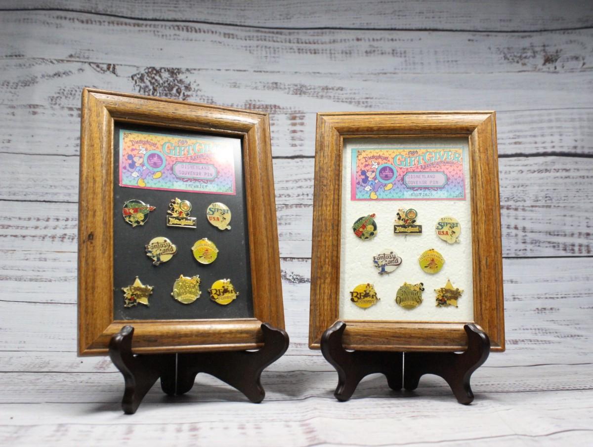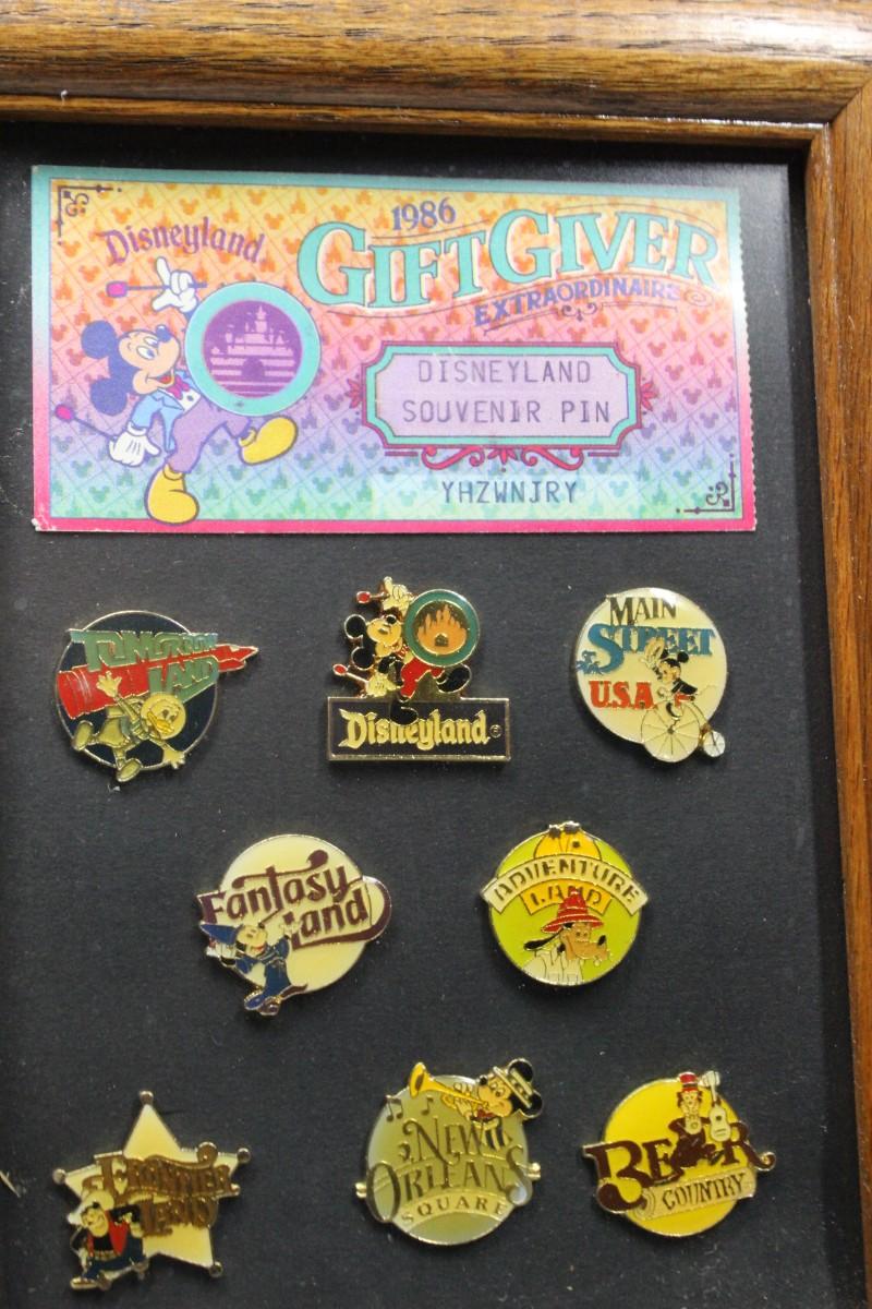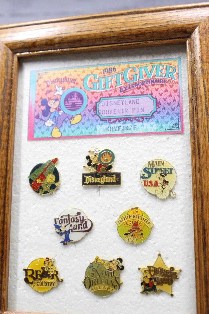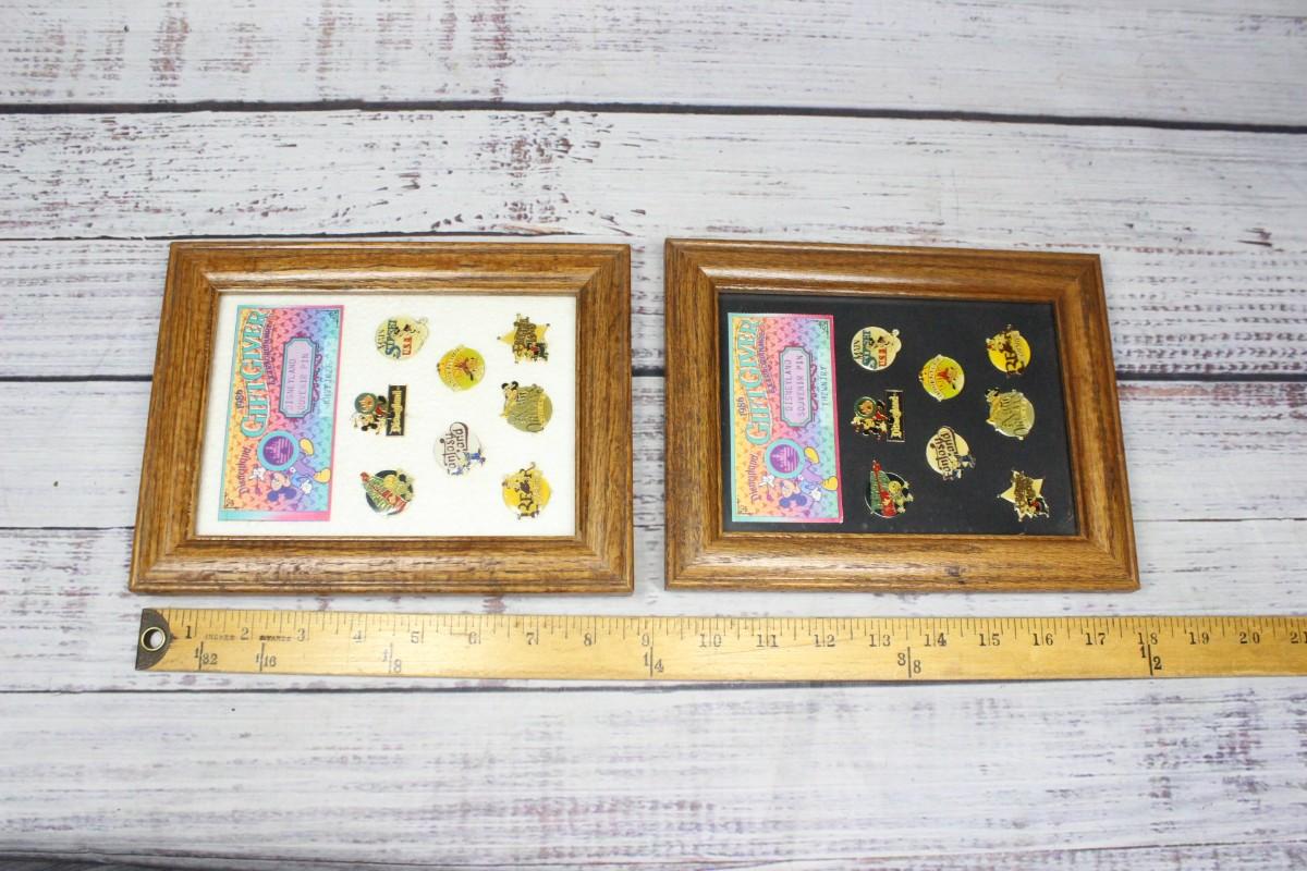 Vintage Pair of Framed Disneyland's 30th Anniversary Gift Giver Collectible Pins & Tickets Set 3, comes with two complete Disney Gift Giver Pin lots framed with their ticket. These pins were given to guests at the Disneyland Park. There is no damage to the frame or protective glass, check pictures for more details and for sizing. The white background is foam core that was used to mount the pins in place.