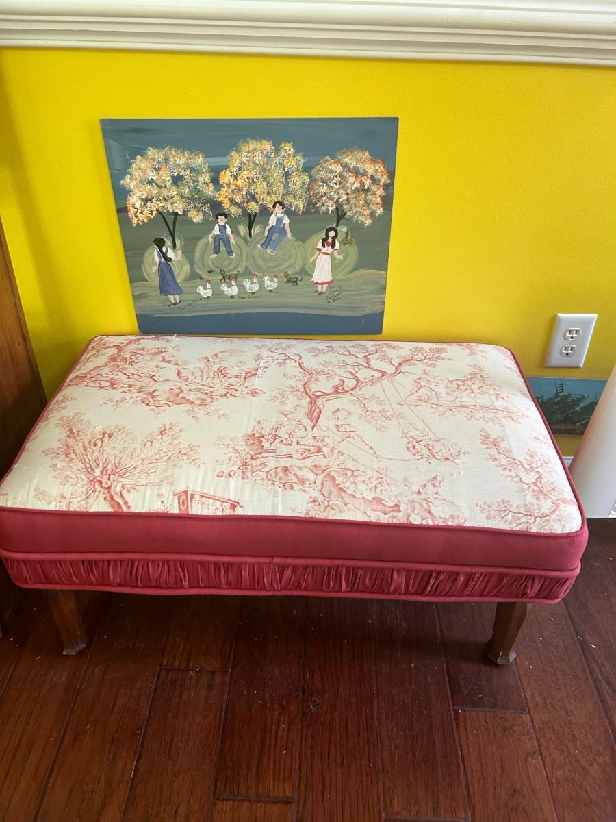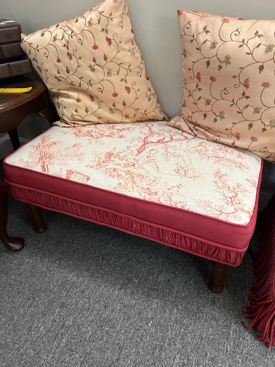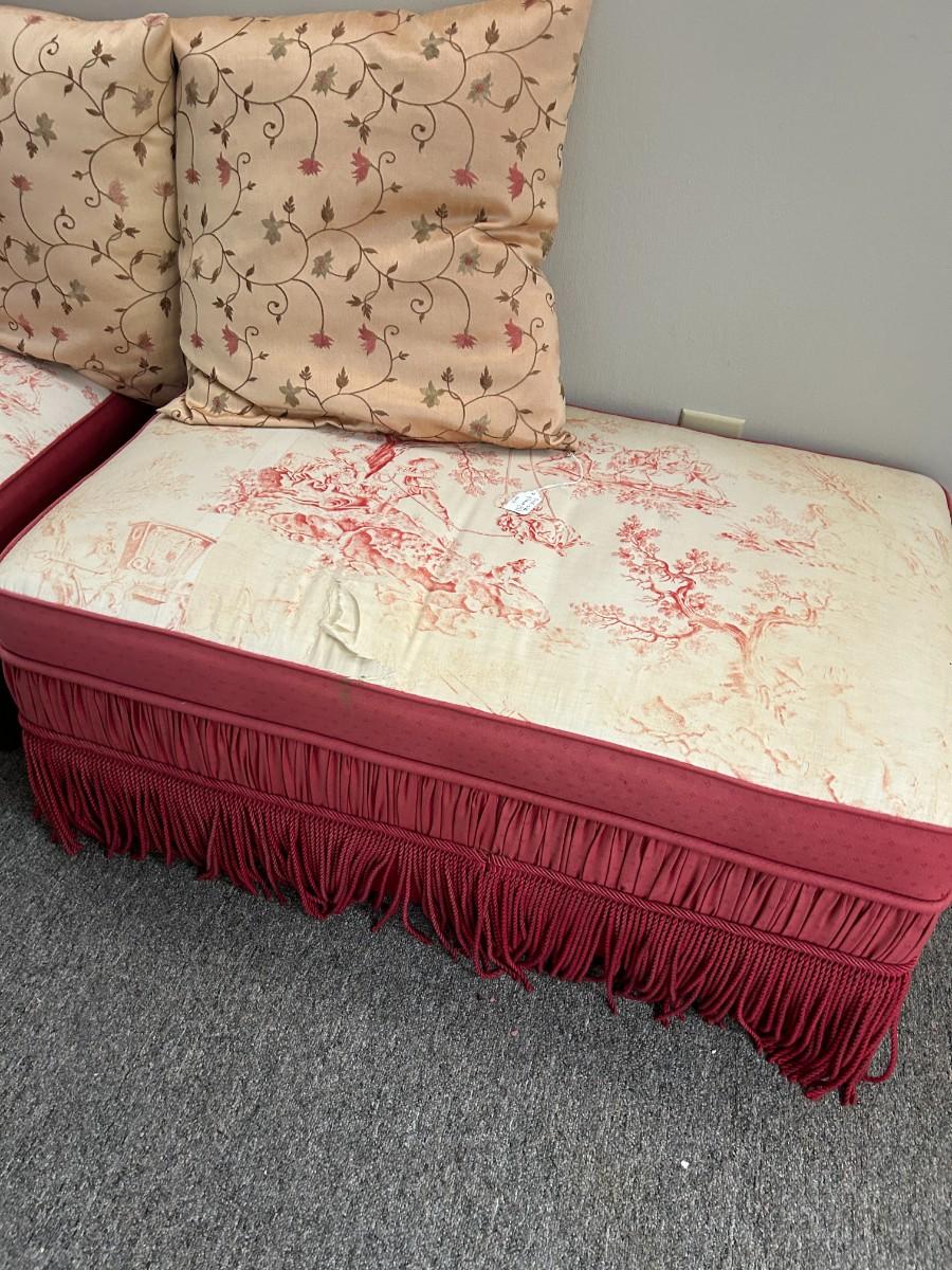 Rectangular ottomans (3) covered in red and white victorian patterned material. One piece has wheels with floor length fringe. The other two ottomans have wooden legs, no wheels. Material torn/worn in places, as is. Can be purchased individually for $30