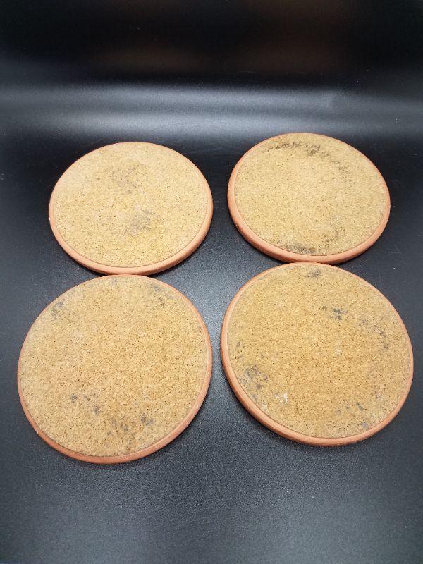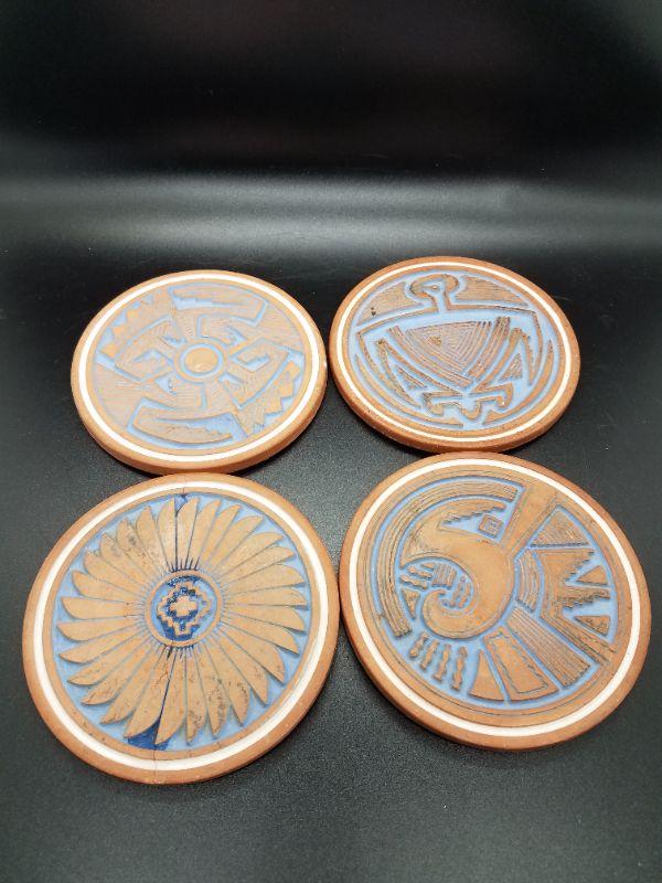 Mexico? design coasters, cork bottoms. One has crack down center with evidence of glue.