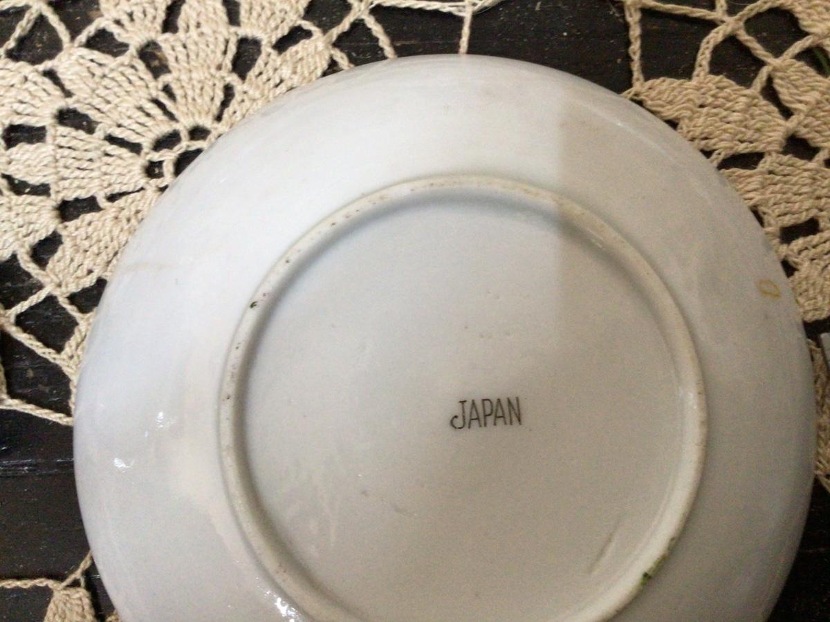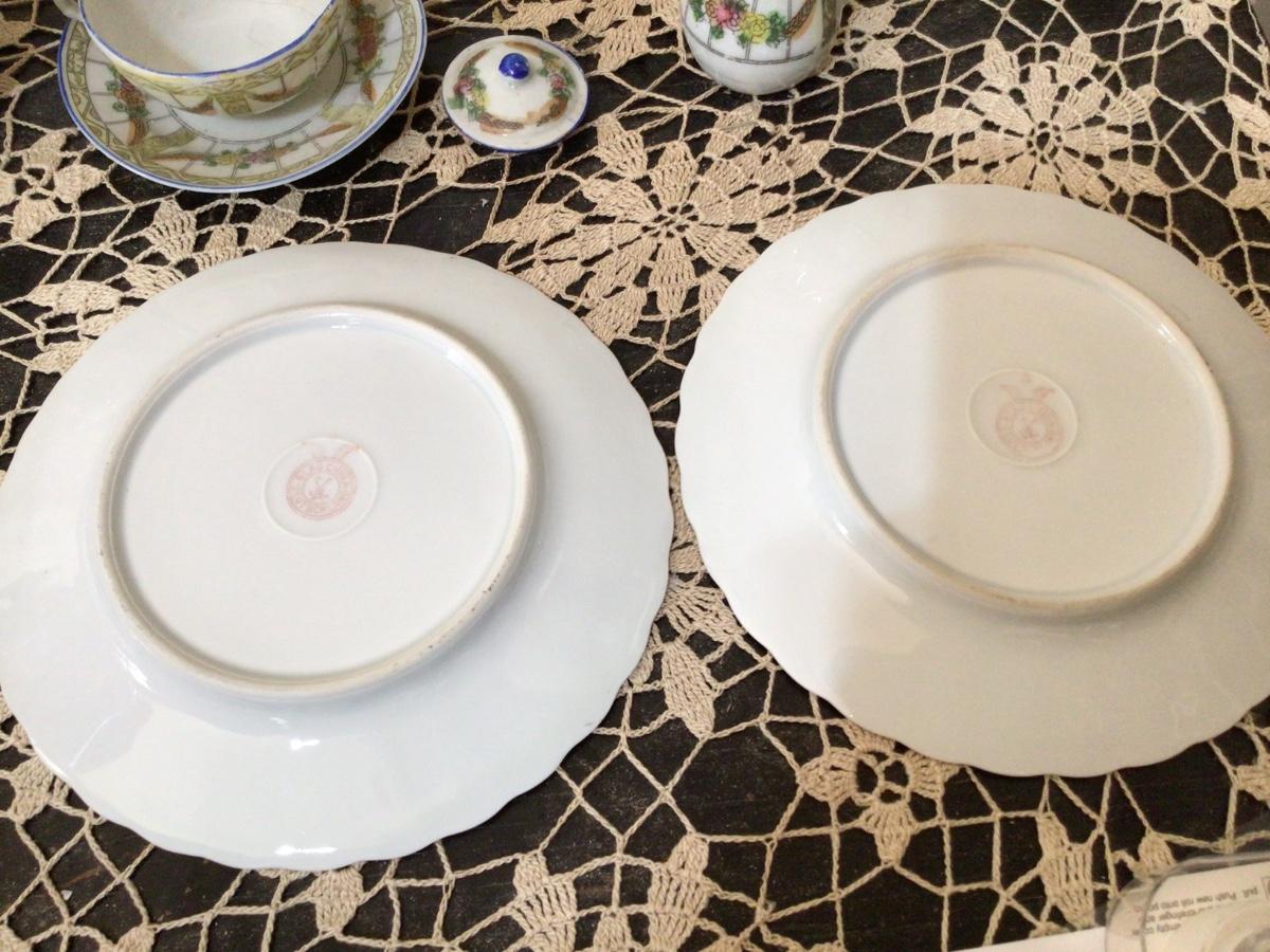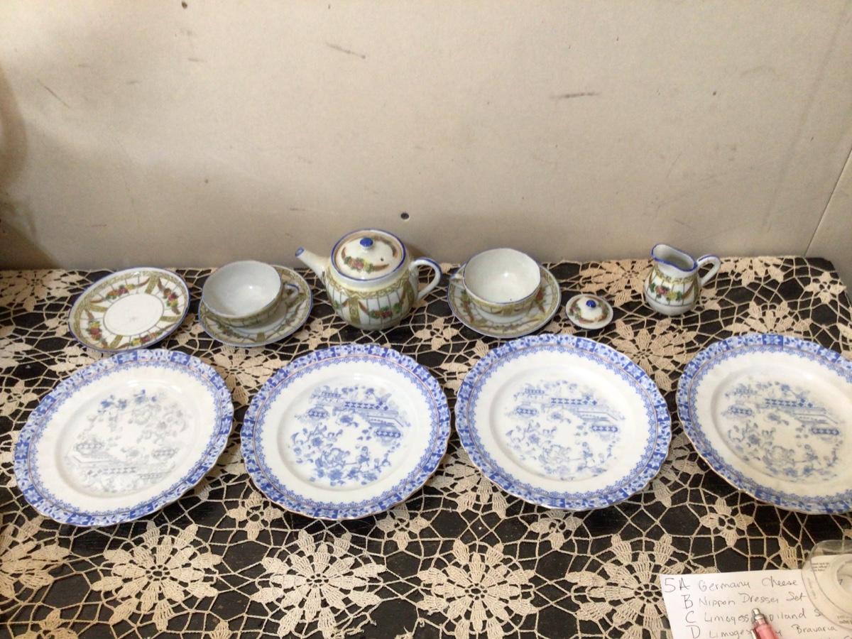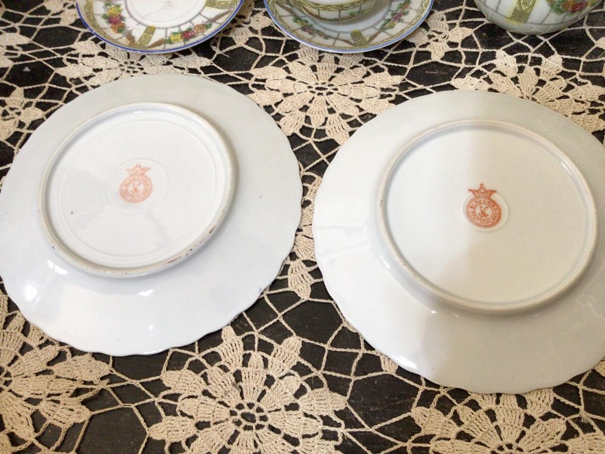 You get 4 Duetschland bread plates, some the pattern has fadding (see pic) and a child mini tea set. Made in Japan you get tea pot two cups and saucers, plate.
