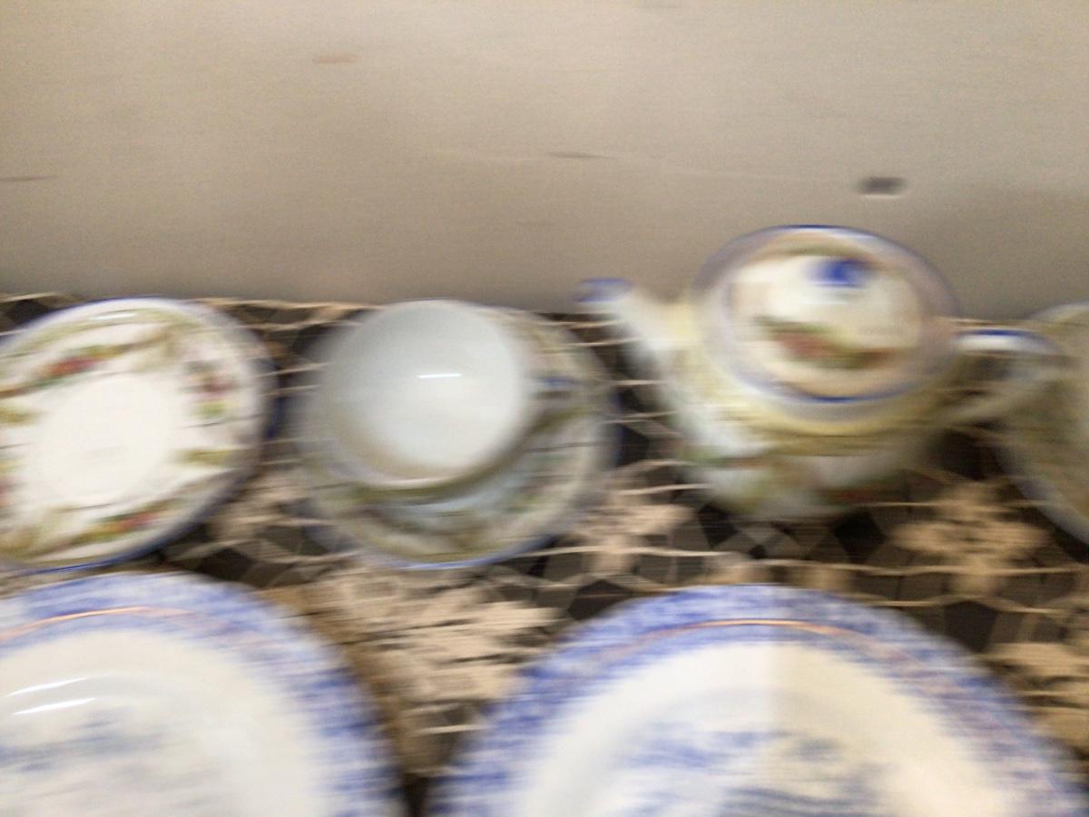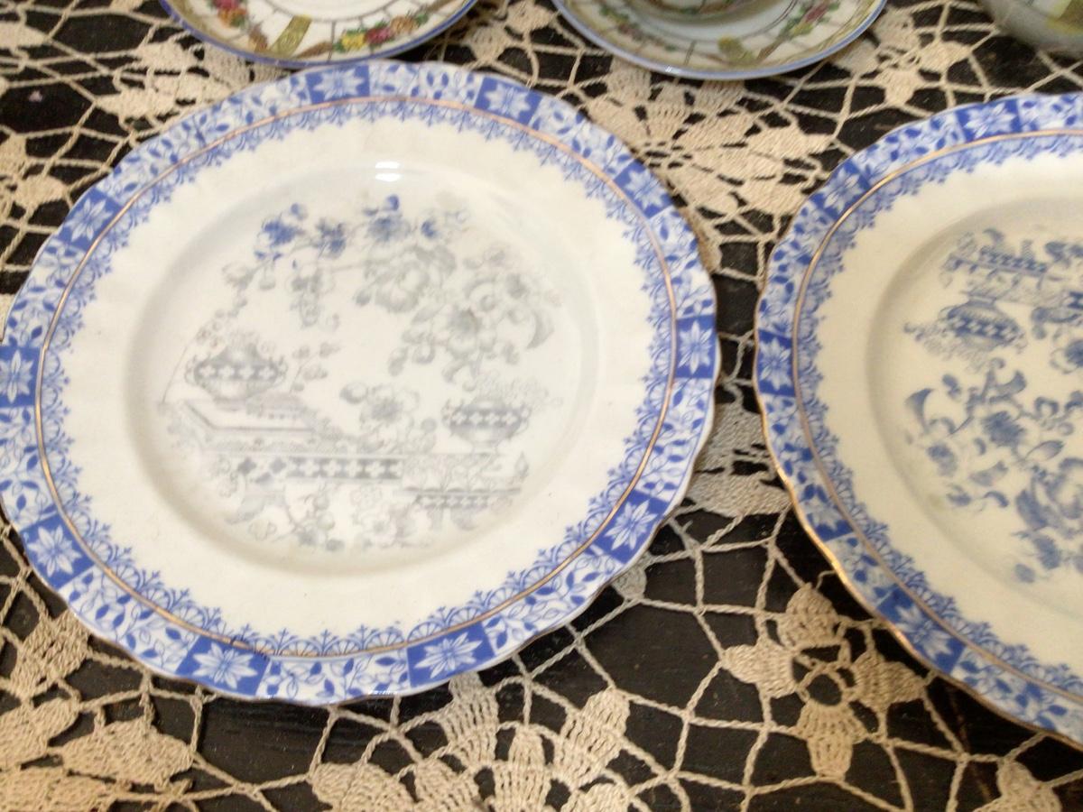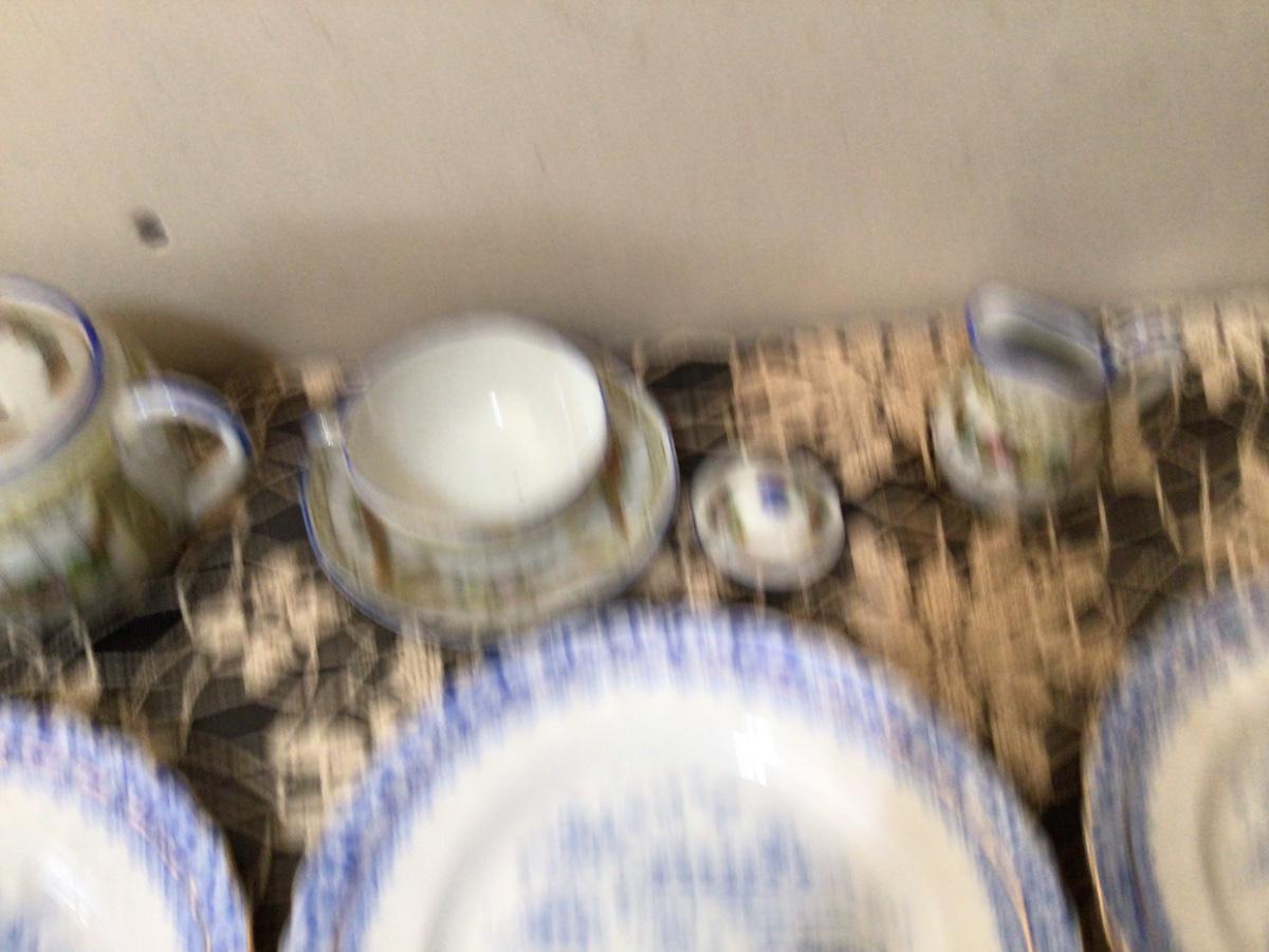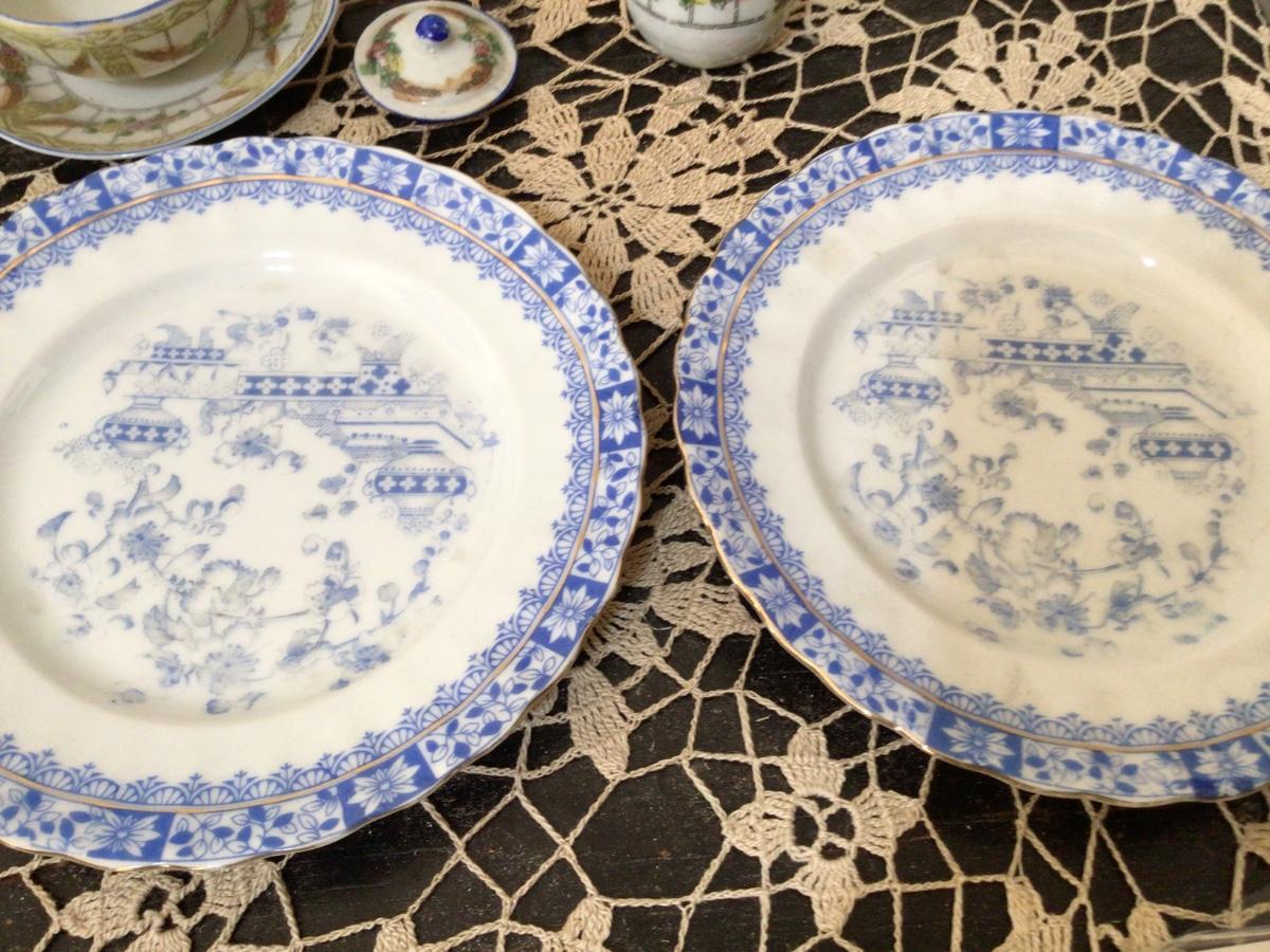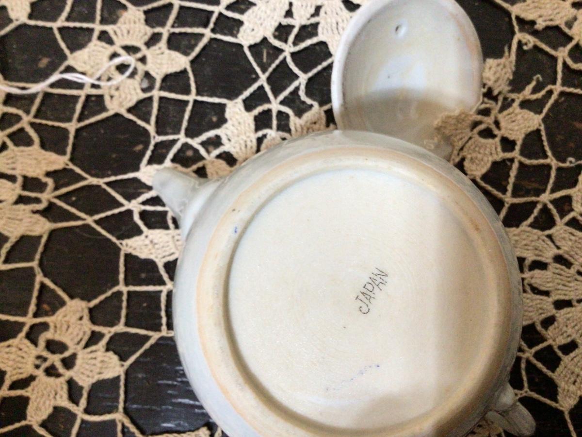 You get 4 Duetschland bread plates, some the pattern has fadding (see pic) and a child mini tea set. Made in Japan you get tea pot two cups and saucers, plate.
