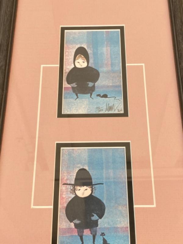 Set of 2 prints, framed by P. Buckley Moss, limited and signed. Amish or Menonite dressed in black boy and girl w/ black cat