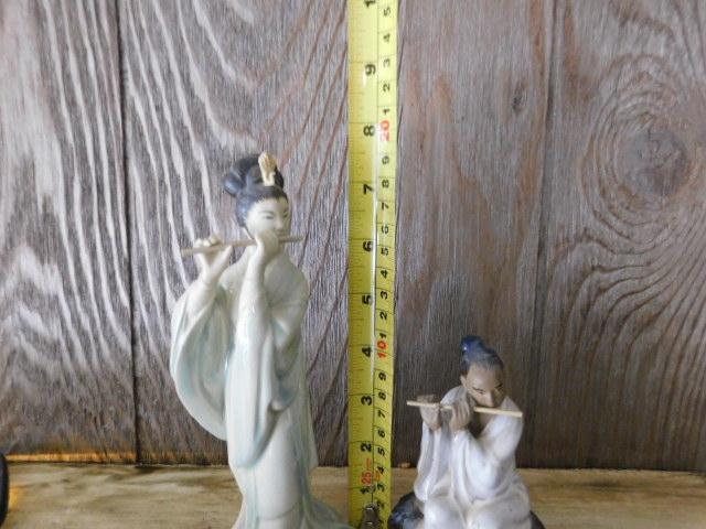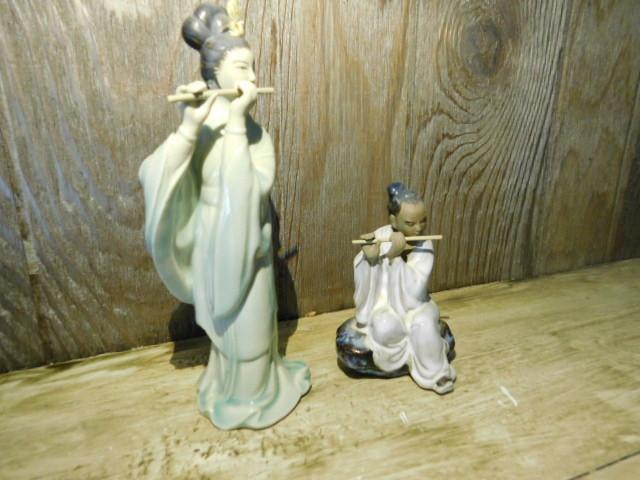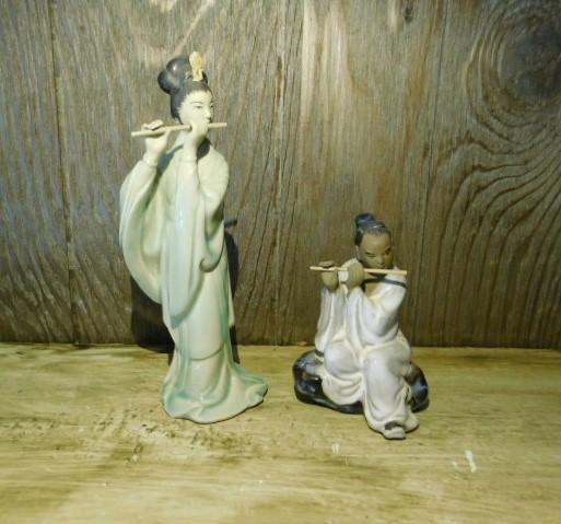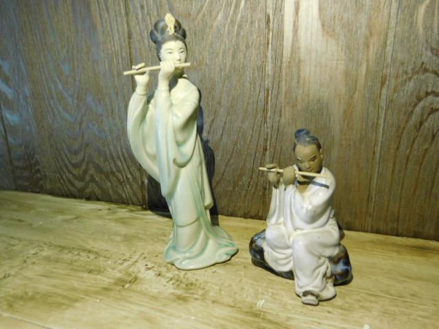 Set Asian Mudmen and Geisha Porcelain Figurines Playing Bamboo Flute