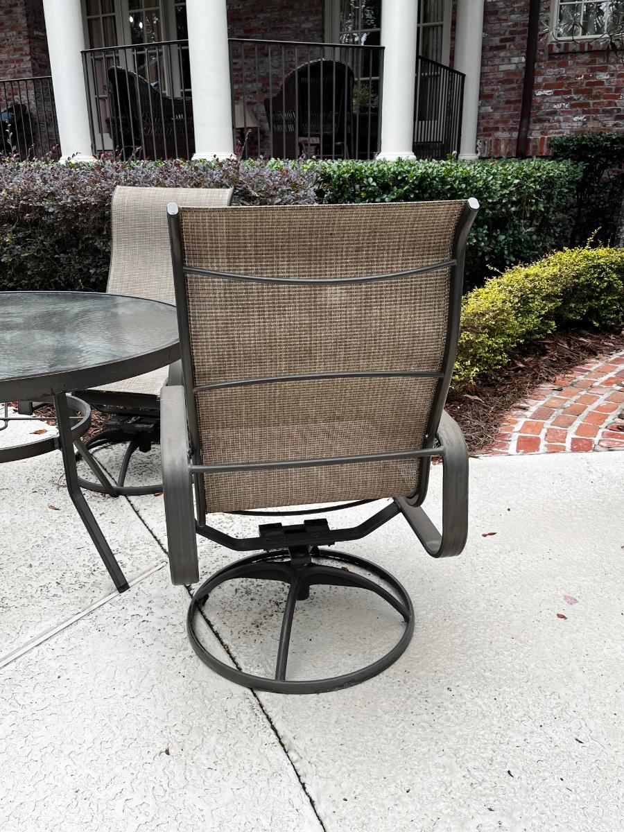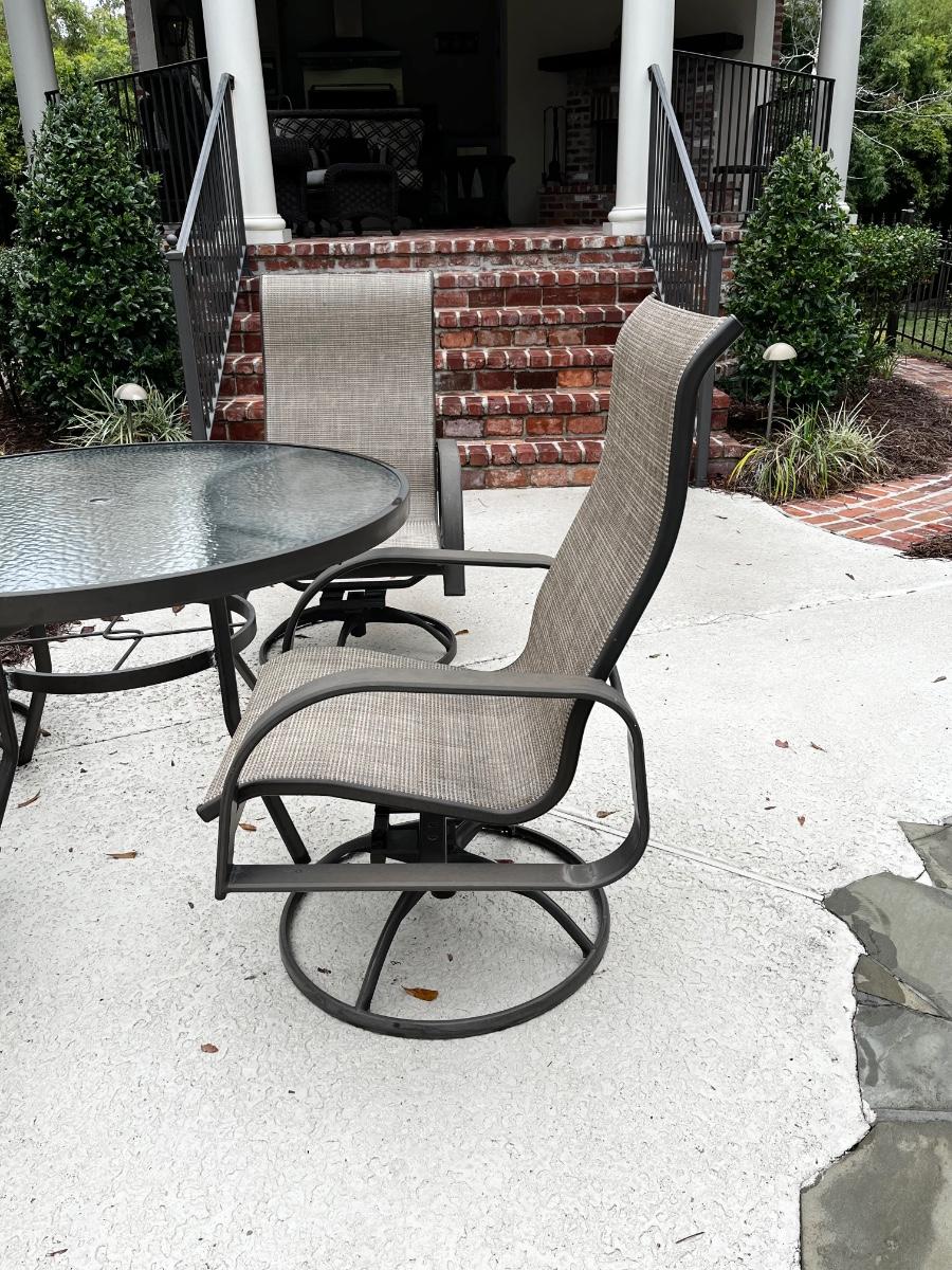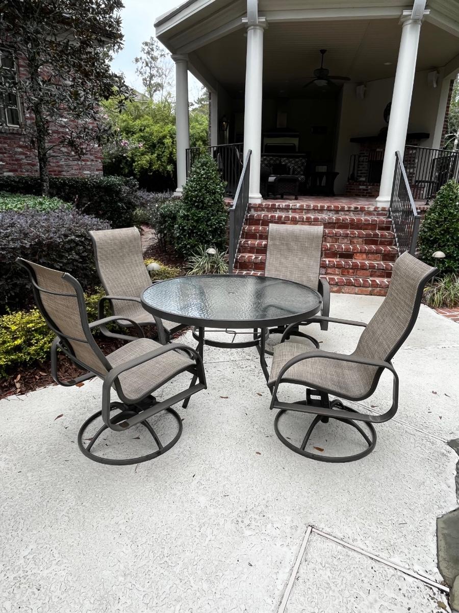Table = 28” H x 48” round ~ 4 chairs = 42.5” H x 26” W x 26” D ~ chairs swivel & rock ~